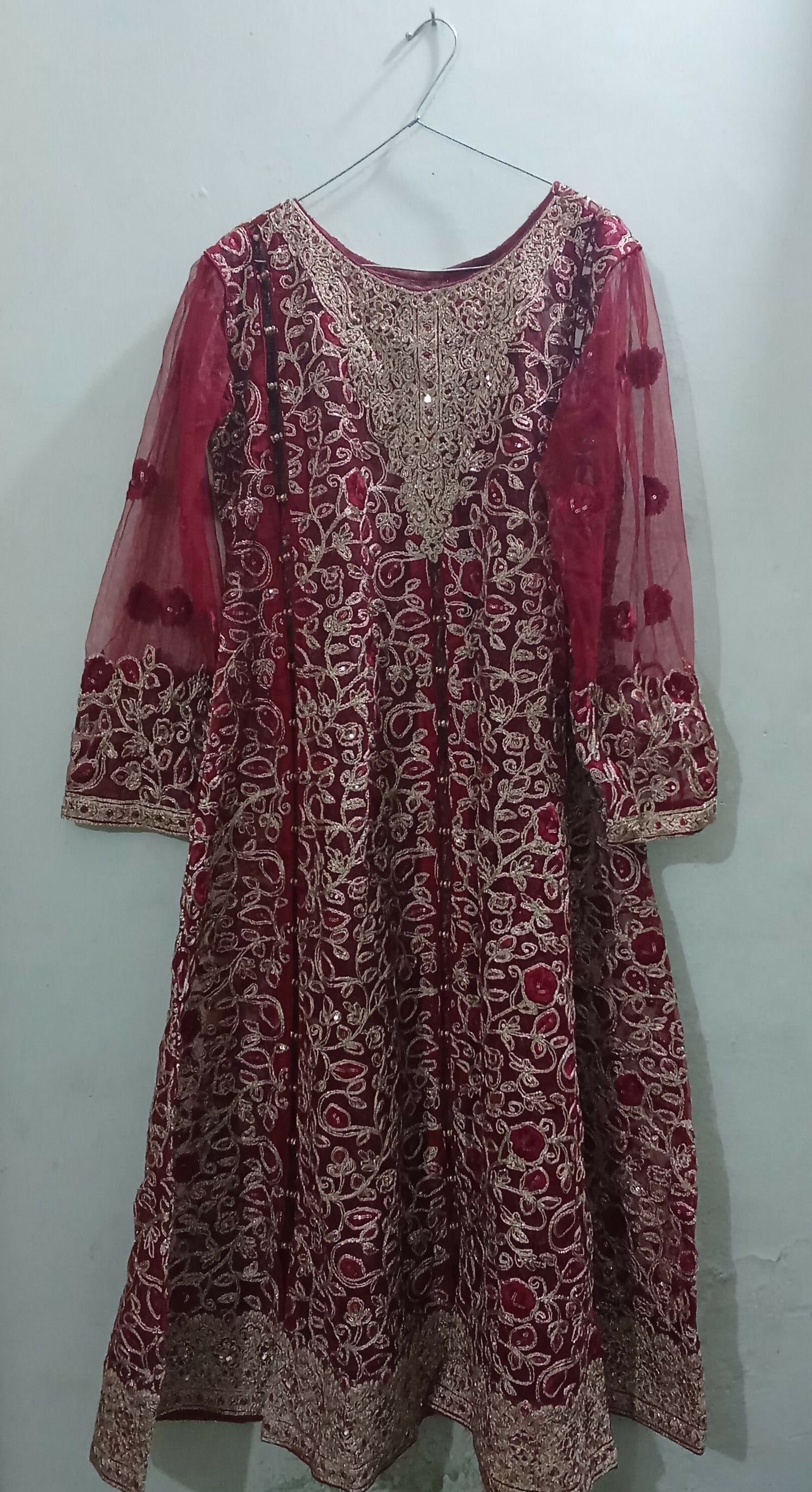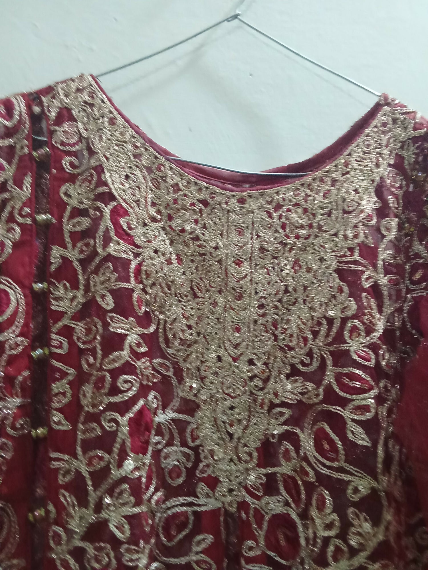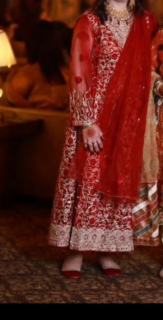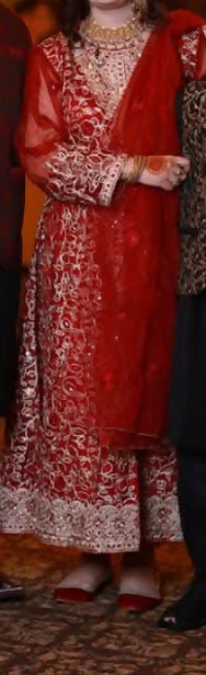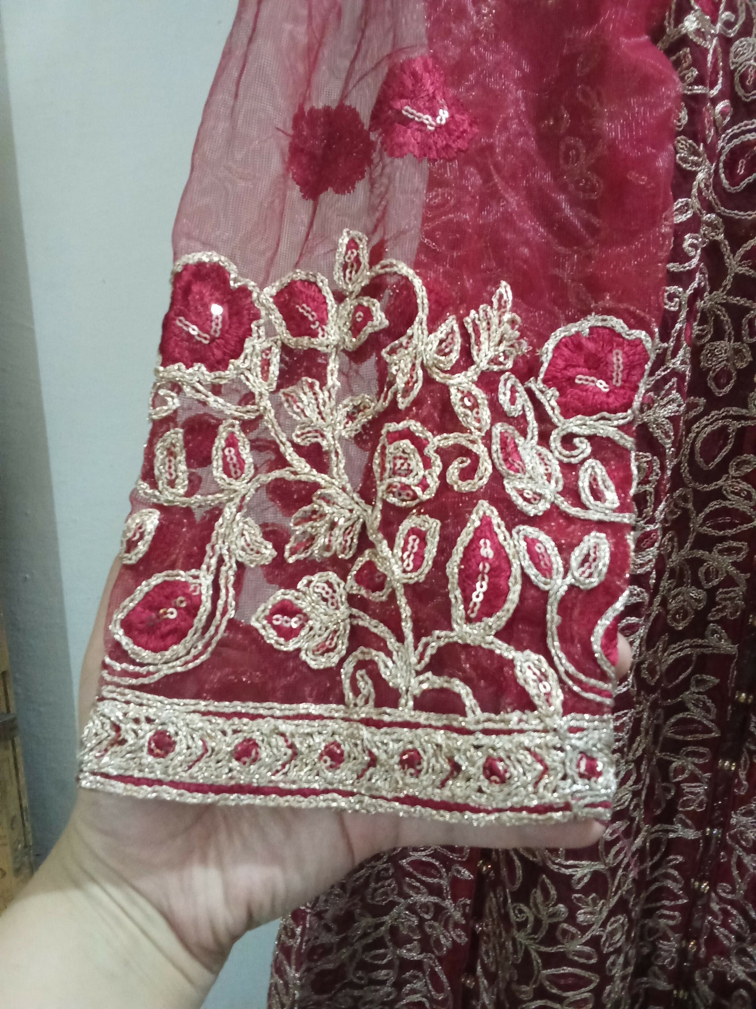 | MATERIAL & MEASUREMENT | Material : Fancy Embriodered Three piece Bridal Maxi. Embriodered net duppata. Silk trouser and inner Measurement: 2.5 yards net duppata Shoulder:17 Chest:20 Back:19 Length:47 Trouser length:39 |