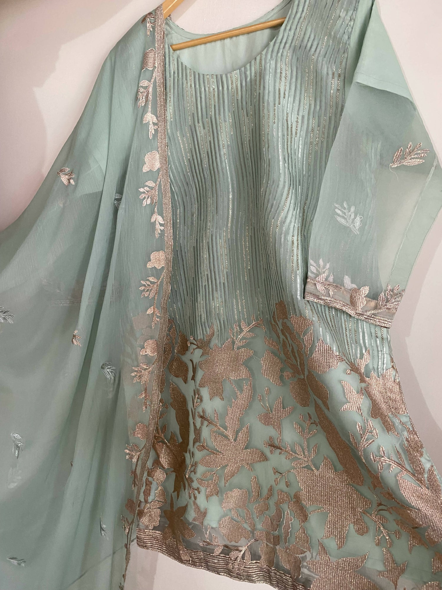 Fabric / Material: Organza Suit with embroidered front and back with chiffon dupatta.