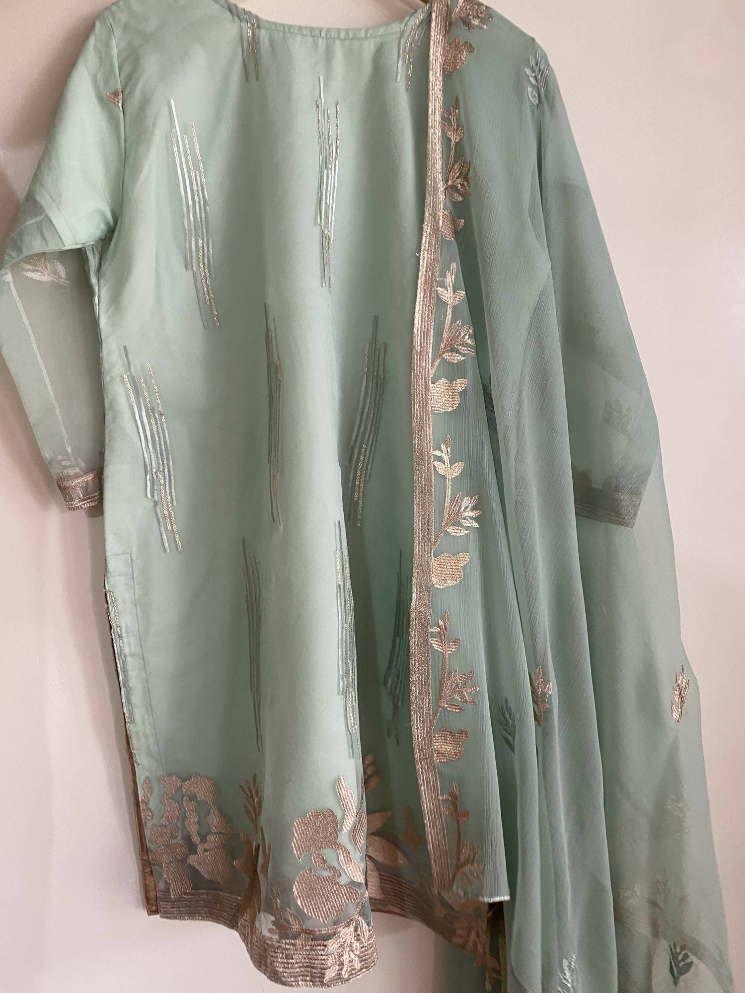 | MATERIAL & MEASUREMENT | A very elegant 3 piece organza dress with embroidered front and back with chiffon dupatta. Measurements: Chest 20 Length 38 Shoulder 14 Trouser length 34 |