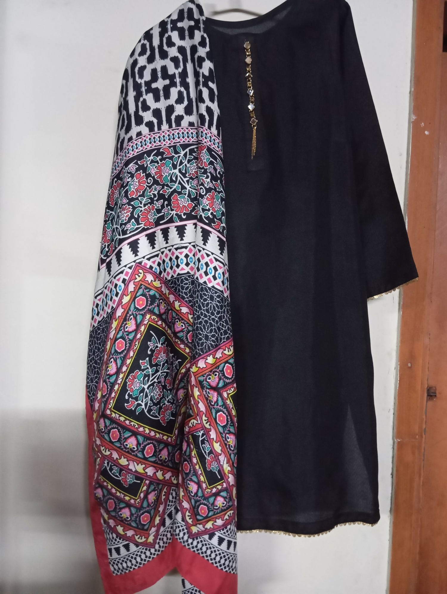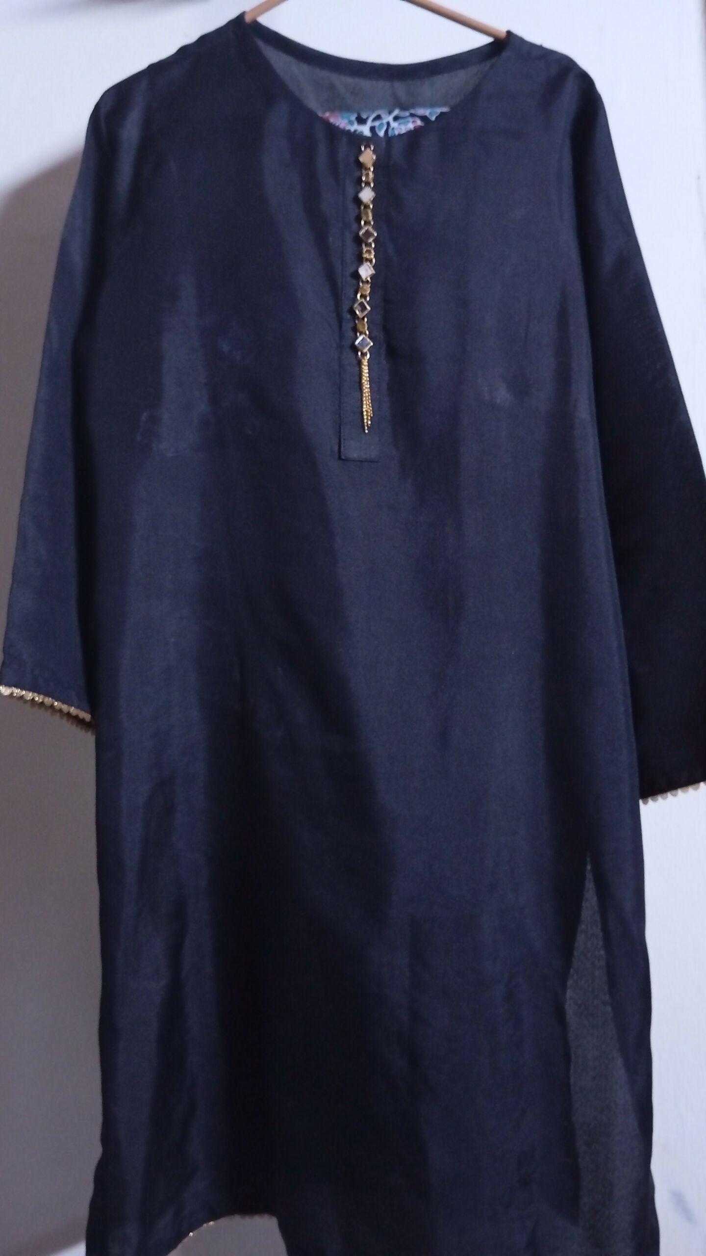 | MATERIAL & MEASUREMENT | Fabric: Shirt and Trouser Katan Silk and Dupatta in Linen Type Stuff Measurements: Shirt Length: 37.5 Chest: 21 Hip: 22.5 Trouser Length: 35 |