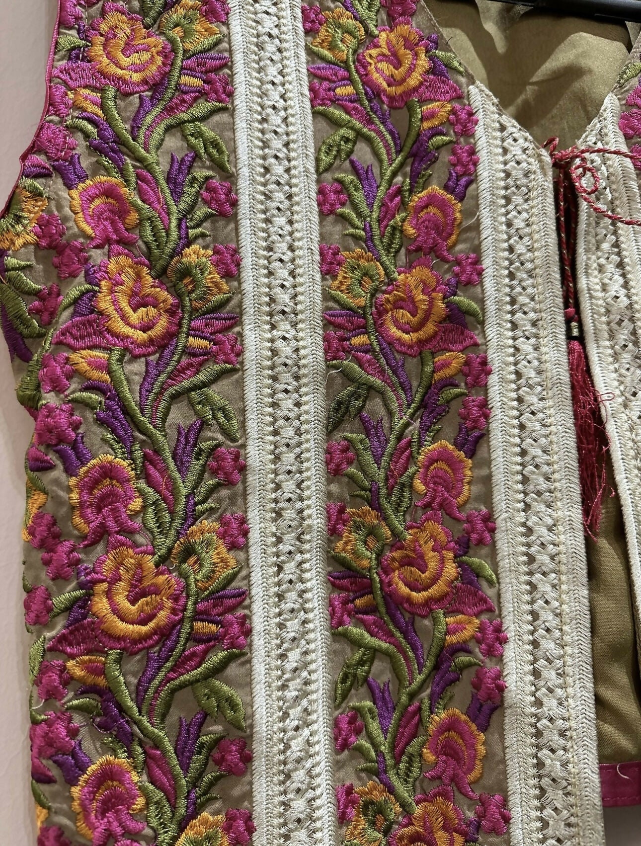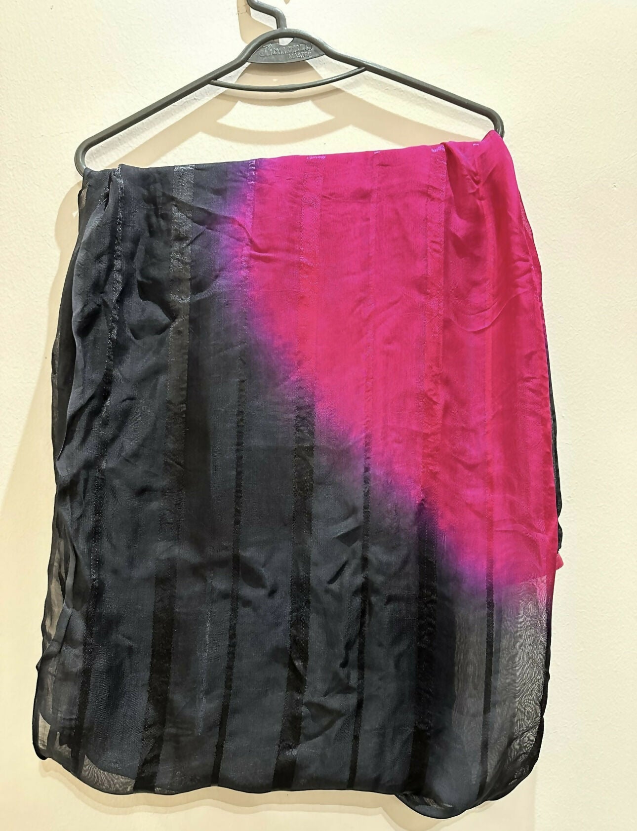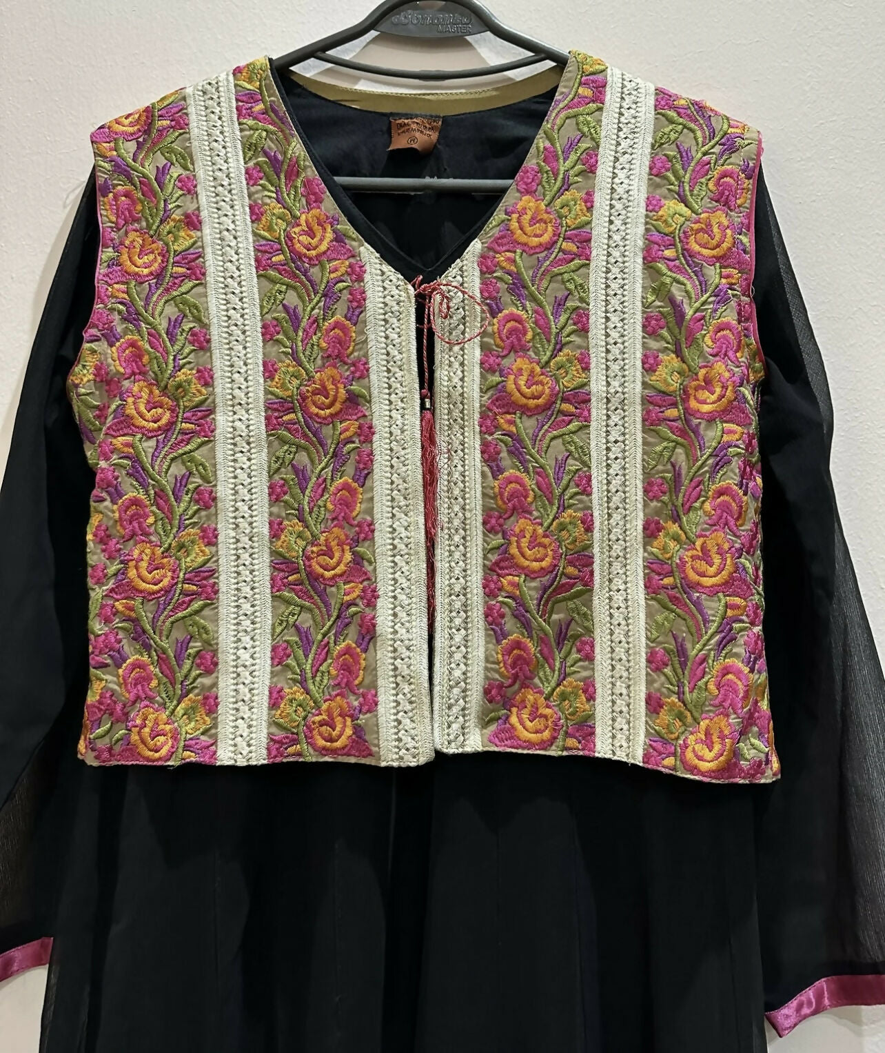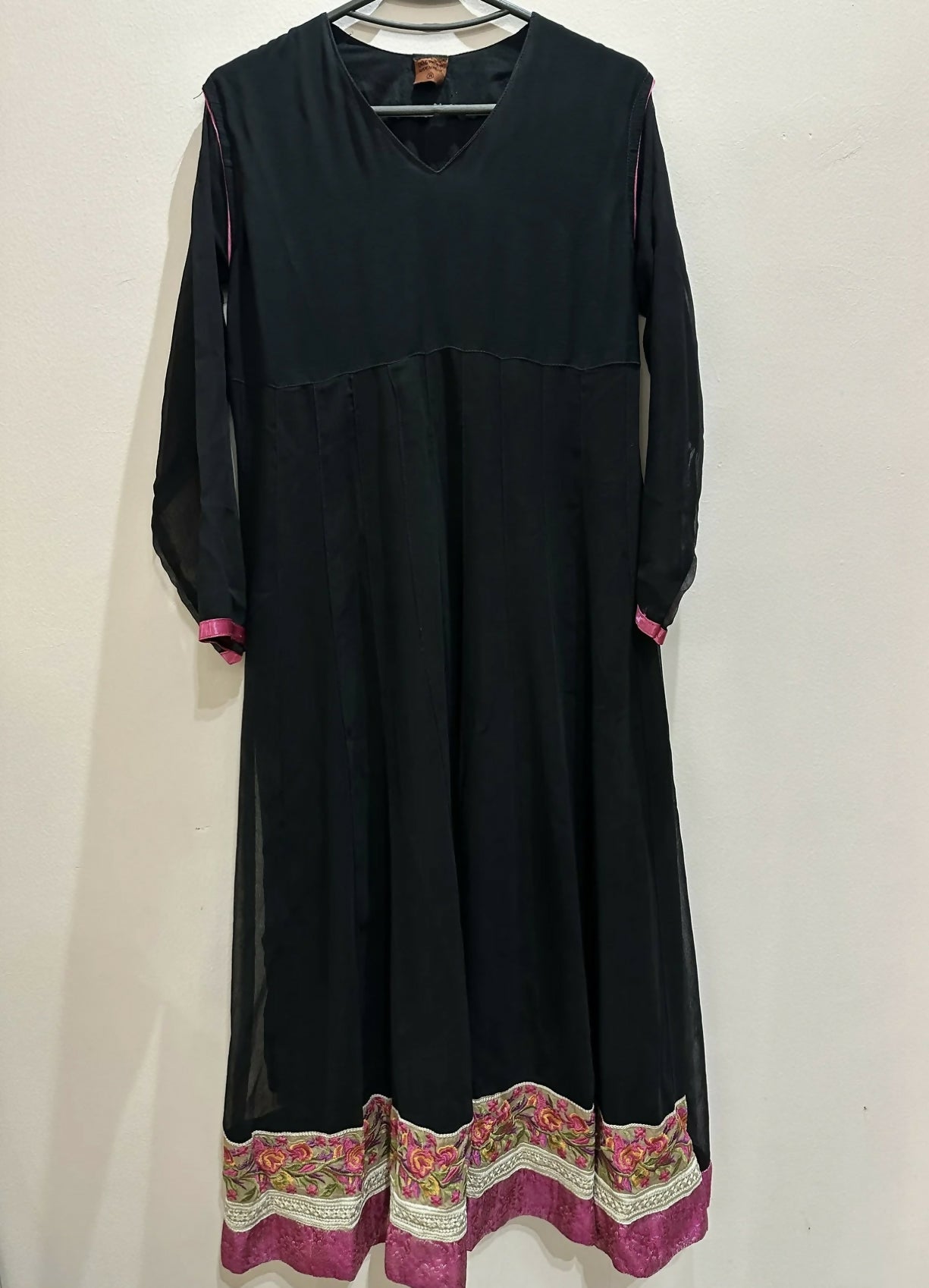 Black chiffon kalidar frock with embroidered border on front bottom.