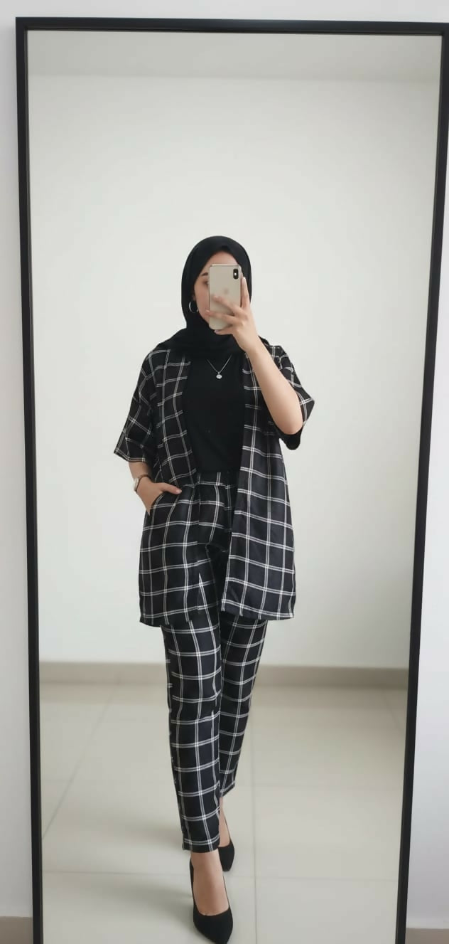 Pre-Loved Soft Silk Plaid Coat-Style Ensemble – Medium Size ✨* This stunning ensemble includes a stylish coat-like outer shirt with an inner lining and pairs beautifully with matching trousers for a complete, coordinated look. The fitted, button-front design adds a dramatic, Western-inspired flair while the soft silk material ensures ultimate comfort and a smooth, lustrous finish. *Key Features:* - *Medium size* with a fitted silhouette. - Pre-loved condition, gently used and well-preserved. - Black & white plaid pattern on the outer coat-style shirt with short sleeves and button closure. - Soft silk fabric feels luxurious against the skin and offers breathable comfort. - Includes an inner lining for added sophistication and warmth. - Designed to be paired with matching trousers (included in the ensemble) for a total look. - Ideal for formal events, casual outings, or vintage-inspired fashion statements. *Styling Tip:* Wear the silk coat open over a simple tee with the matching trousers for a chic, coordinated outfit, or button it up for a polished, vintage vibe. Perfect for fashion lovers who appreciate sustainable, pre-loved luxury 😊. INNER Preloved No of pieces: 03