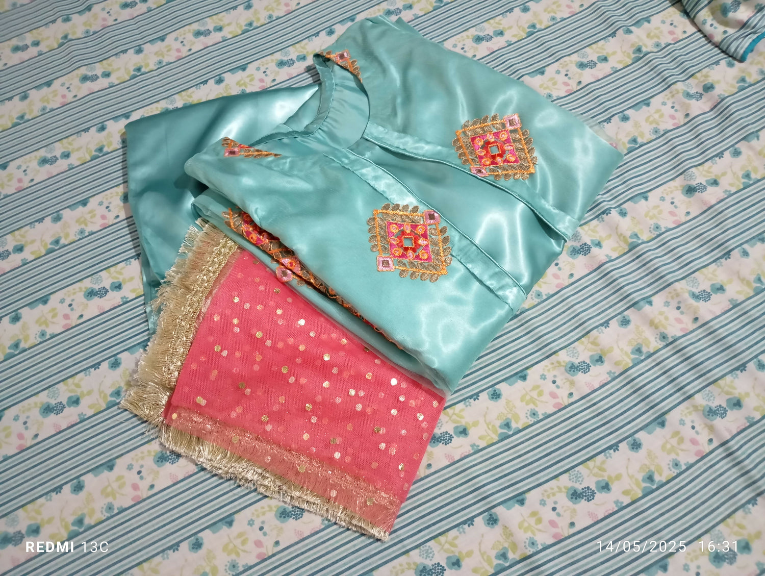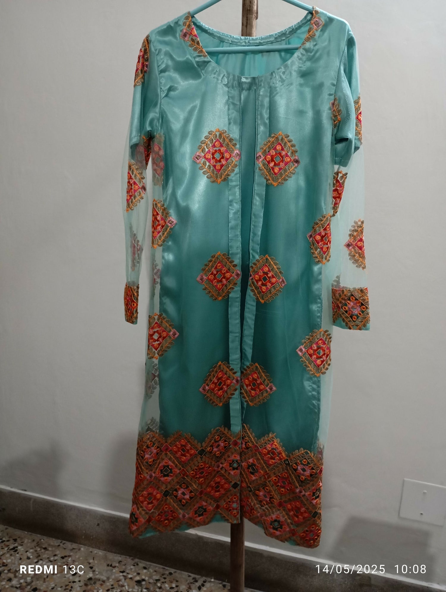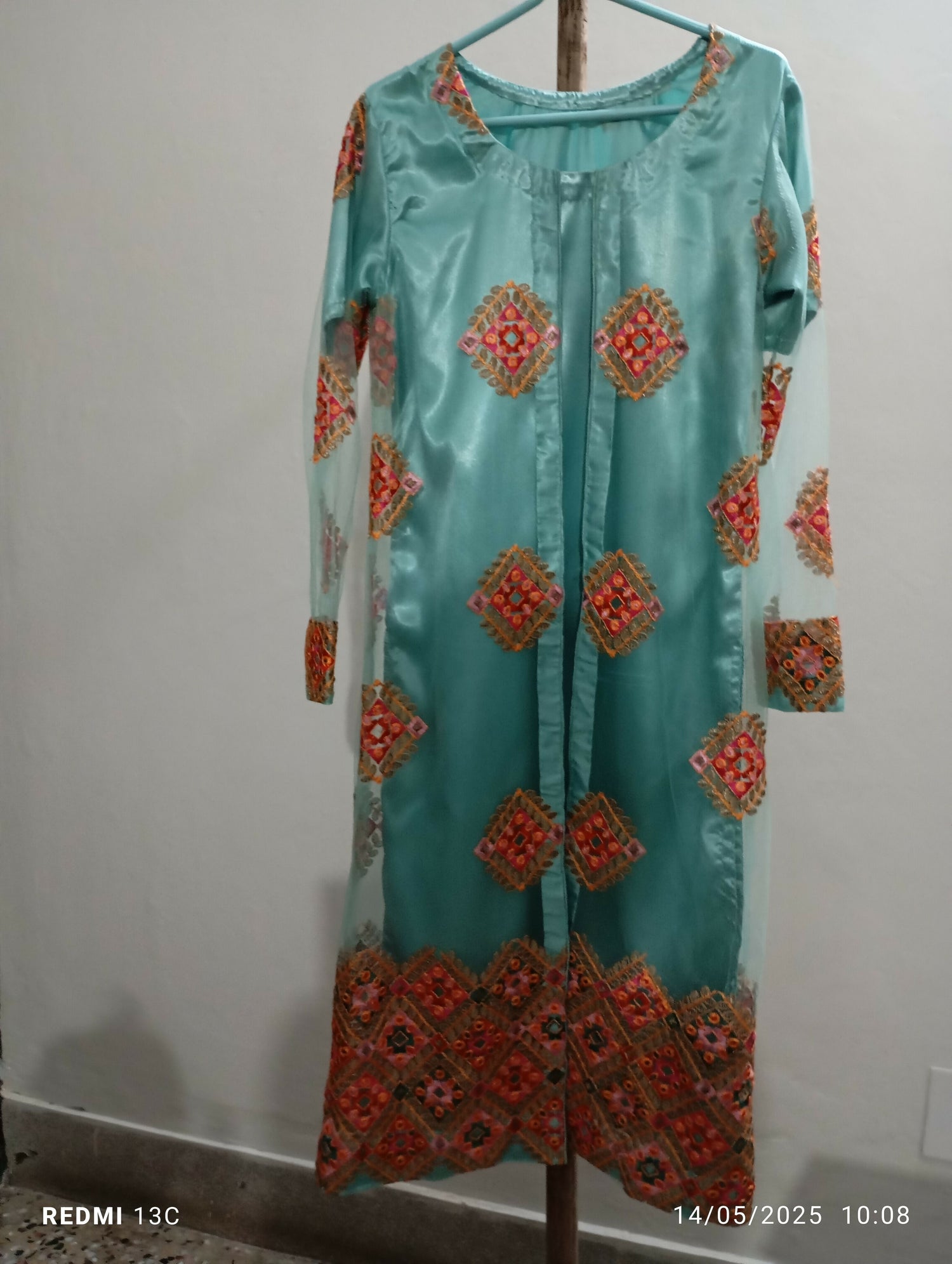 Unveil timeless elegance with our silk 3 pc ensemble , a perfect blend of sophistication and seasonal charm. Crafted from premium silk fabric , this semi-formal set features a richly embroidered sleeves and all over open shirt , giving it a refined festive look. The outfit is ideal for Eid gatherings or all occasions, offering both grace and comfort.