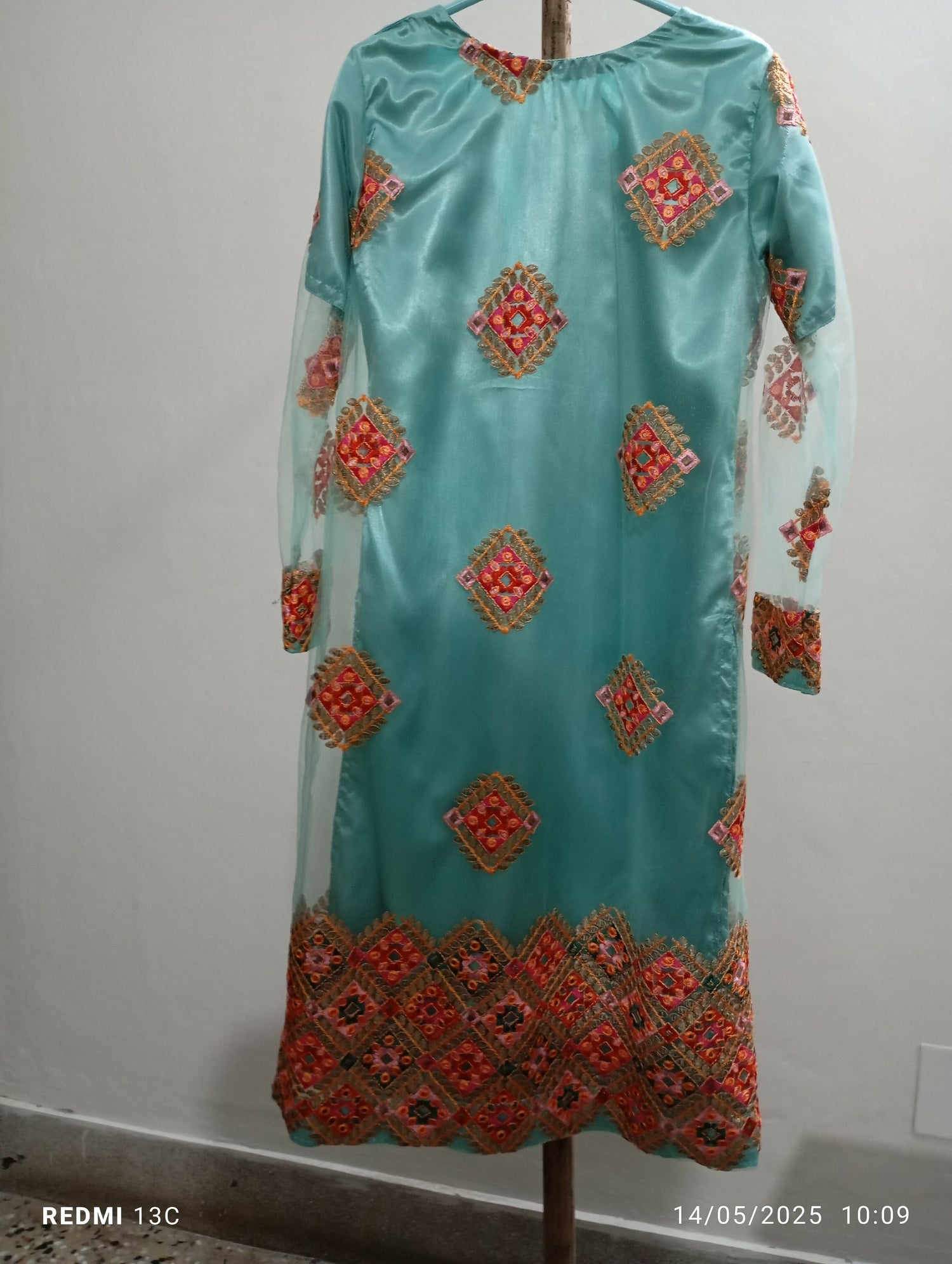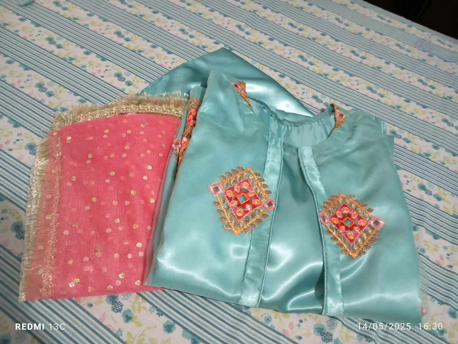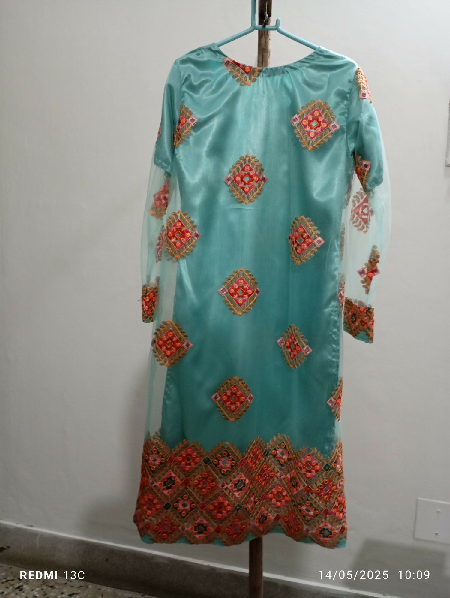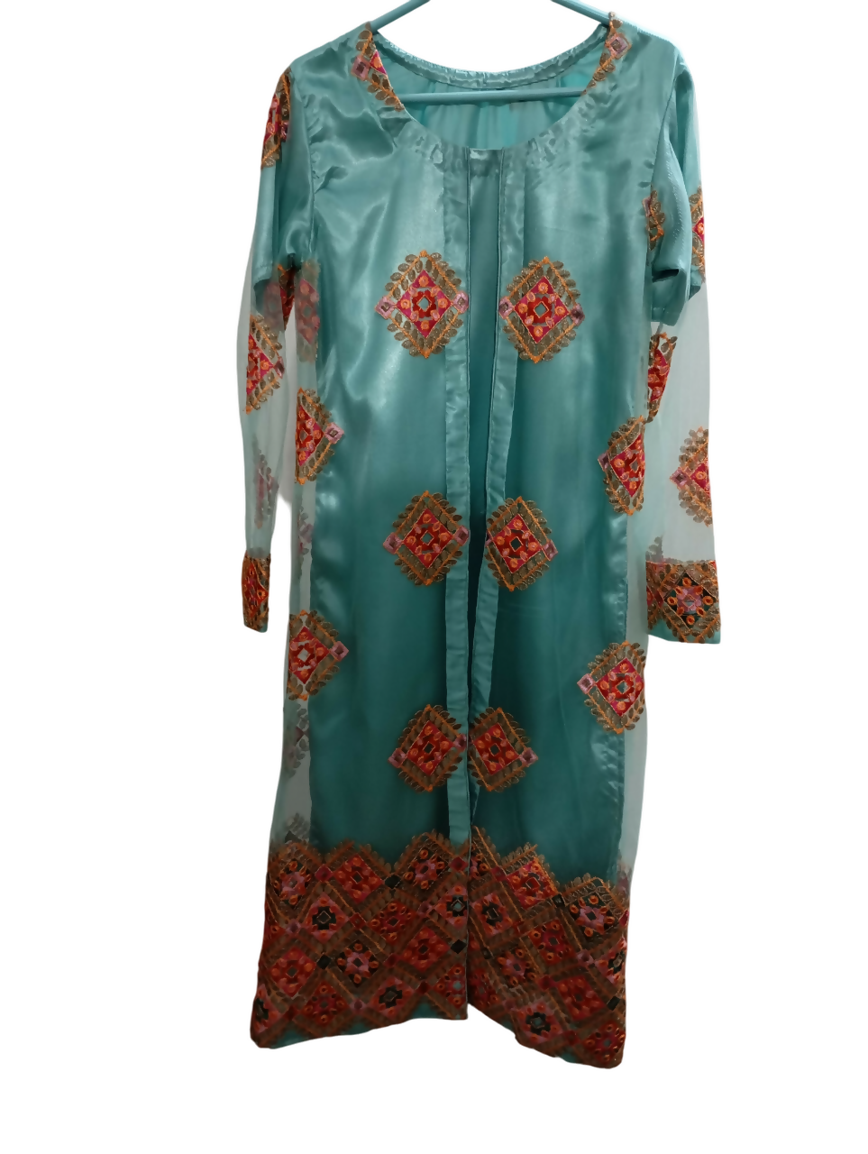 Unveil timeless elegance with our silk 3 pc ensemble , a perfect blend of sophistication and seasonal charm. Crafted from premium silk fabric , this semi-formal set features a richly embroidered sleeves and all over open shirt , giving it a refined festive look. The outfit is ideal for Eid gatherings or all occasions, offering both grace and comfort.
