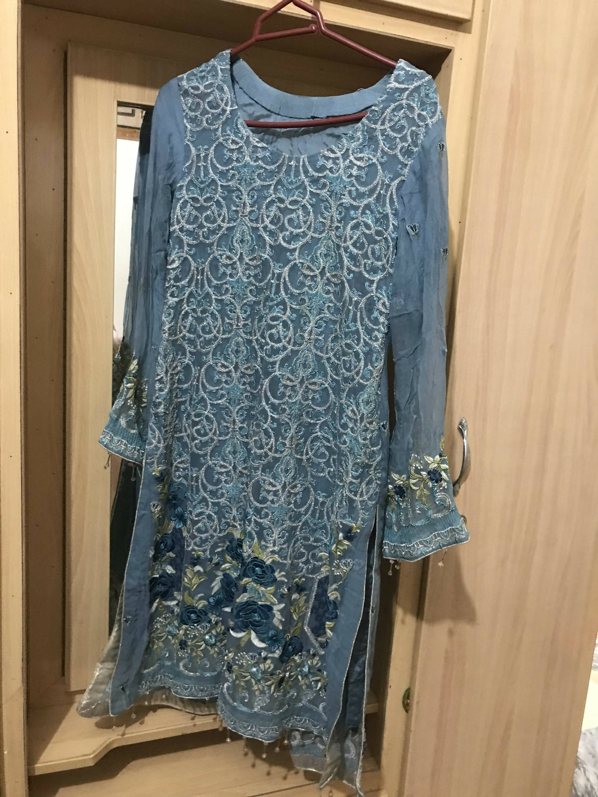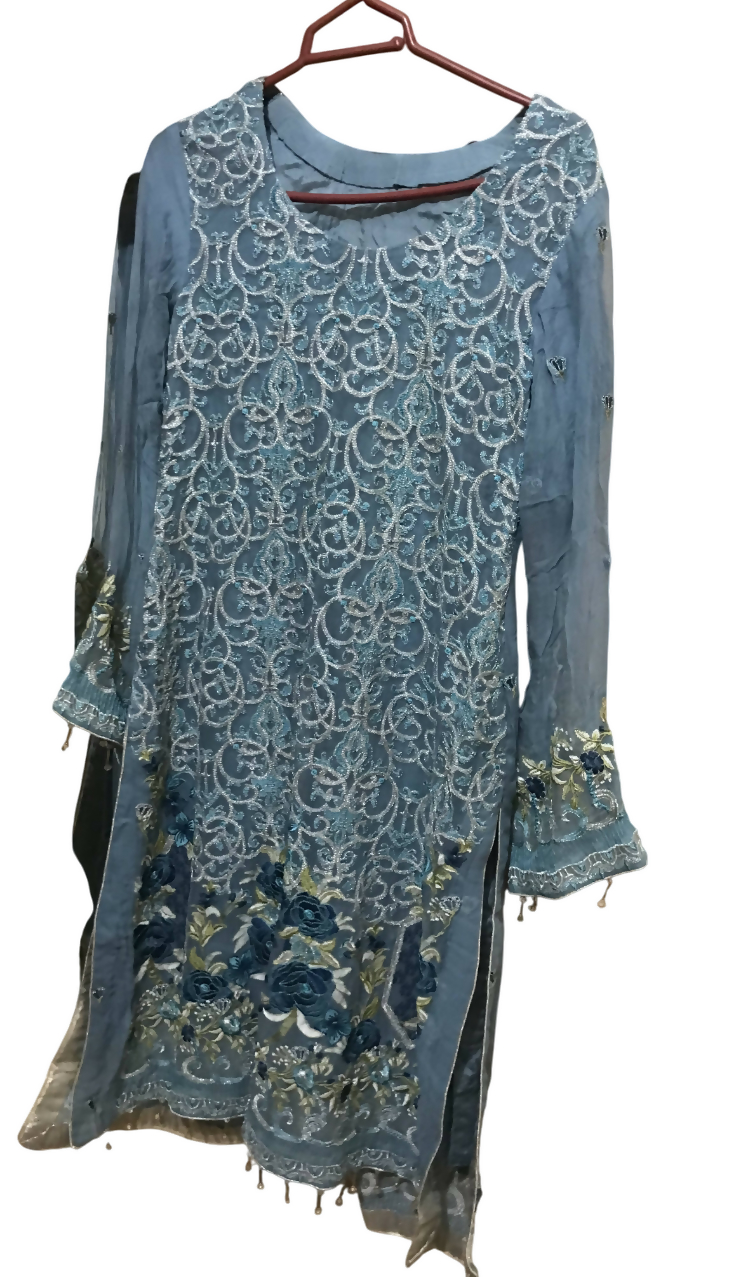 | MATERIAL & MEASUREMENT | Shoulder 14 Chest 19.5 Length 37 Trousers length 38 Fully embroided heavy chiffon |