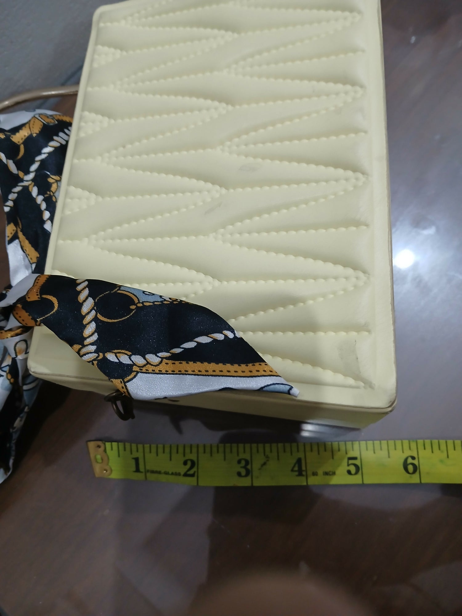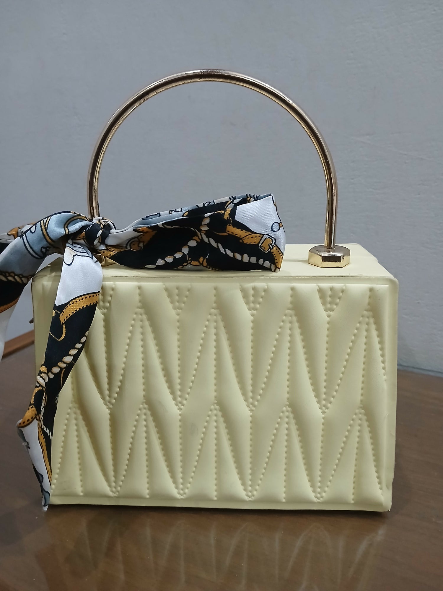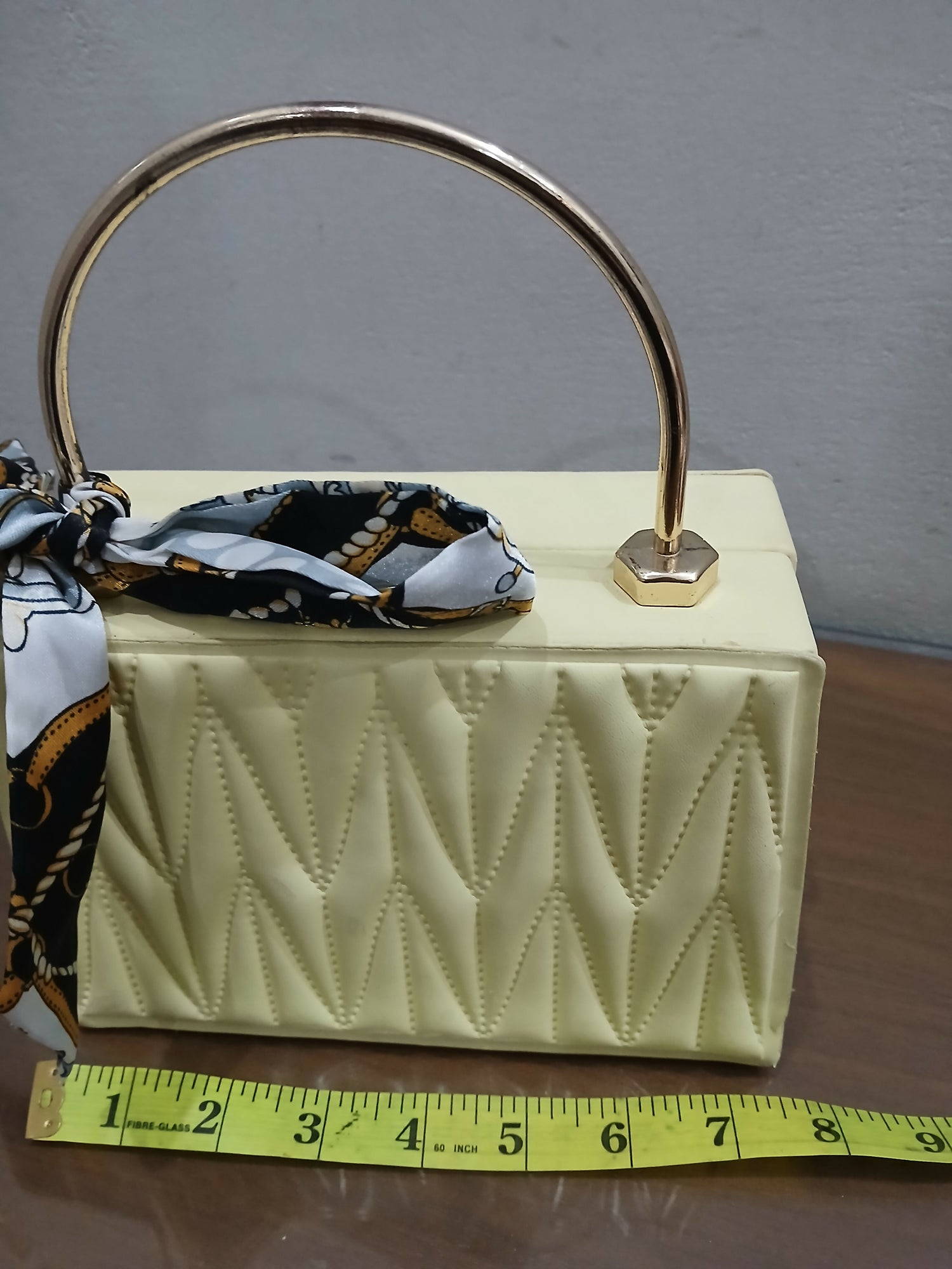 | MATERIAL & MEASUREMENT | Small size hand bag Condition: 10/10 new Color : light yellow Detailing: yellow hand bag with golden chain for hanging and silk scarf to add a style |