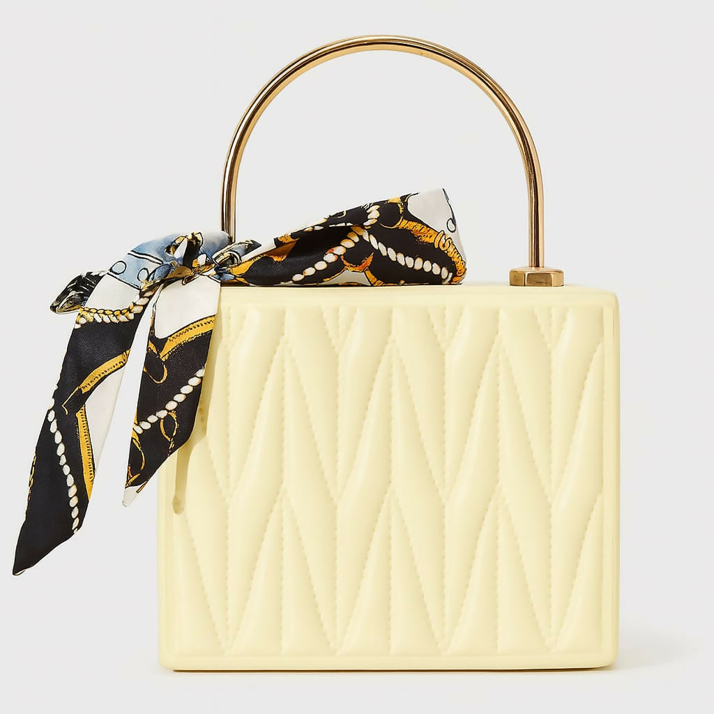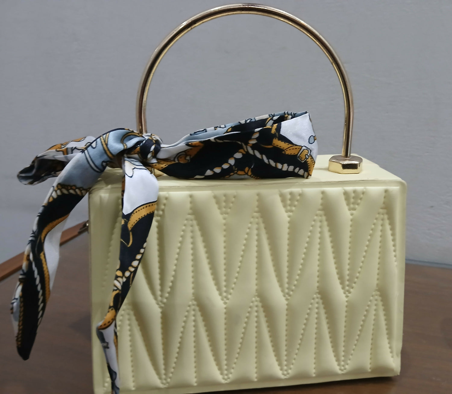 Detailing: yellow hand bag with golden chain for hanging and silk scarf to add a style