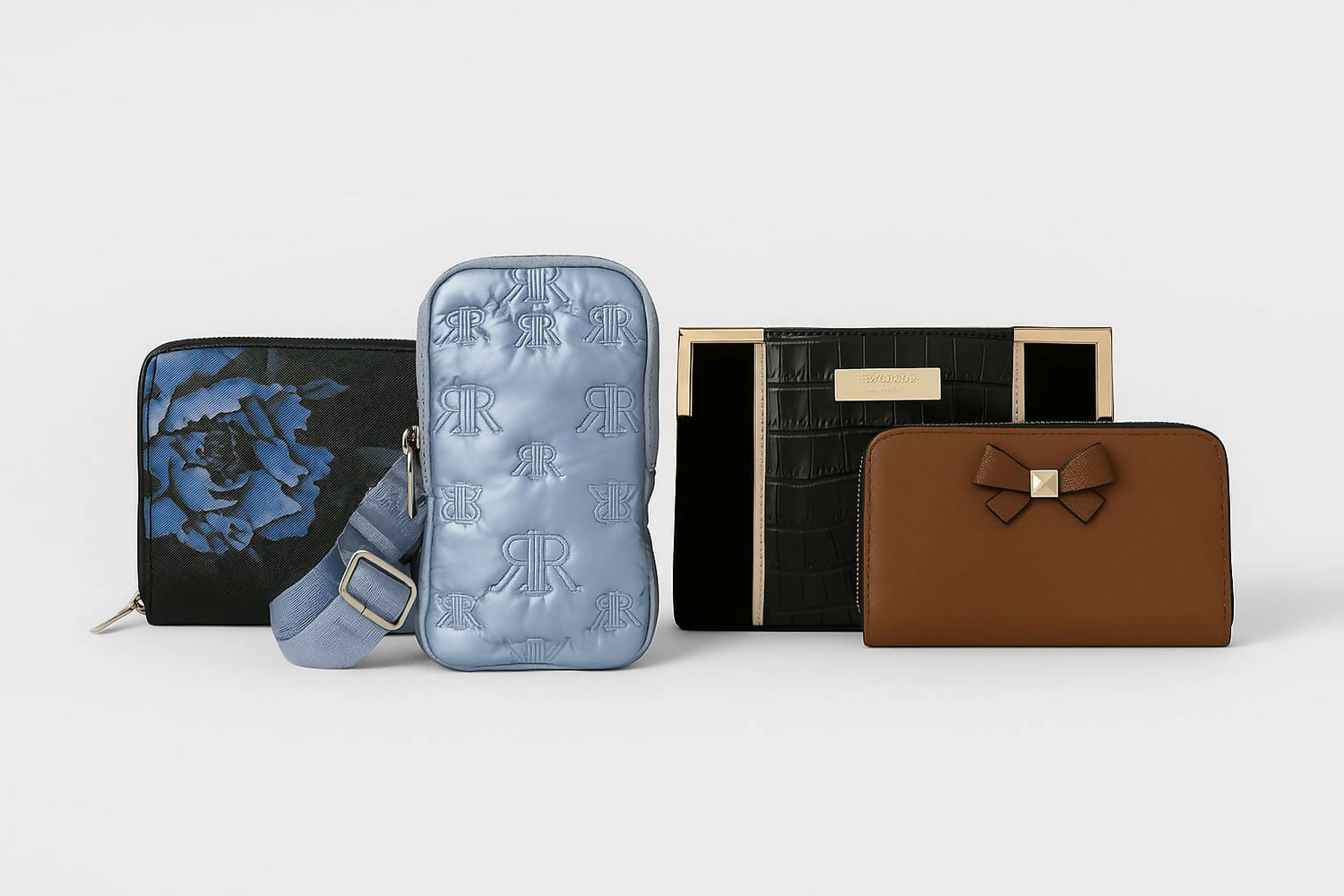 3 wallets and 1 is mobile cross belt black wallet is of Rver Island and mobile cross belt is River island Brown is Primark and Black Blue is non brande