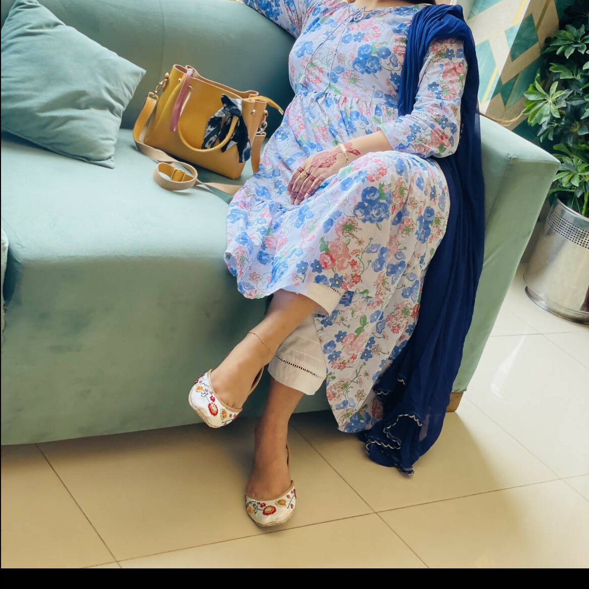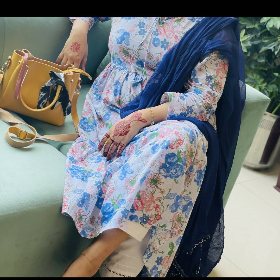 Pure lawn different colors floral long frock is available in medium size. The flyer of the frock is wide and this frok is worn only once.