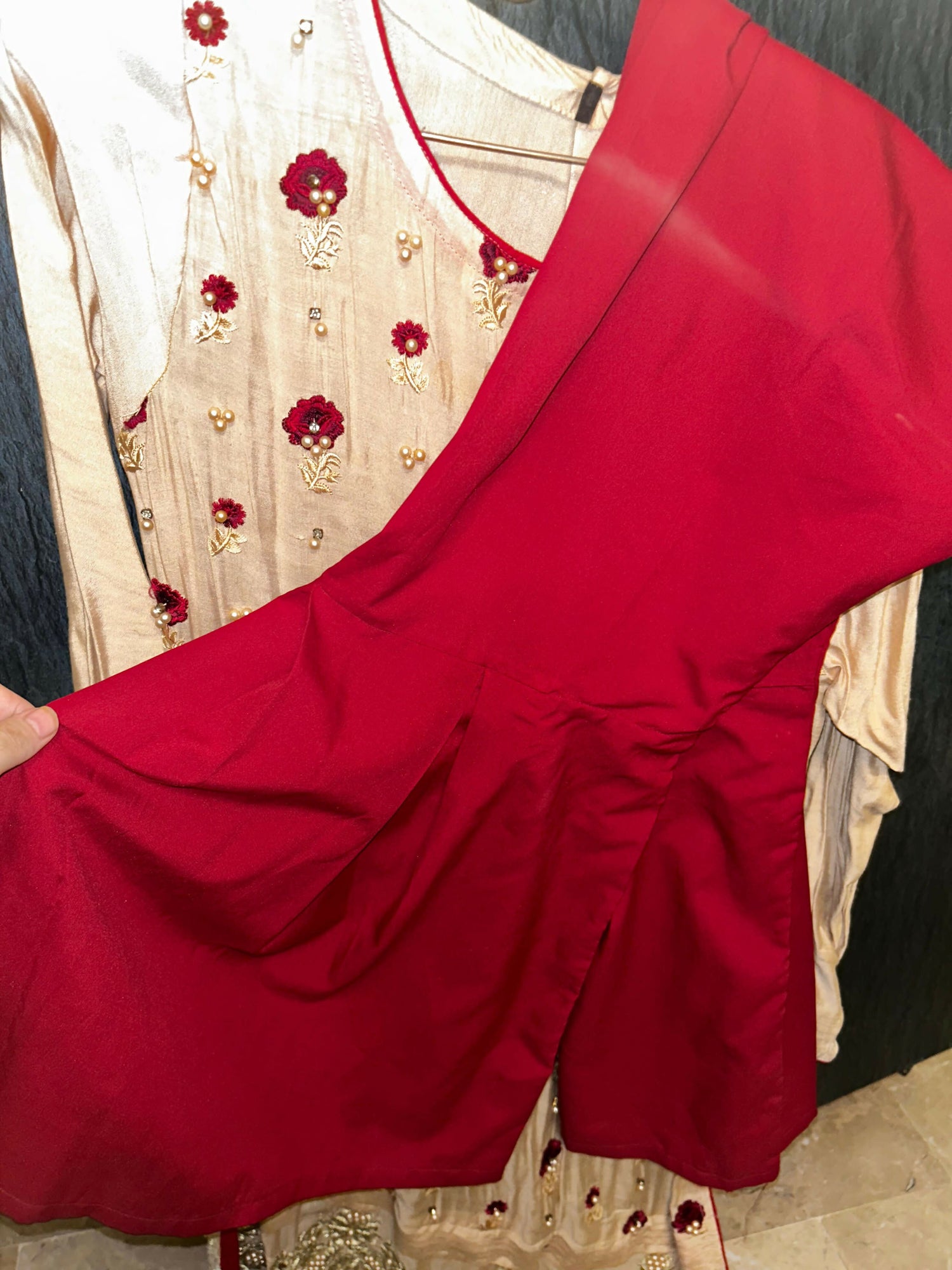An elegant and formal garara-style frock outfit in a luxurious champagne gold shade, decorated with deep maroon floral embroidery, pearls, and zari detailing. The outfit includes: