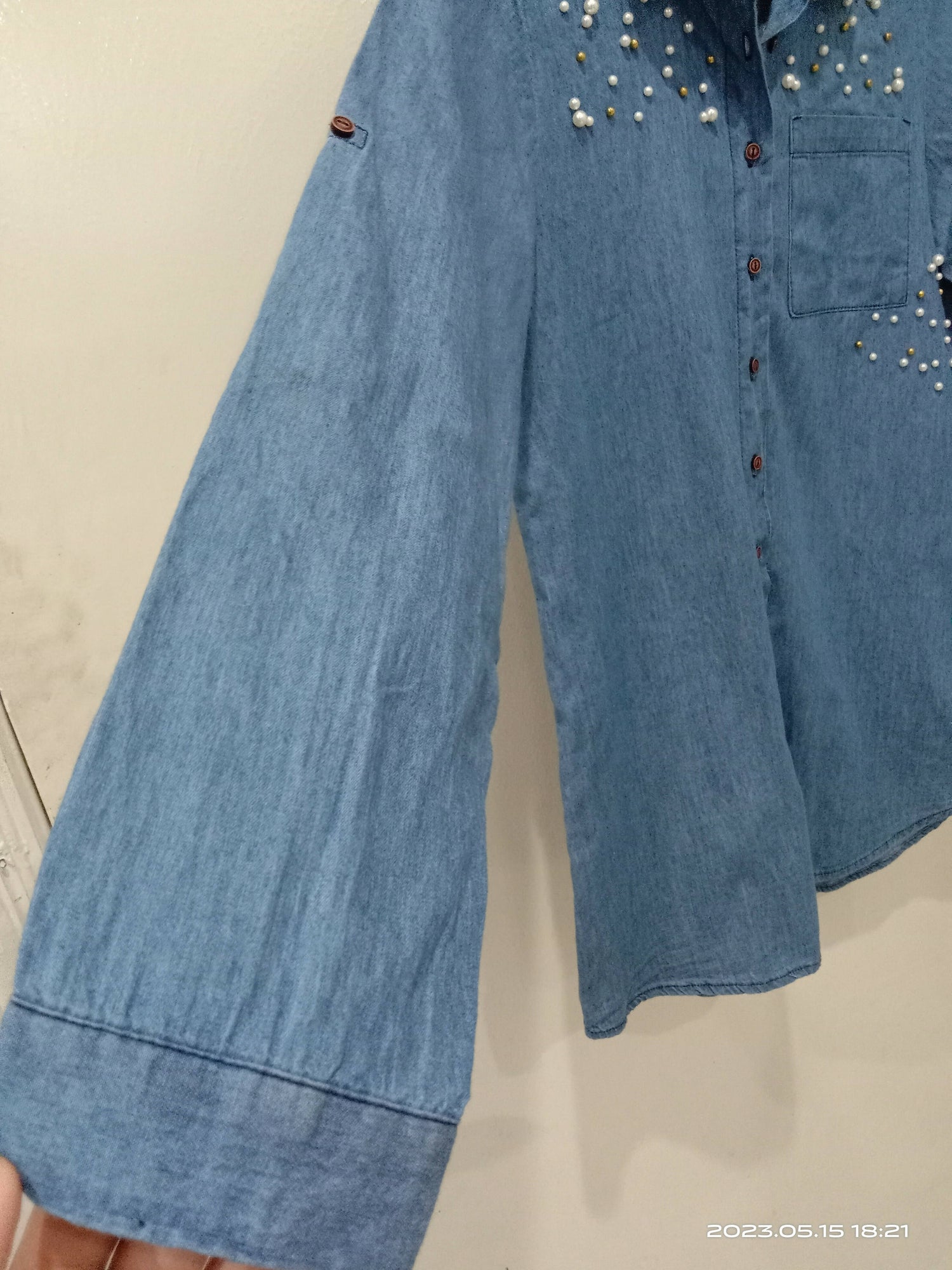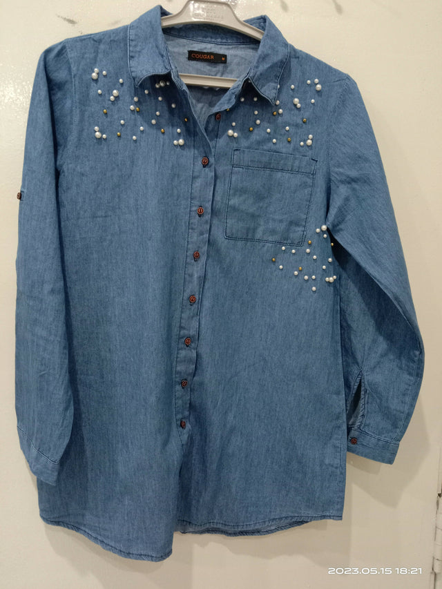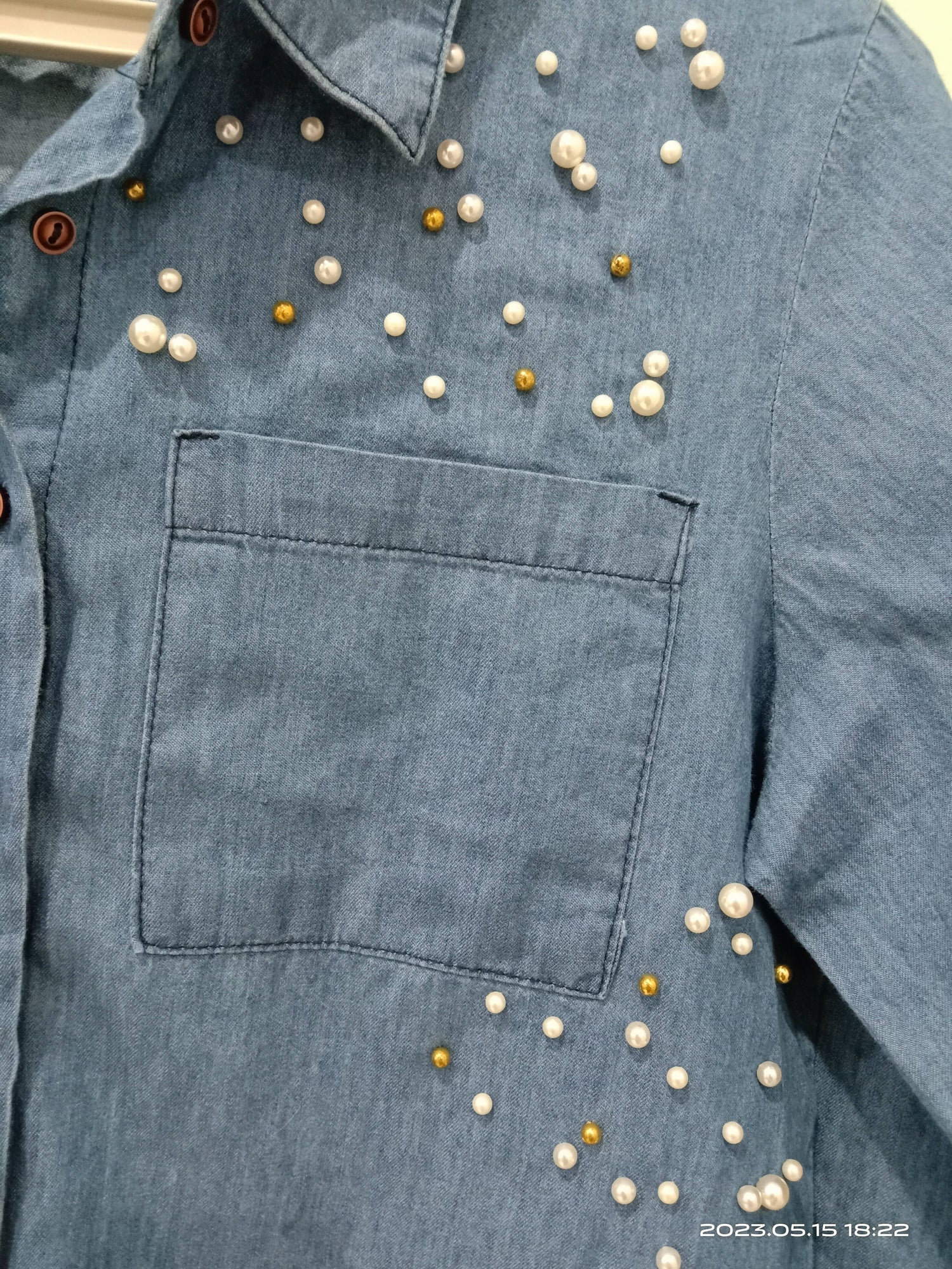 تفصیلات: موتیوں کے زیور کے ساتھ خواتین کی بٹن نیچے قمیض۔