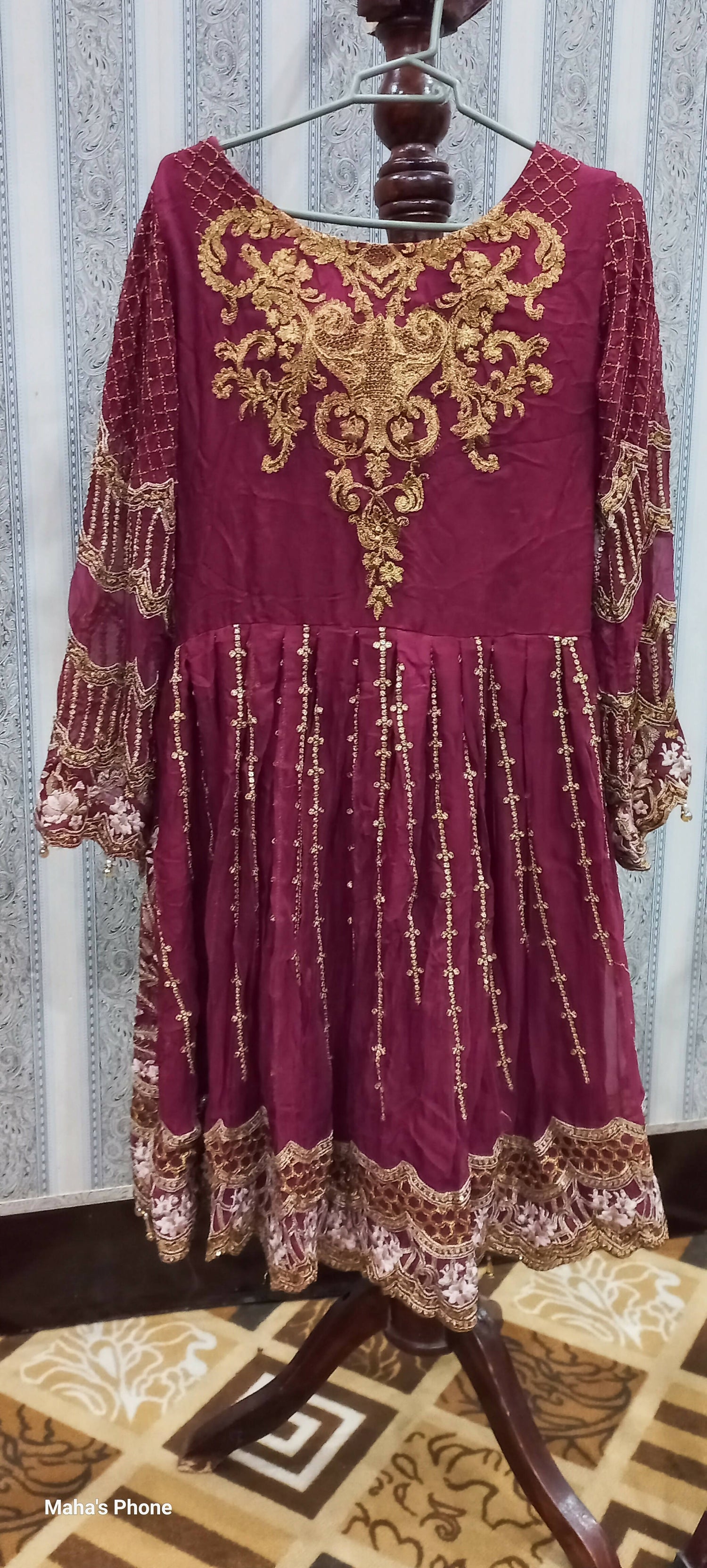 | MATERIAL & MEASUREMENT | Maroon Dress design by myself Shoulder :15 Sleeves: 20 (attach tassels with sleeve) Length fork : 36( attach tassels with frock) Balbottom trouser Trouser length: 38 Duppata 4 sides shamoos silk attached to Duppata Happy shopping |