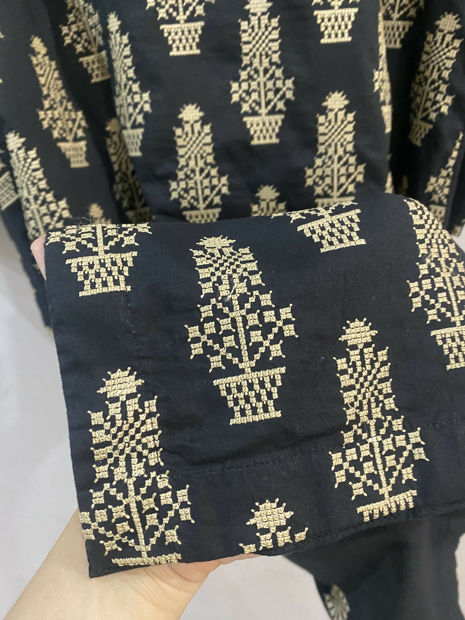 Elegant 2-piece outfit featuring a fully embroidered shirt with intricate embroidery on the front, back, and sleeves. Paired with a stylish culotte-style trouser for a modern and graceful look. Made in breathable lawn fabric, perfect for festive or semi-formal wear.