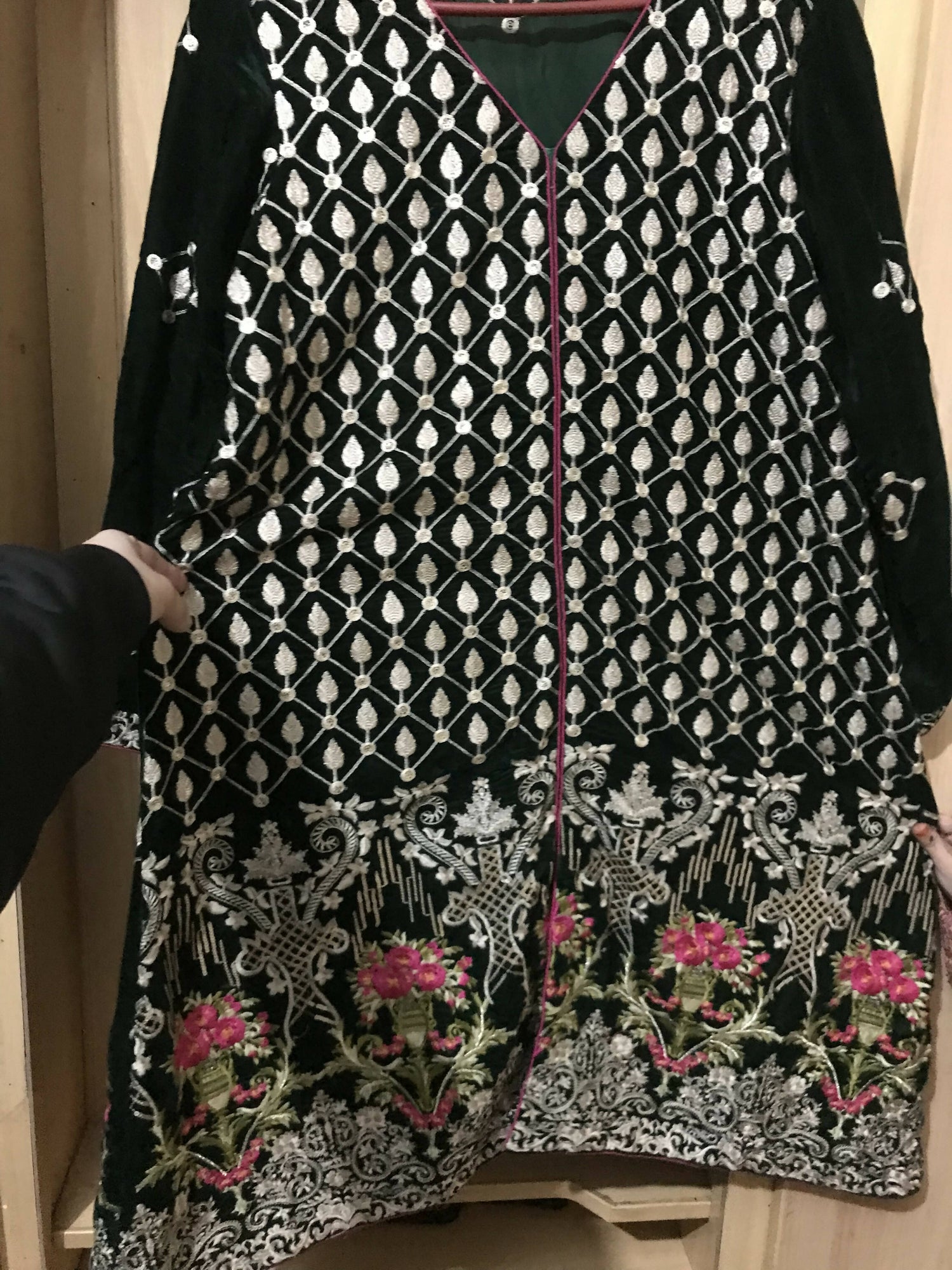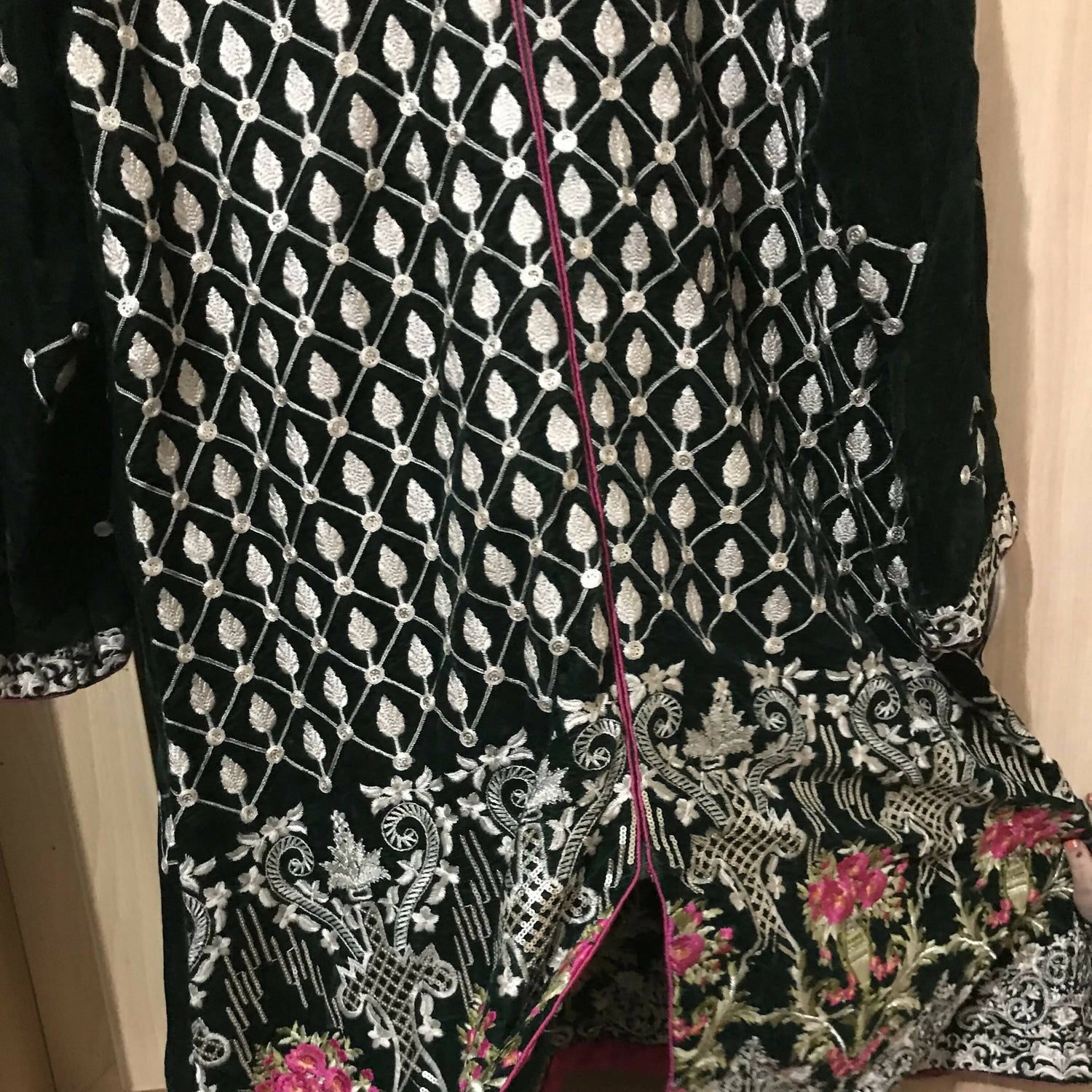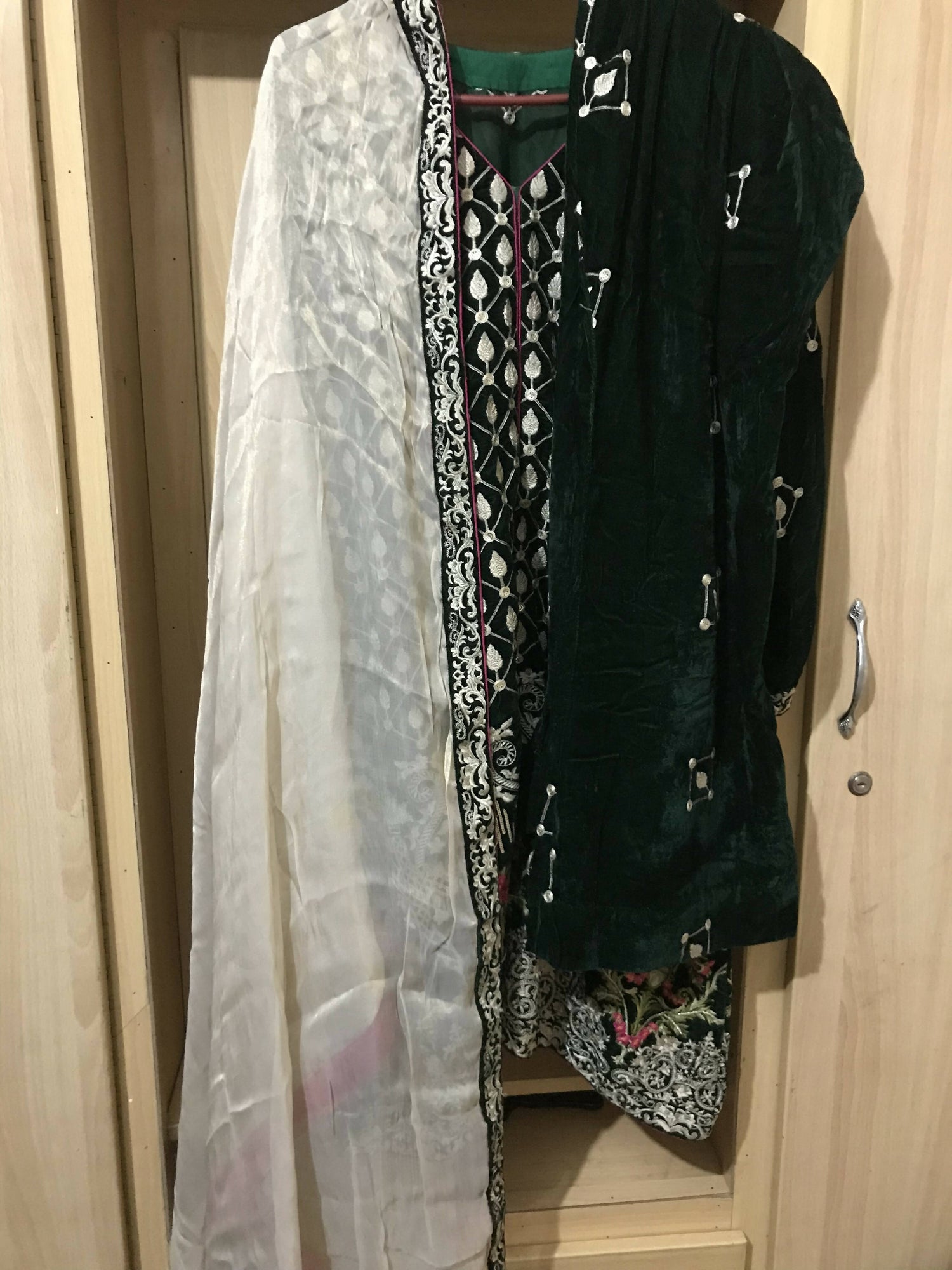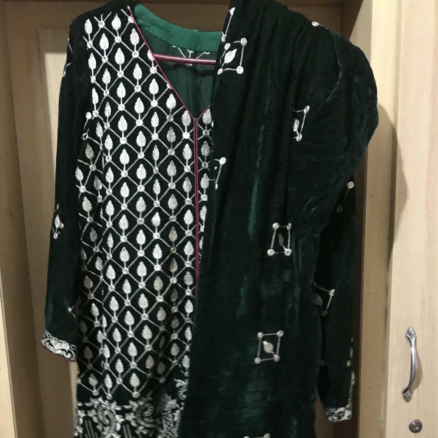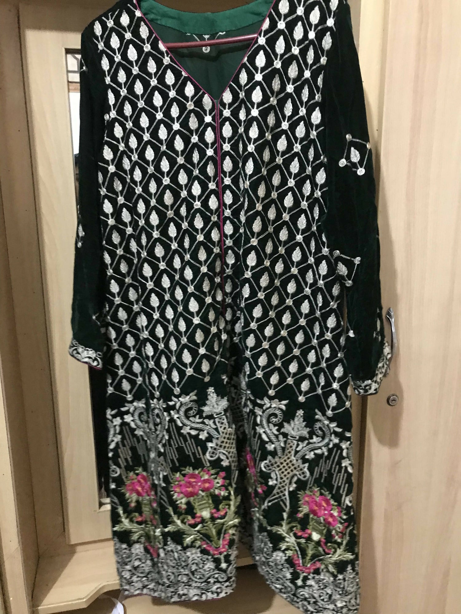 Fabric / Material: Heavy embroidered green velvet dress. Masoori dupatta with velvet embroidered patti. Shirt Aline cut. Trousers belbottom.