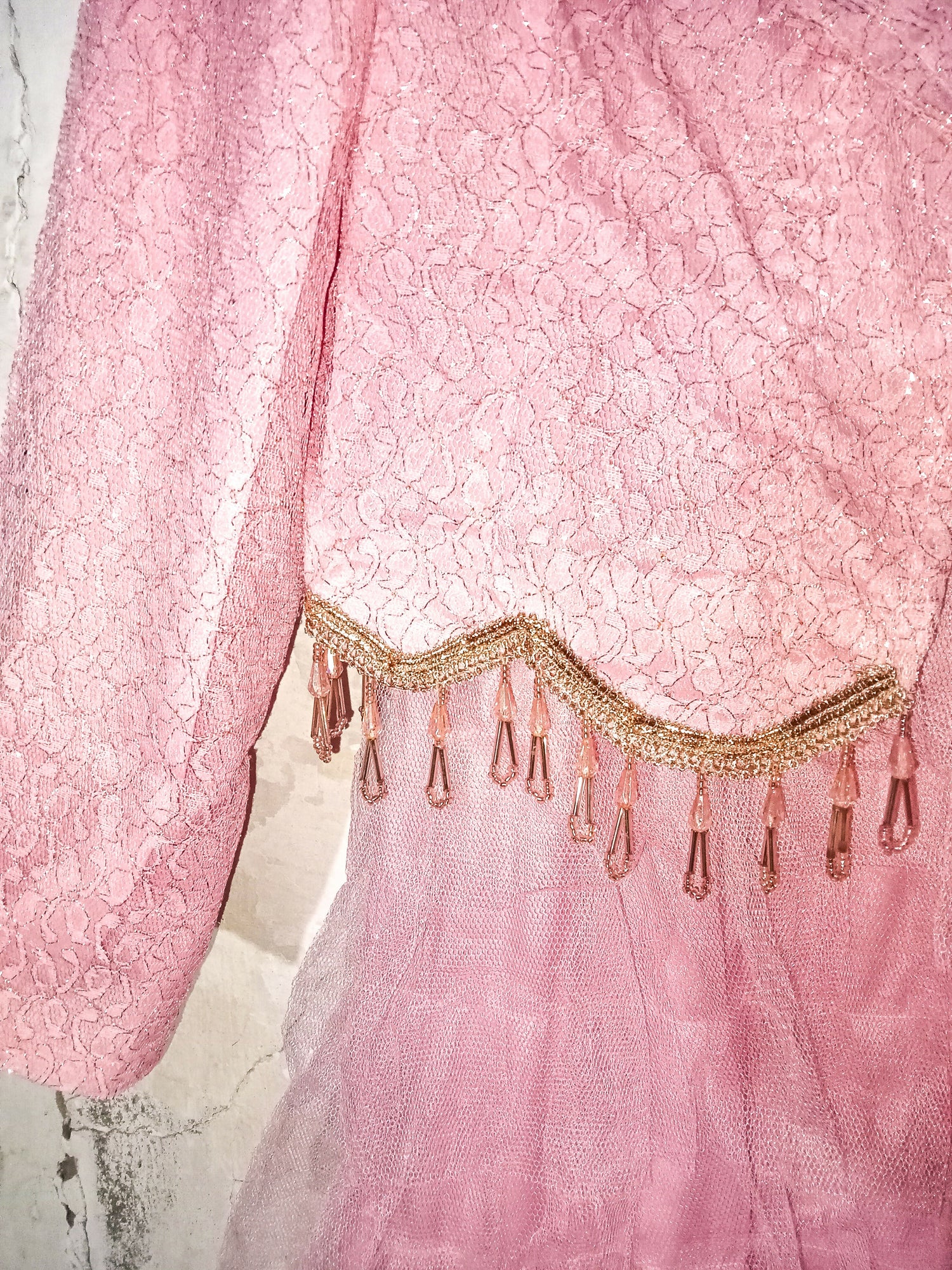 | MATERIAL & MEASUREMENT | Measurements (inches) : Shoulders: 15 Chest: 20 Waist: 17 Length:50 Sleeves : 22 Fabric: Net Additional details: beautiful tussles lace and Embroidered patch |