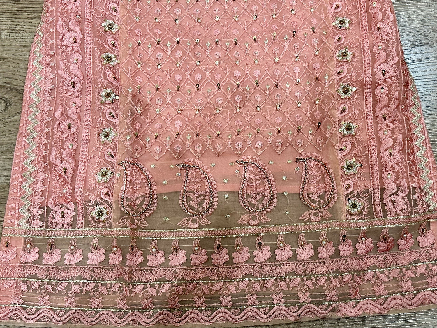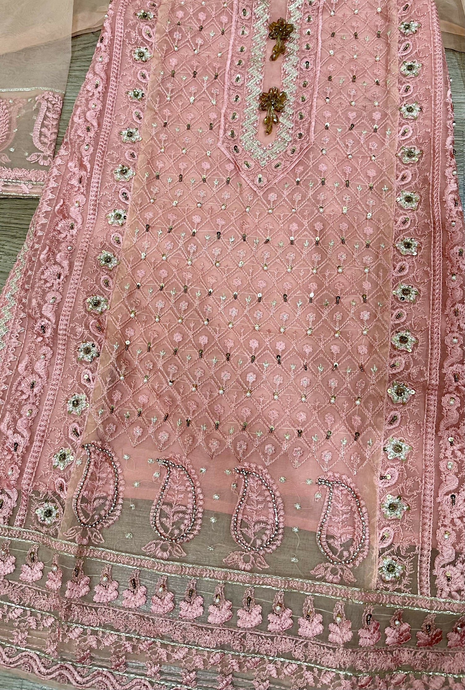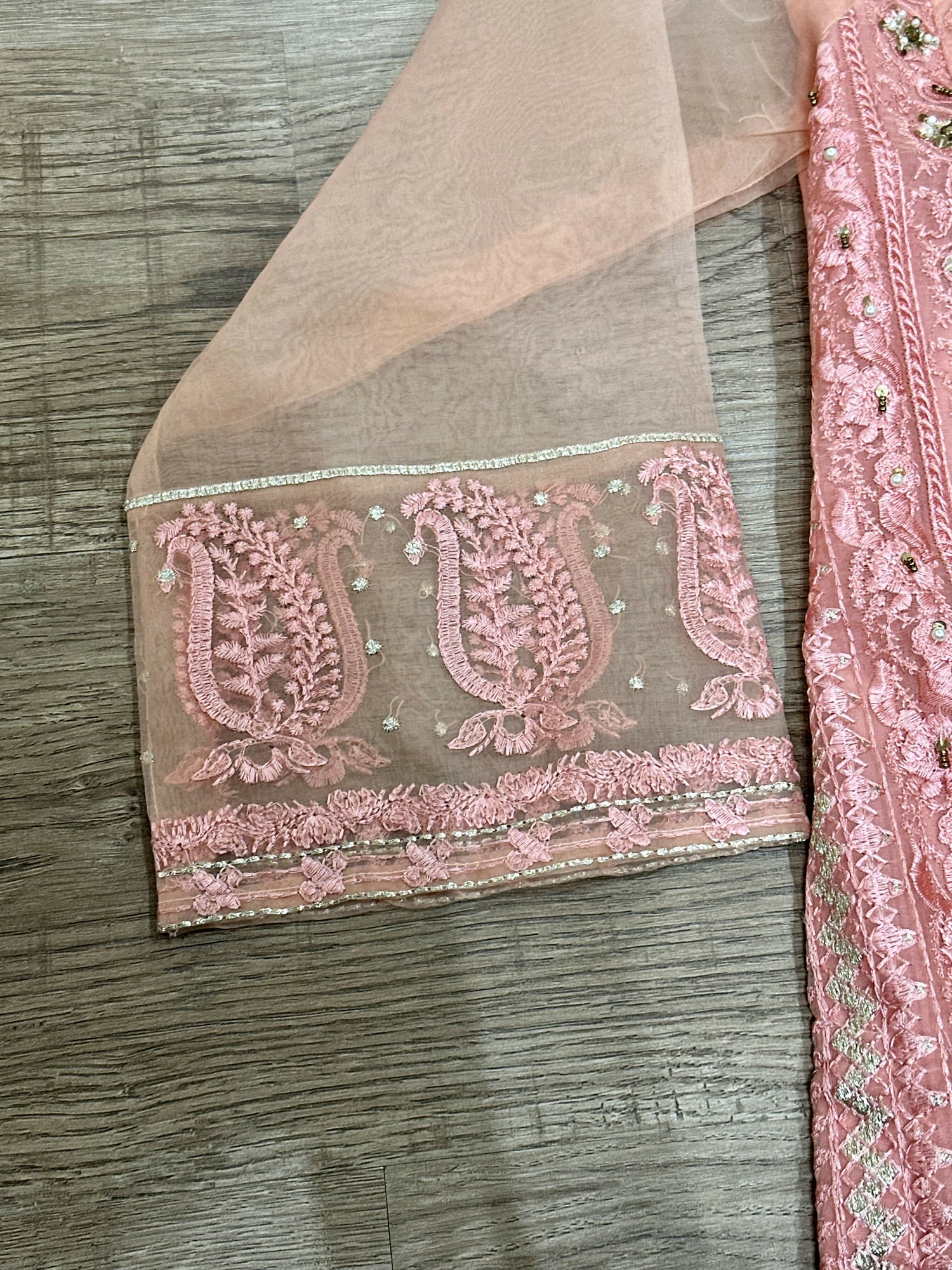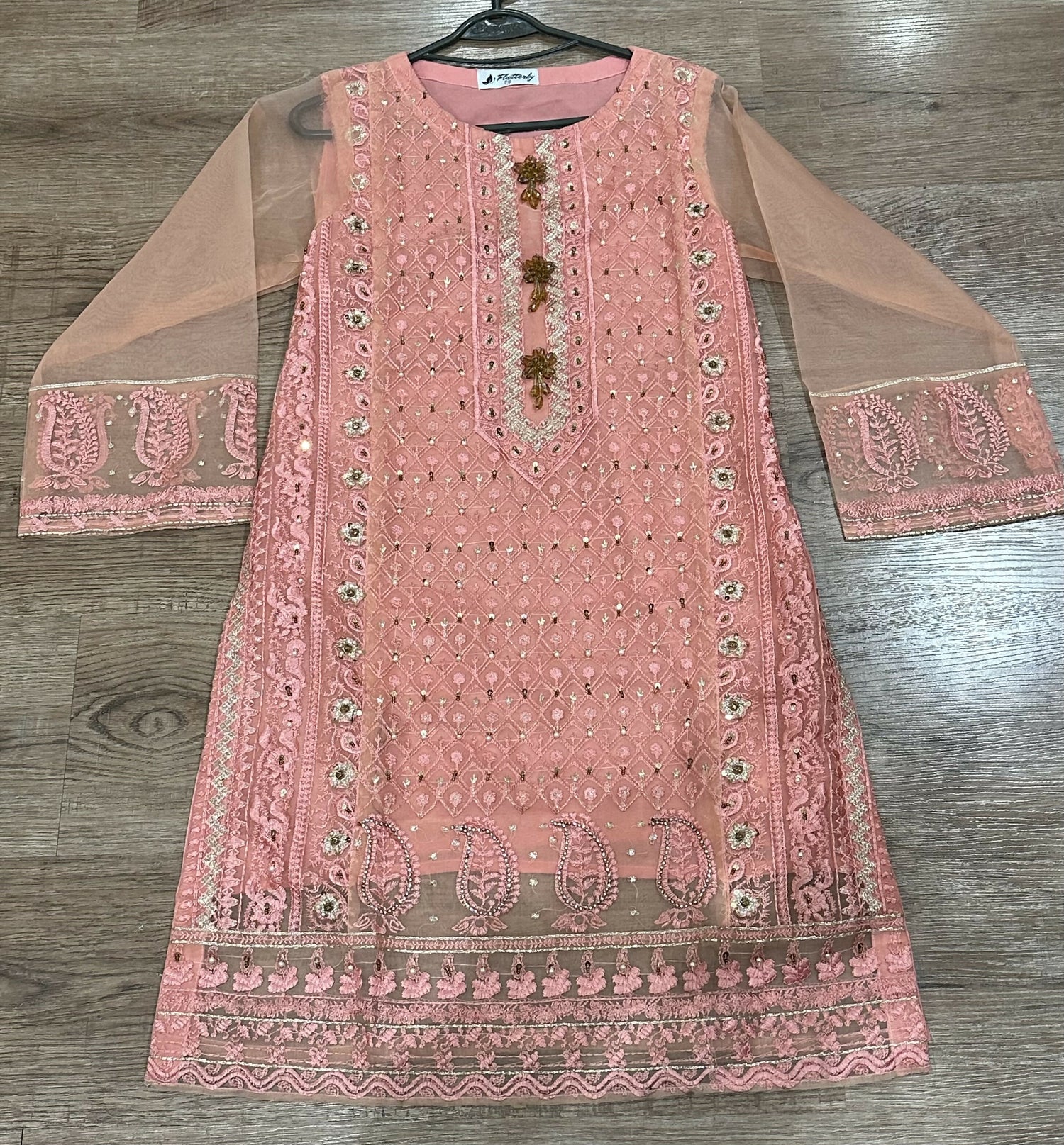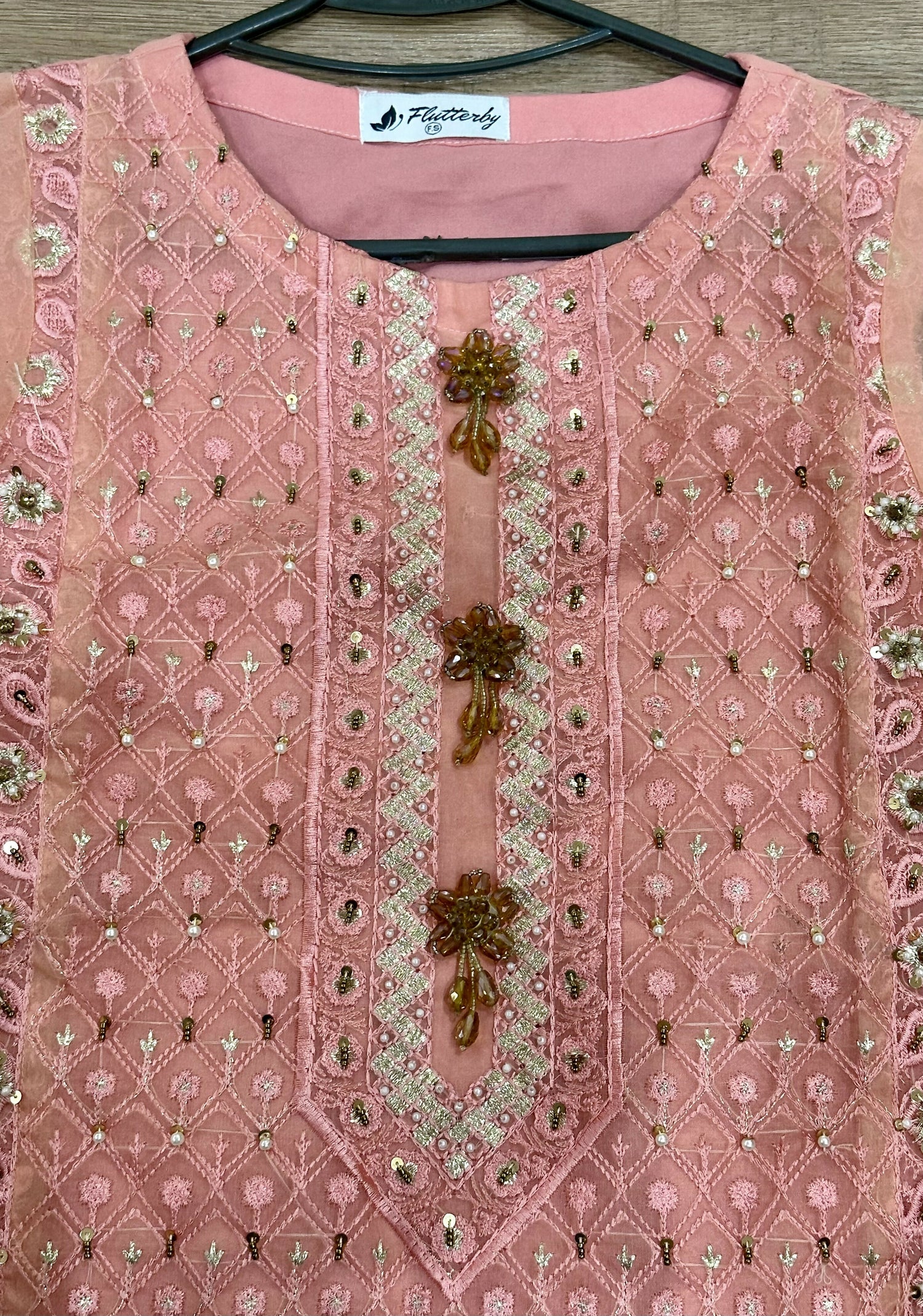 Pink organza shirt with heavy embroidery on shirt and embellishments. Plain back.