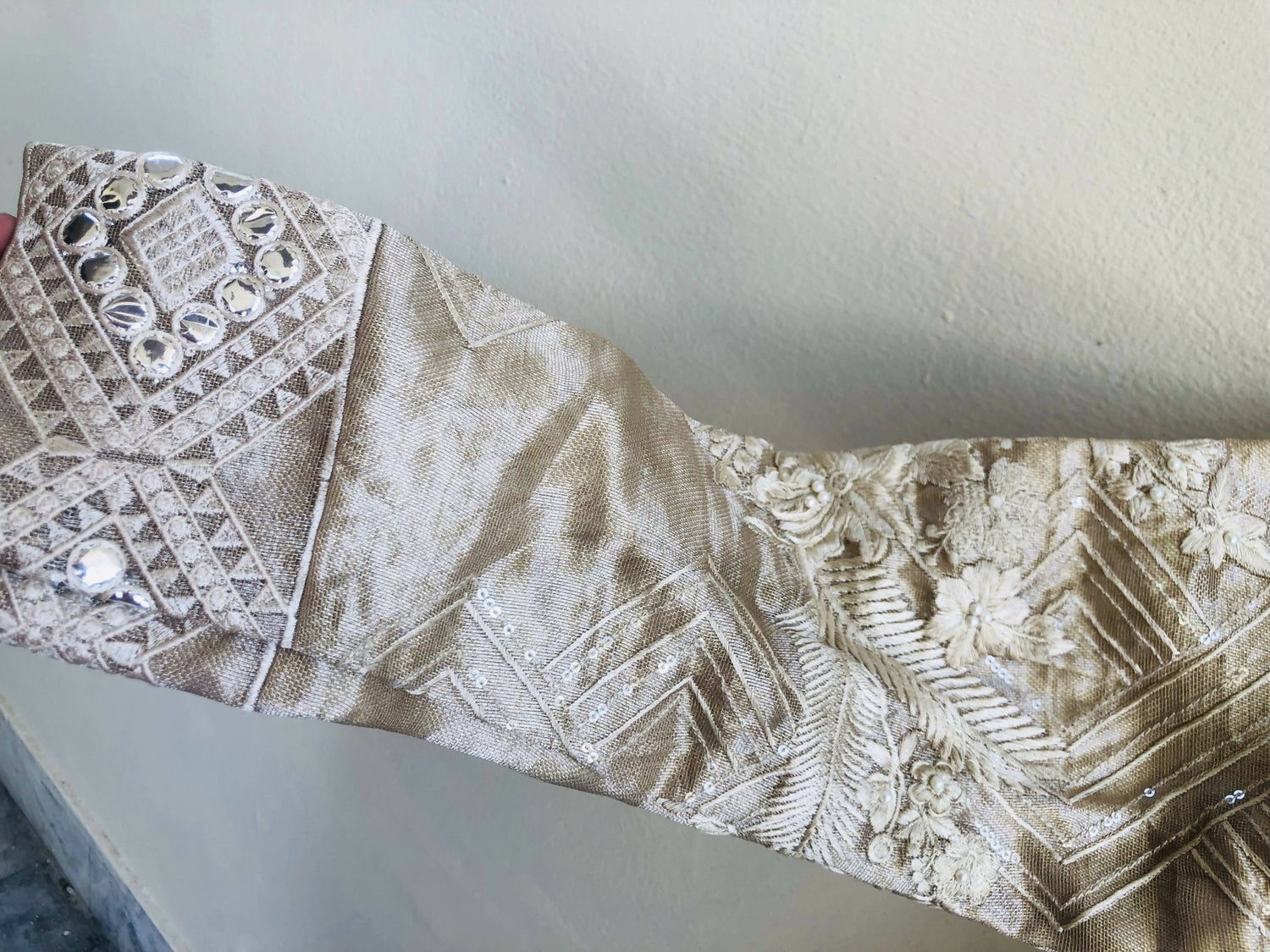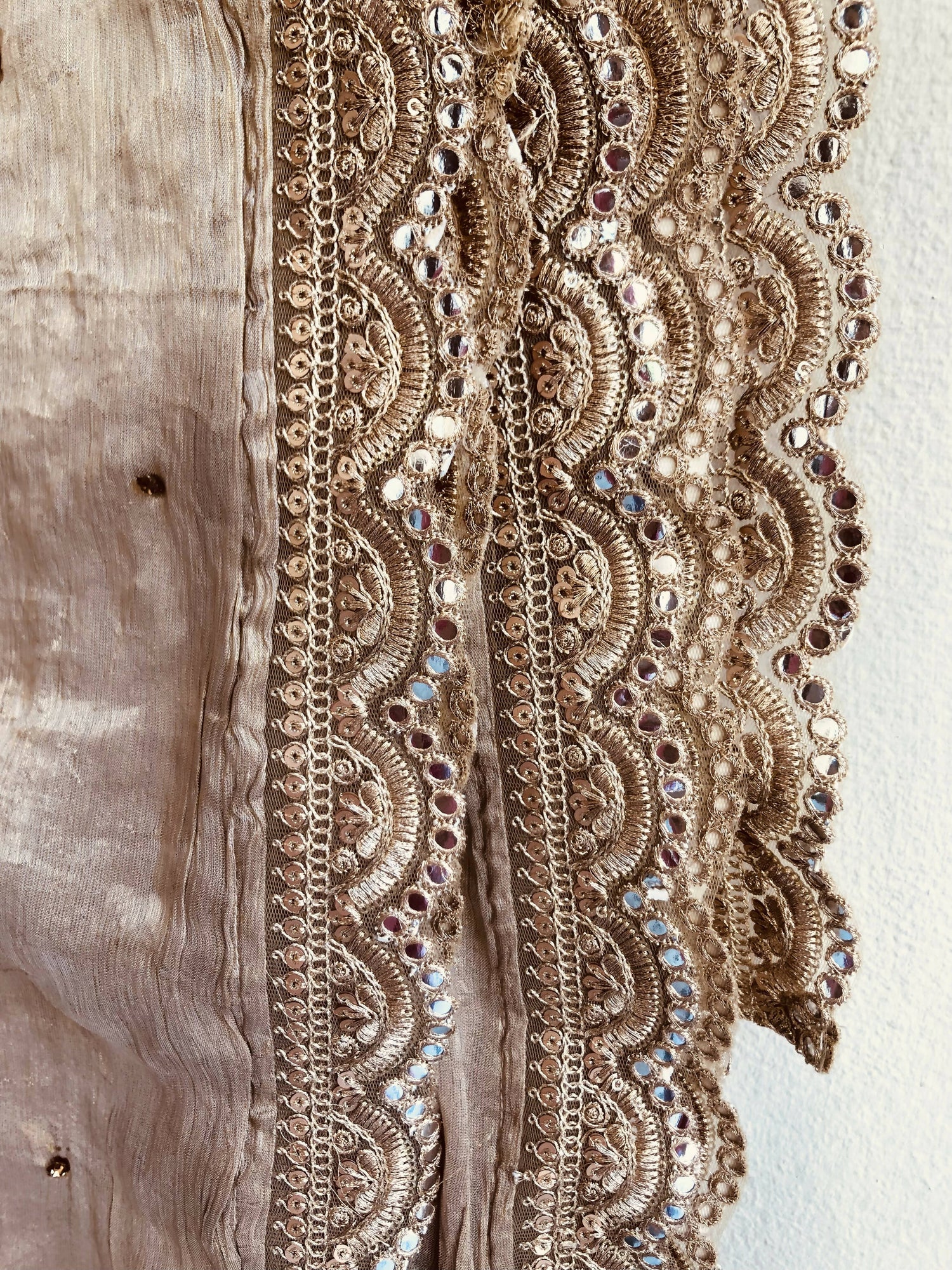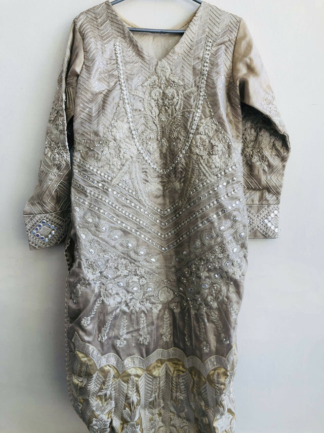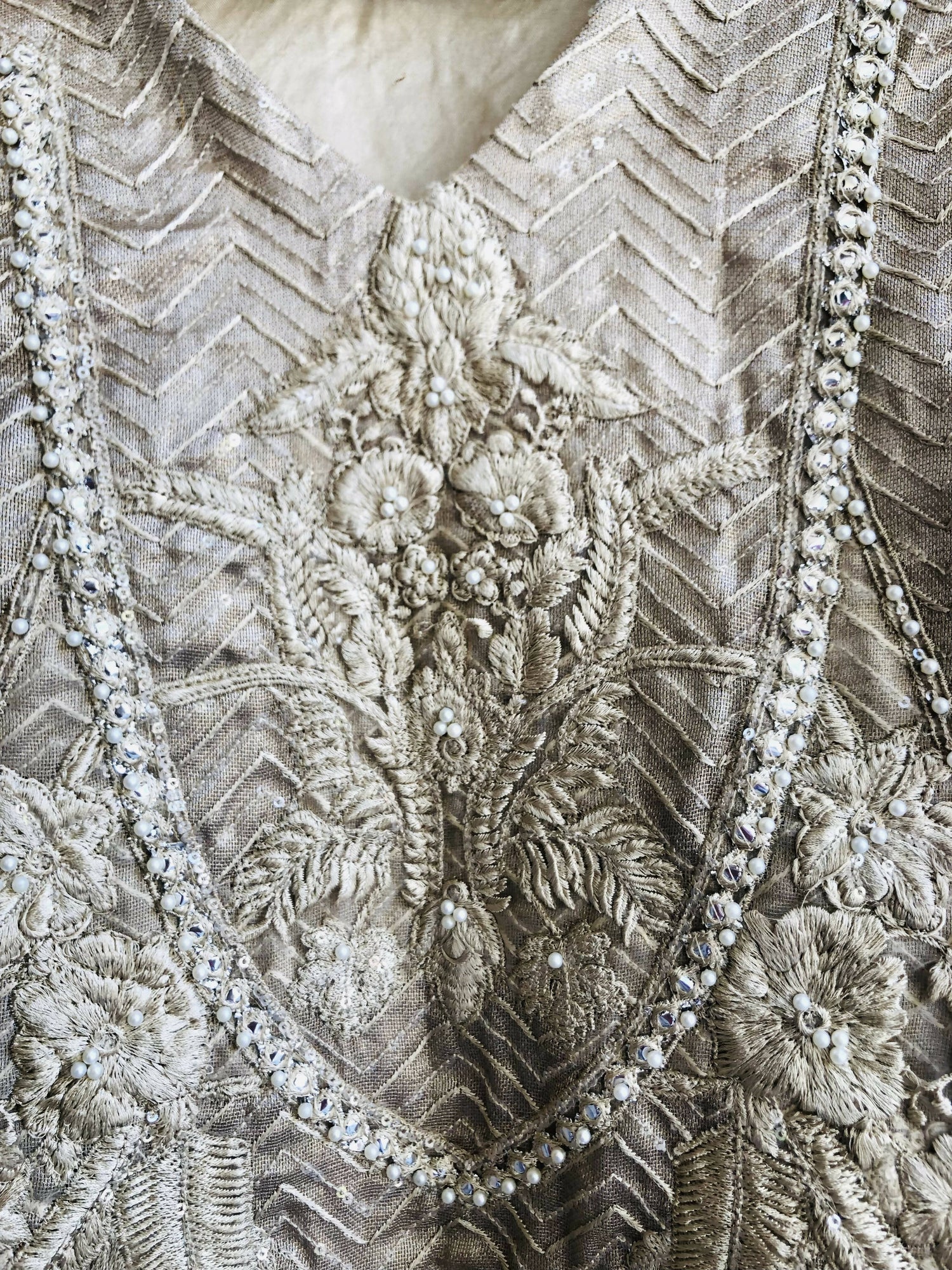| MATERIAL & MEASUREMENT | Embellished and embroidered sequence work cotton net shirt with fancy dupatta and cotton silk trouser condition 10/10, never worn Measurements: Shirt length: 43. Chest: 20 hips 23 Trouser 38 |
