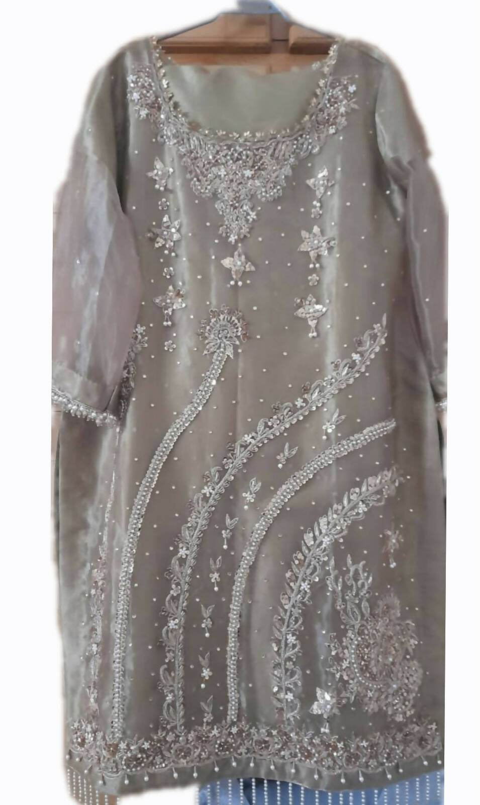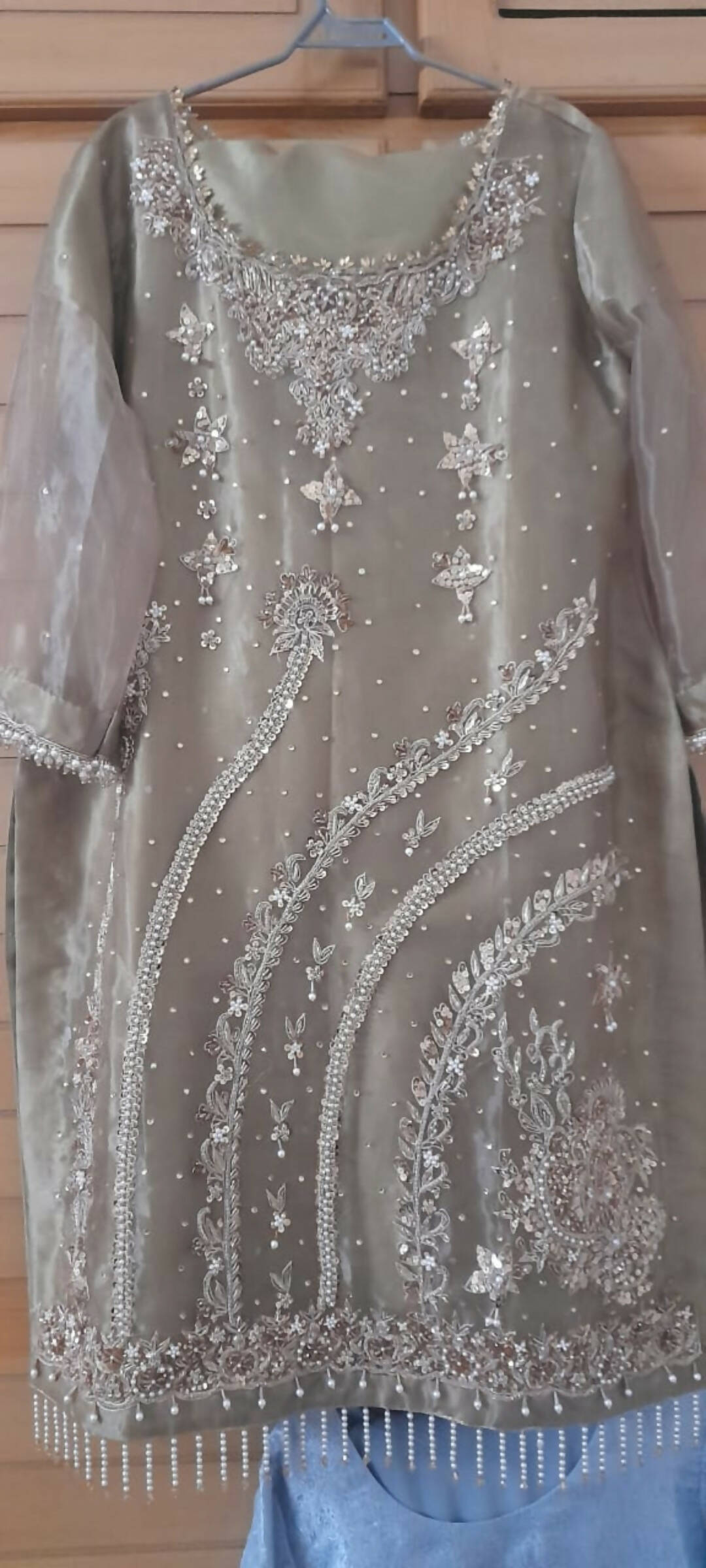 | MATERIAL & MEASUREMENT | Handembroided party wear 3pice suit.. Colour: metallic green Full embroidered organza shirt.. Pure silk shalwar.. Pure organza dupatta with paiping and Latkan lace.. X Large Measurements Length:45 Chest :23 Sleeves:20 |