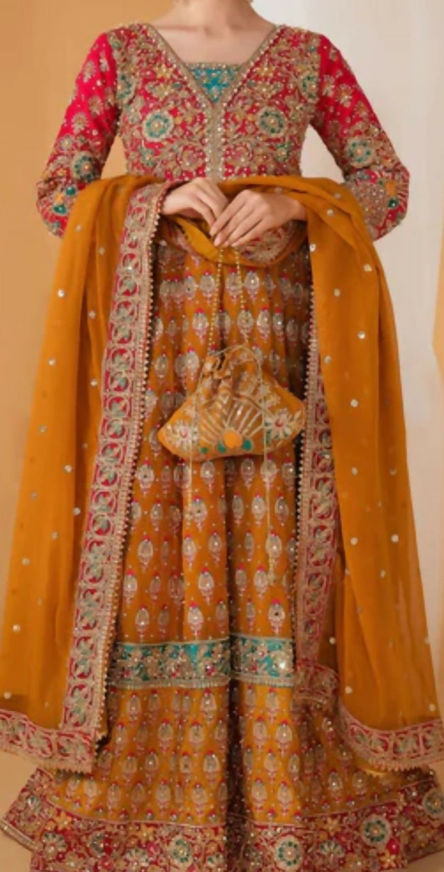 Additional details: Four piece wedding wear in Anarkali style fully embelished and heavy handmade work