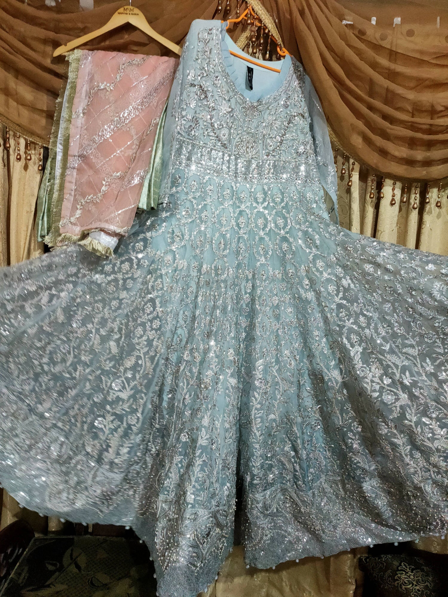 | MATERIAL & MEASUREMENT | Material: Sky blue maxi organza stuff Dupata, maxi, inner trouser Material: Chest 21 Tera 16 Shoulder 10 Bazo length 19 Maxi length 60 |
