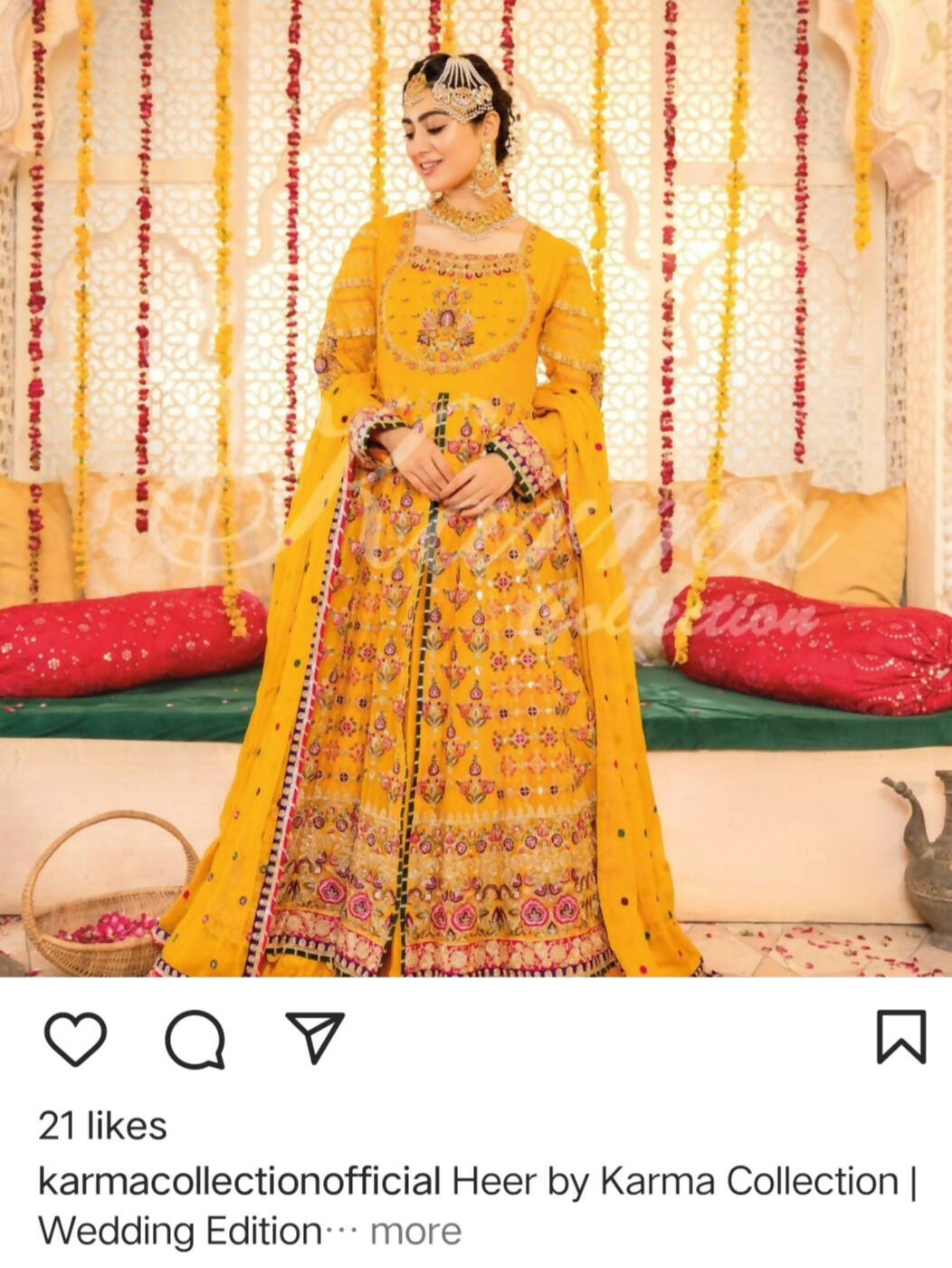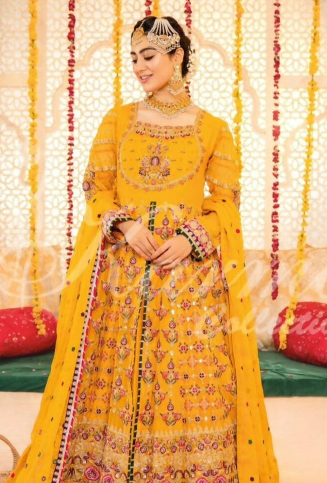 | MATERIAL & MEASUREMENT | Material:pure shiffon Color:mustured/yellow Frock length:58 Waist:18 Sleeves length:21 |