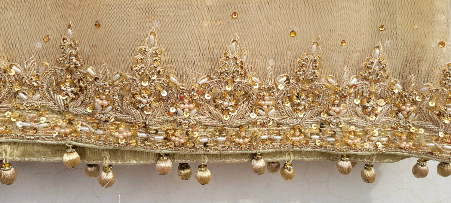 It has a net duppata with a heavy border embellished with stones, qora and balls on it.