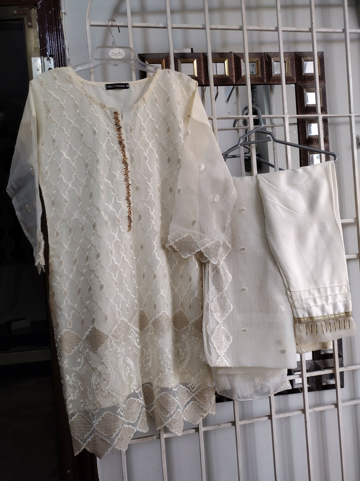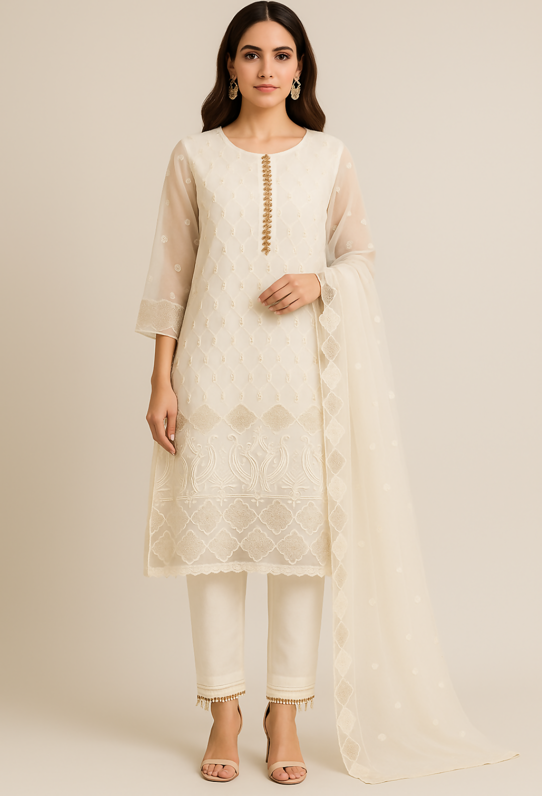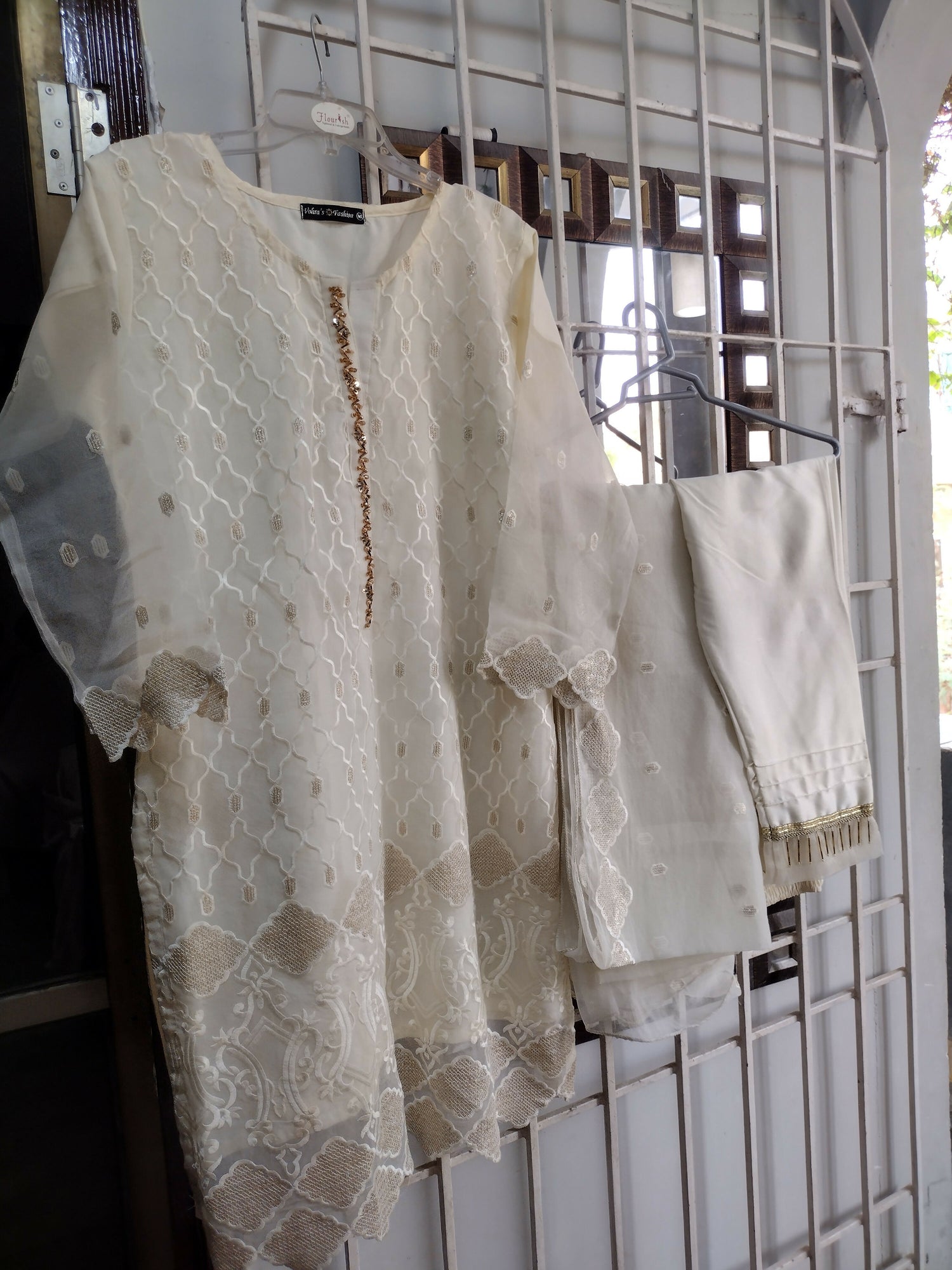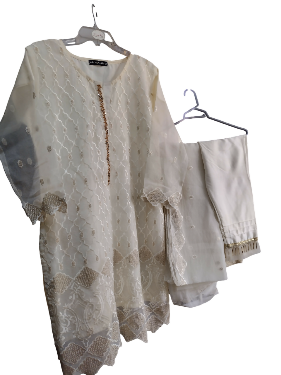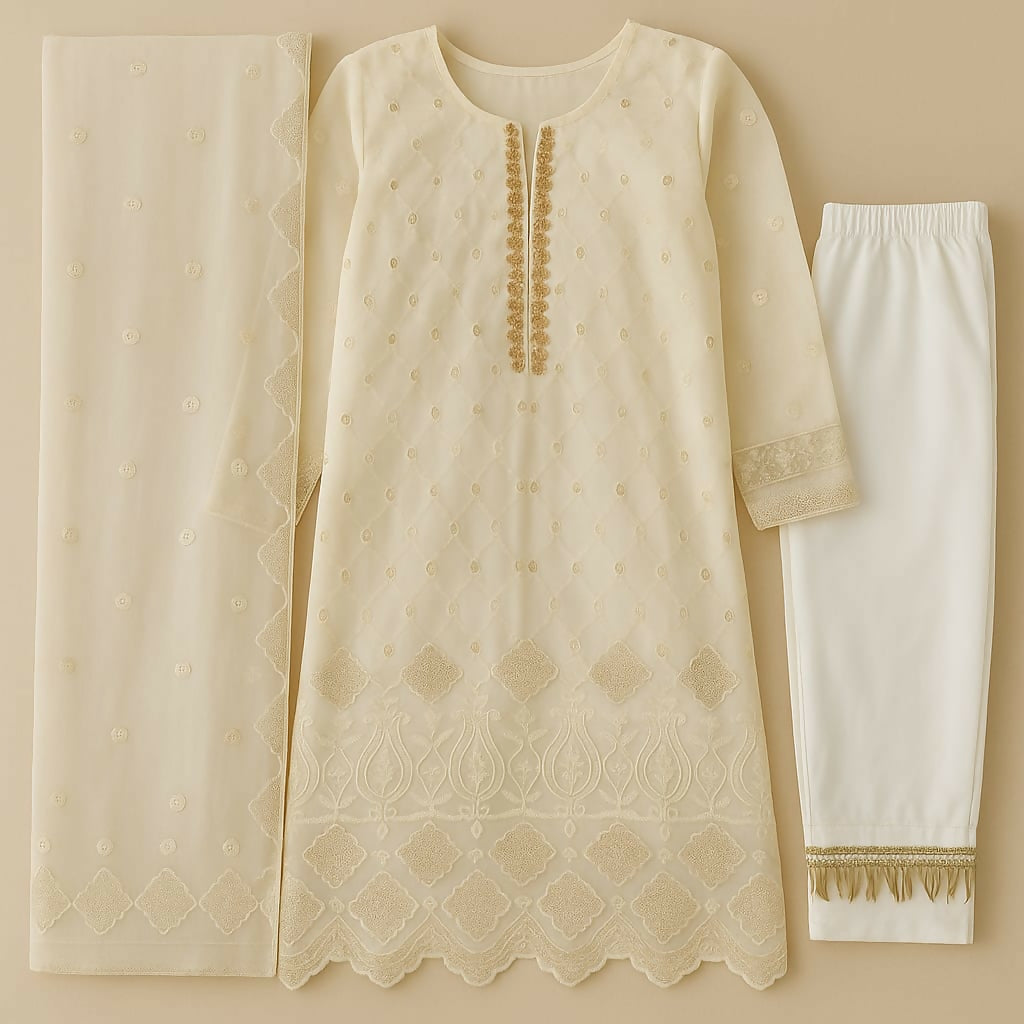 Ivory Tissue 3 PC Suit | Women Locally Made Formals | Medium | Worn Once