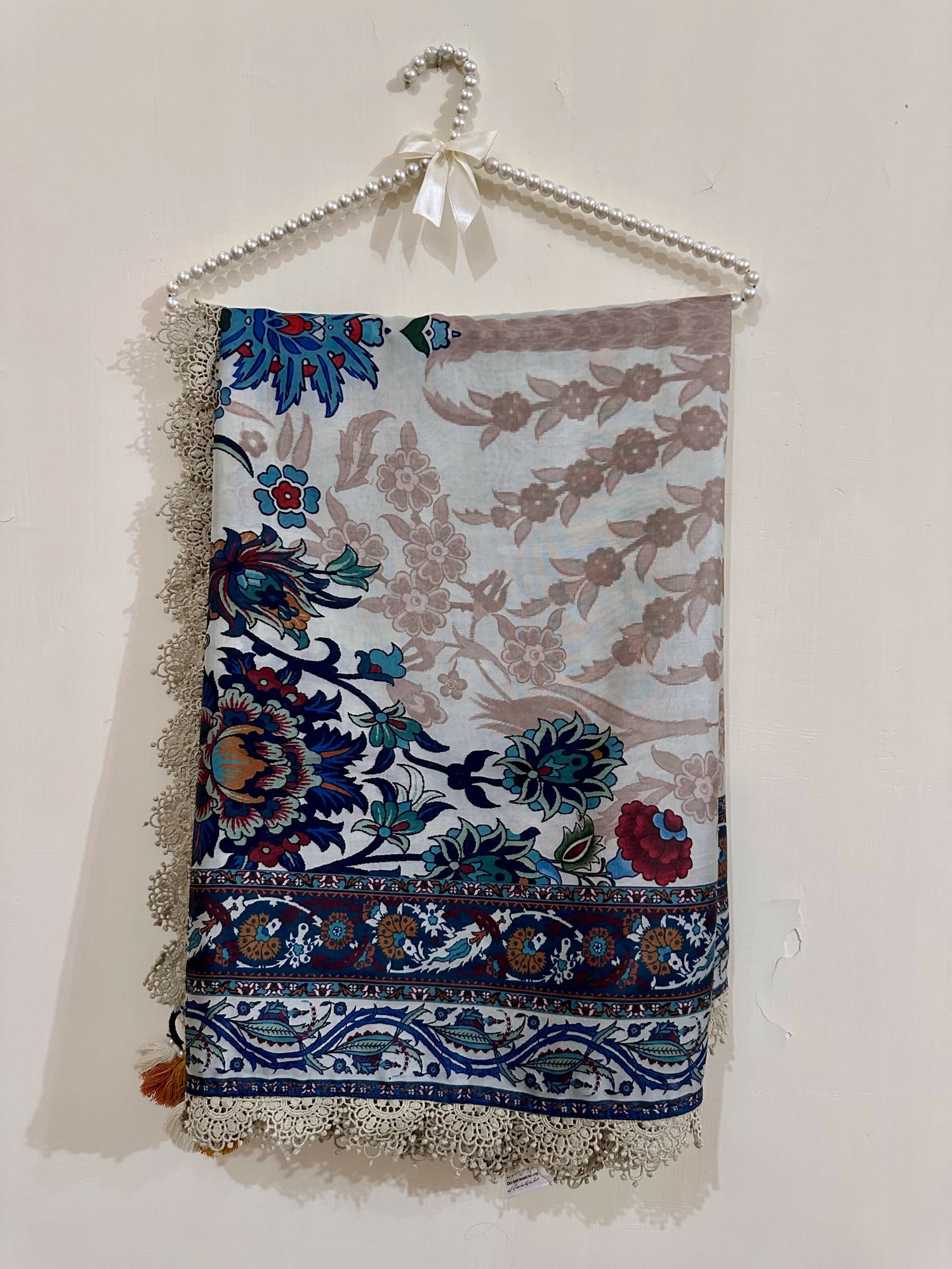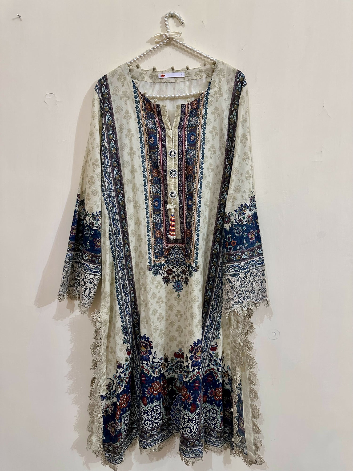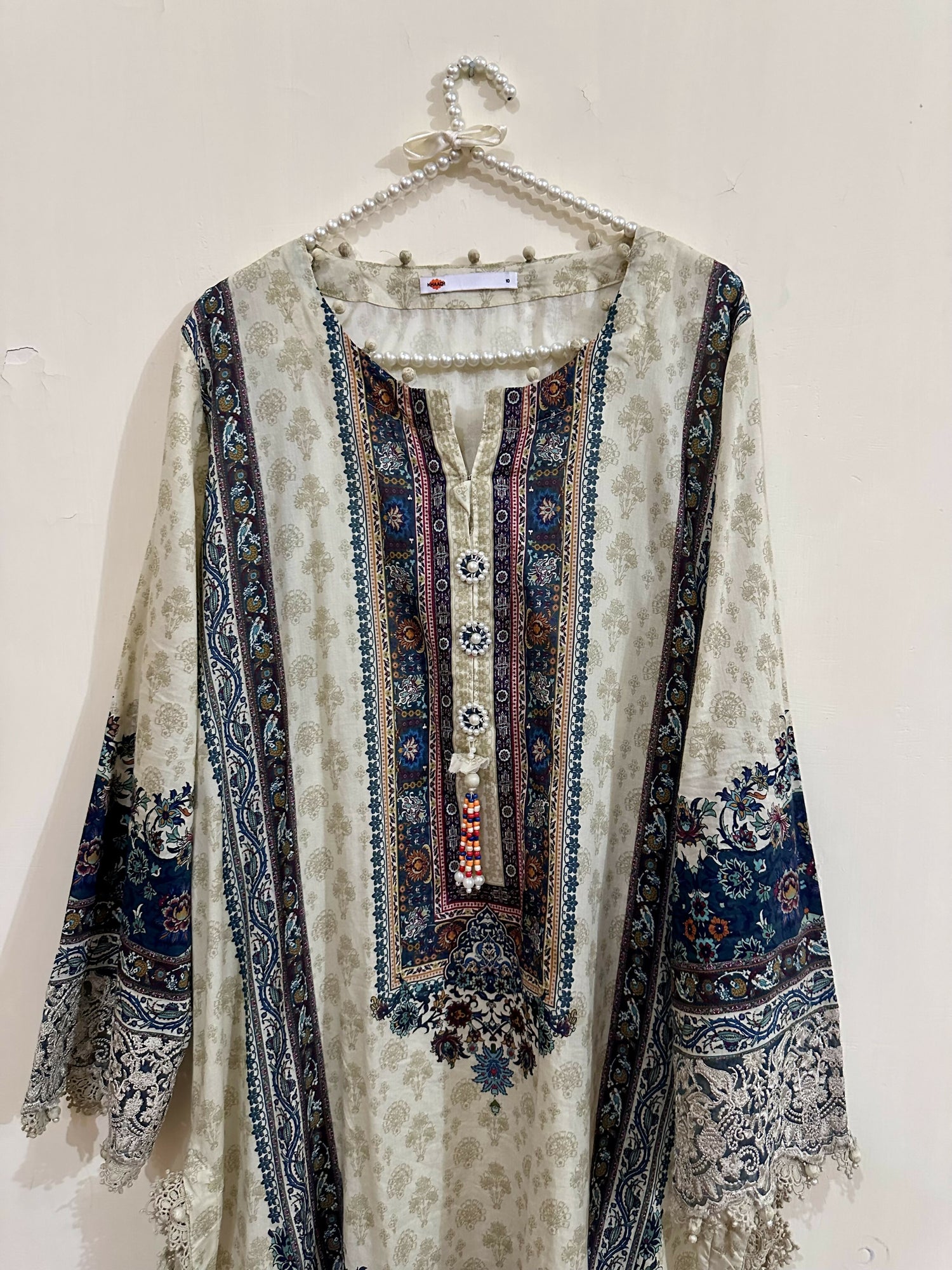 | MATERIAL & MEASUREMENT | Fabric / Material: lawn with silk dupatta Measurement : Chest: 20 Shoulder: 15 Length: 40 Trouser length: 34 |