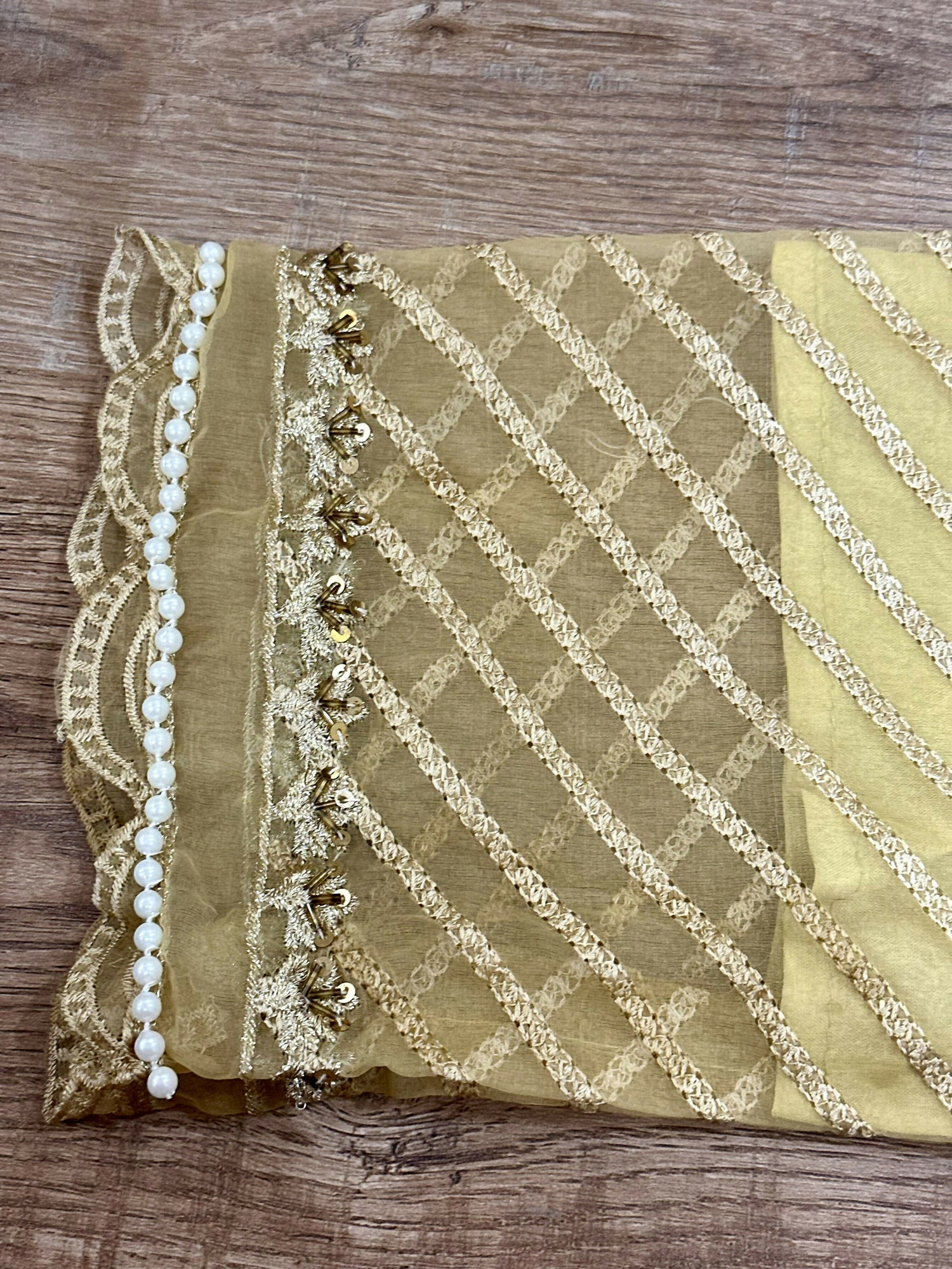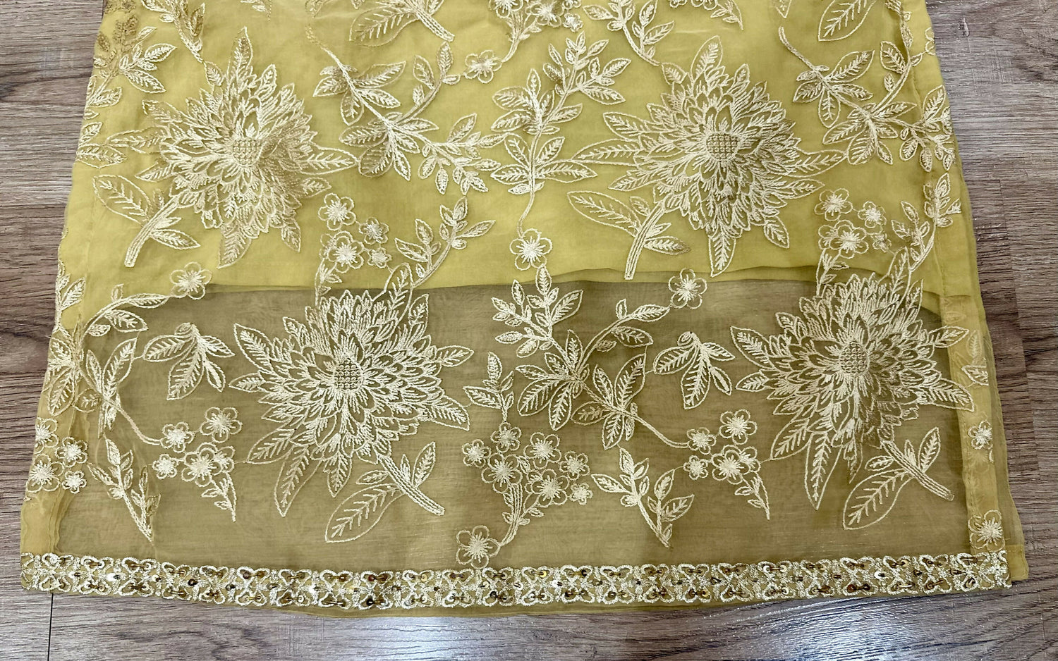 Fabric: Organza shirt with embroidery on front and sleeves ; embellishments on neck, daman and sleeves ;back is plain.