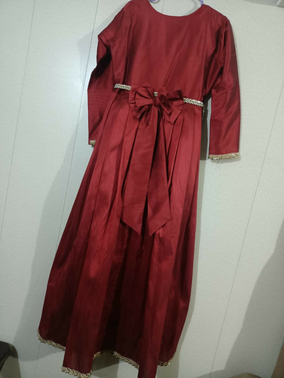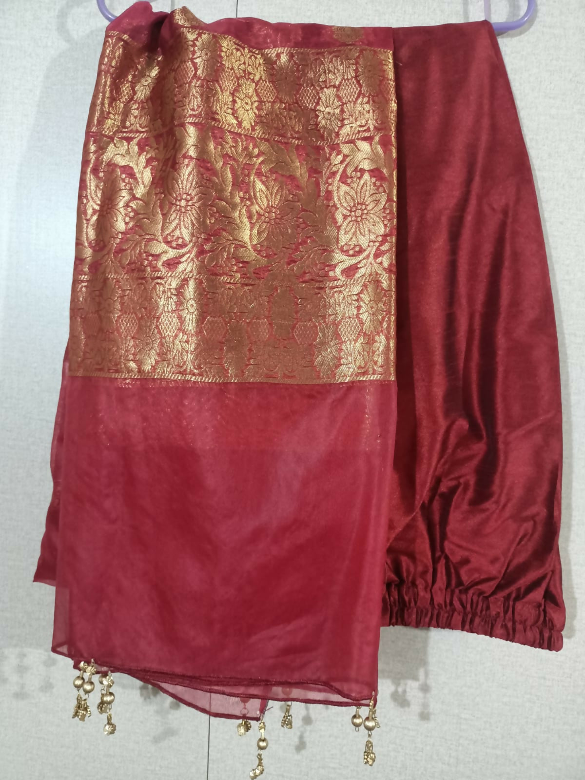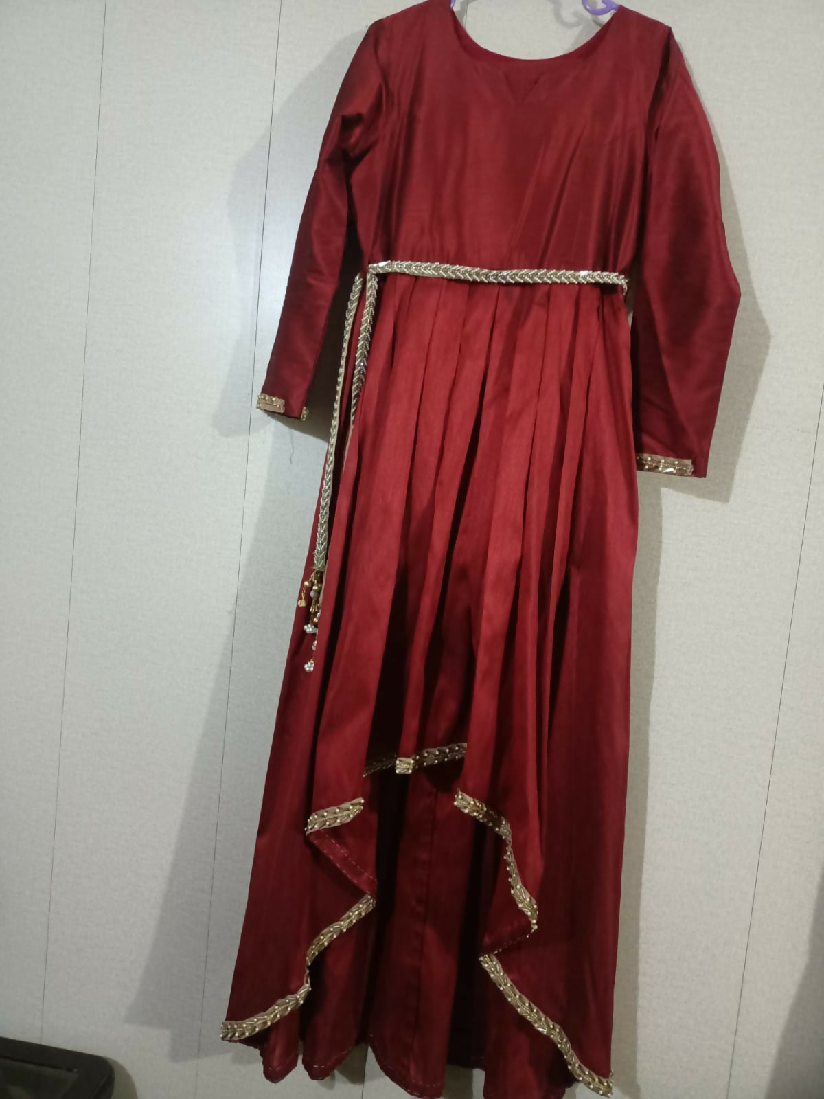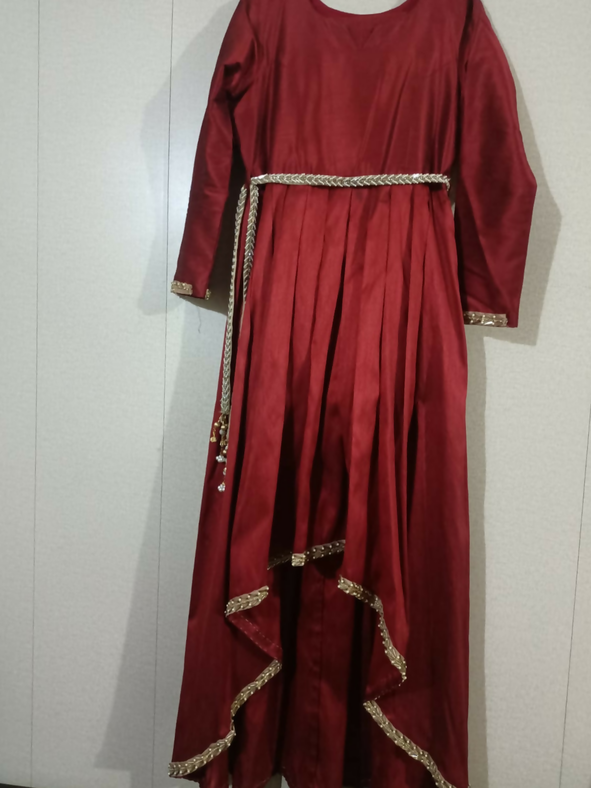 MATERIAL & MEASUREMENT Fabric: Raw silk Measurements Length 58 Flair 90 Shoulder 14.5 Chest 34 Sleeves 22 Marroo raw silk long tail gown with raw silk pent trouser and organza dupata with bow tie on back and with pearl embellished belt