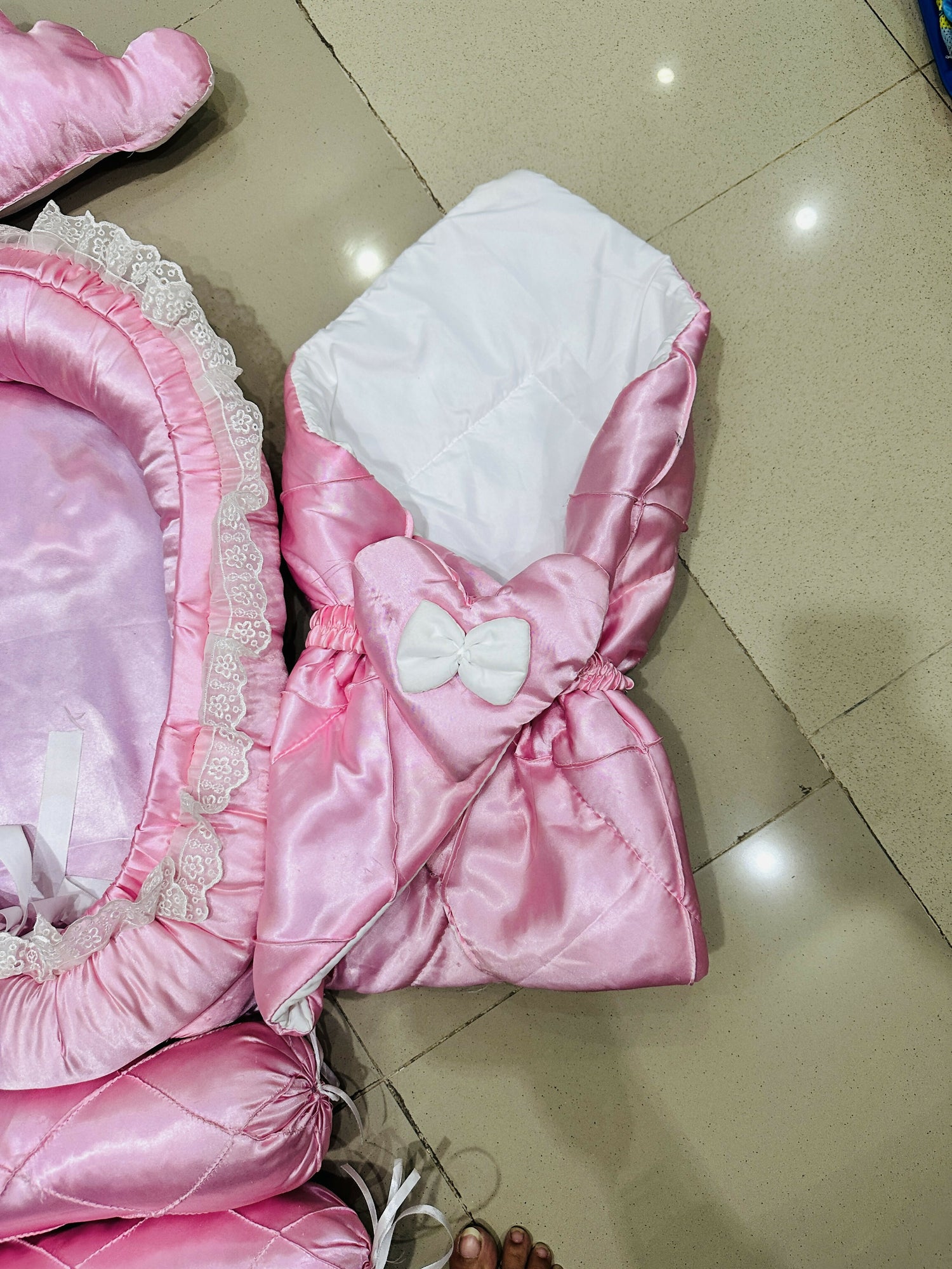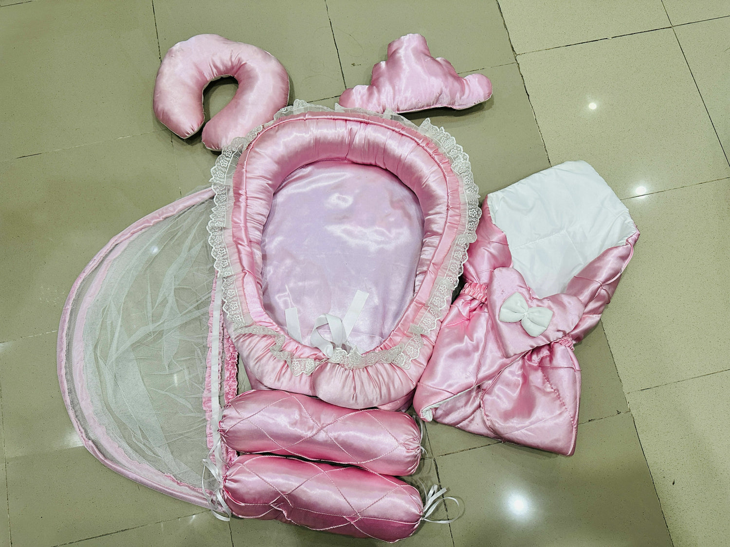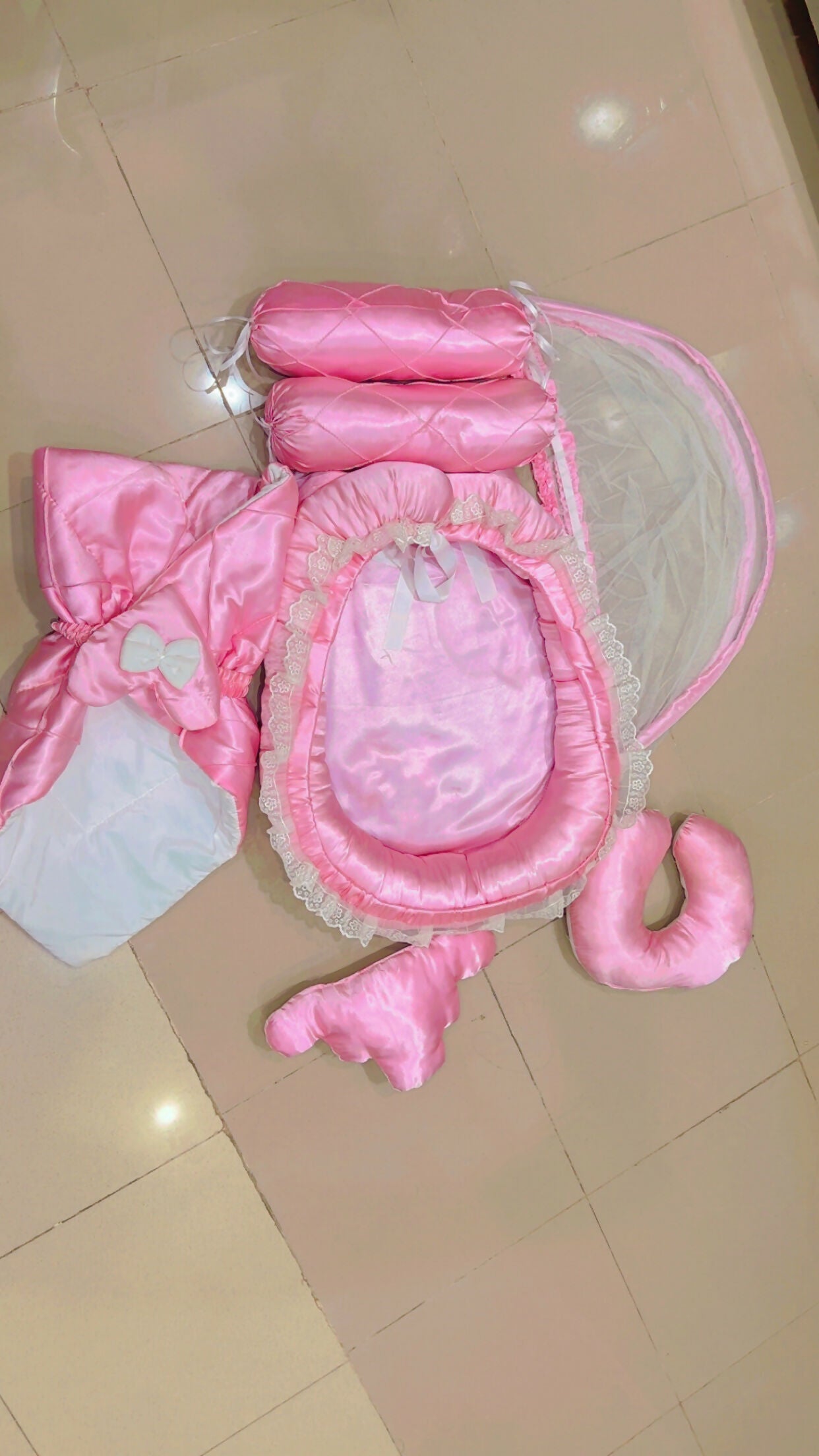 | MATERIAL & MEASUREMENT | New born to 6 months 2 pillow 1 head pilow 1 cover sheet with band 1 net 1 quilted be |