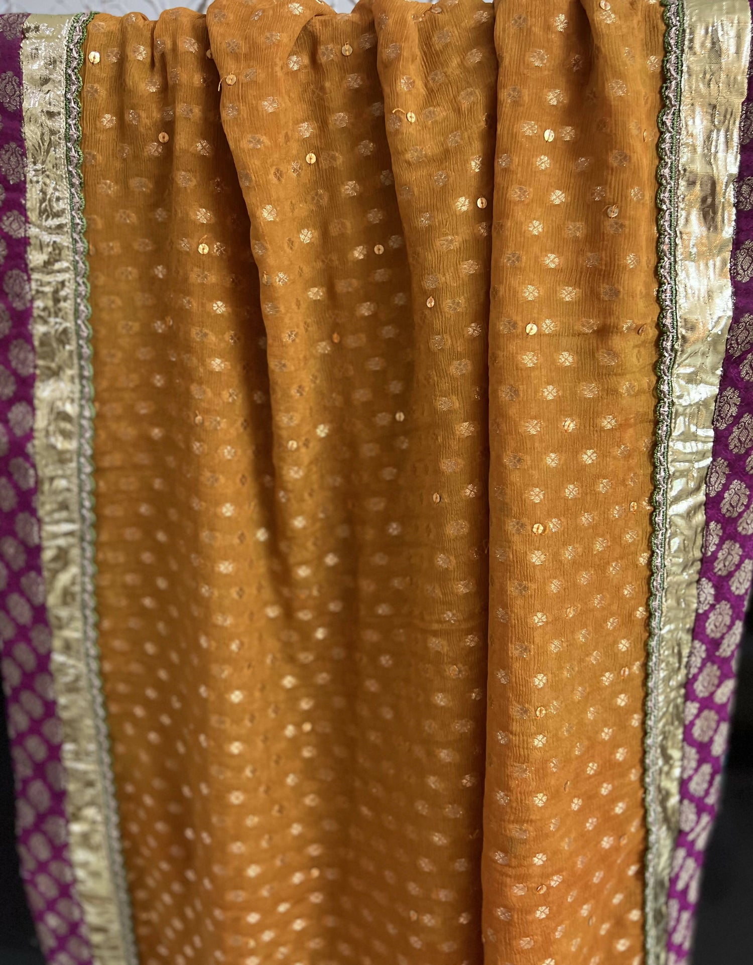 MATERIAL & MEASUREMENT Material of shirt and trouser : jamawar Embroidery: thread and starry Dupatta finishing with 2 colors or tassels Measurement: Length: 54 Chest: 24