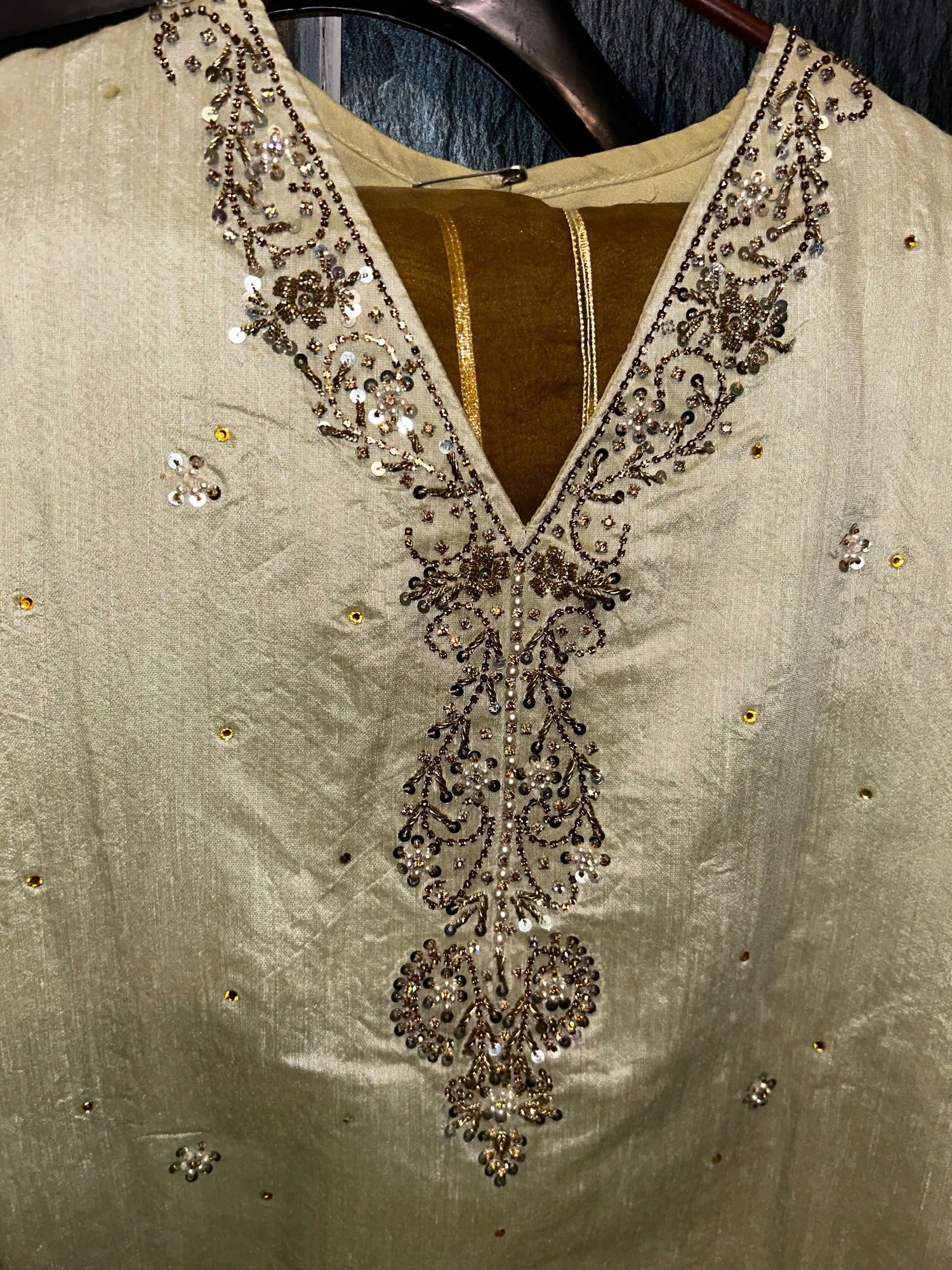 Olive Gold Embroidered Silk Shirt and Dupatta Set | Women Locally Made Formals | Small | Worn Once is backordered and will ship as soon as it is back in stock.