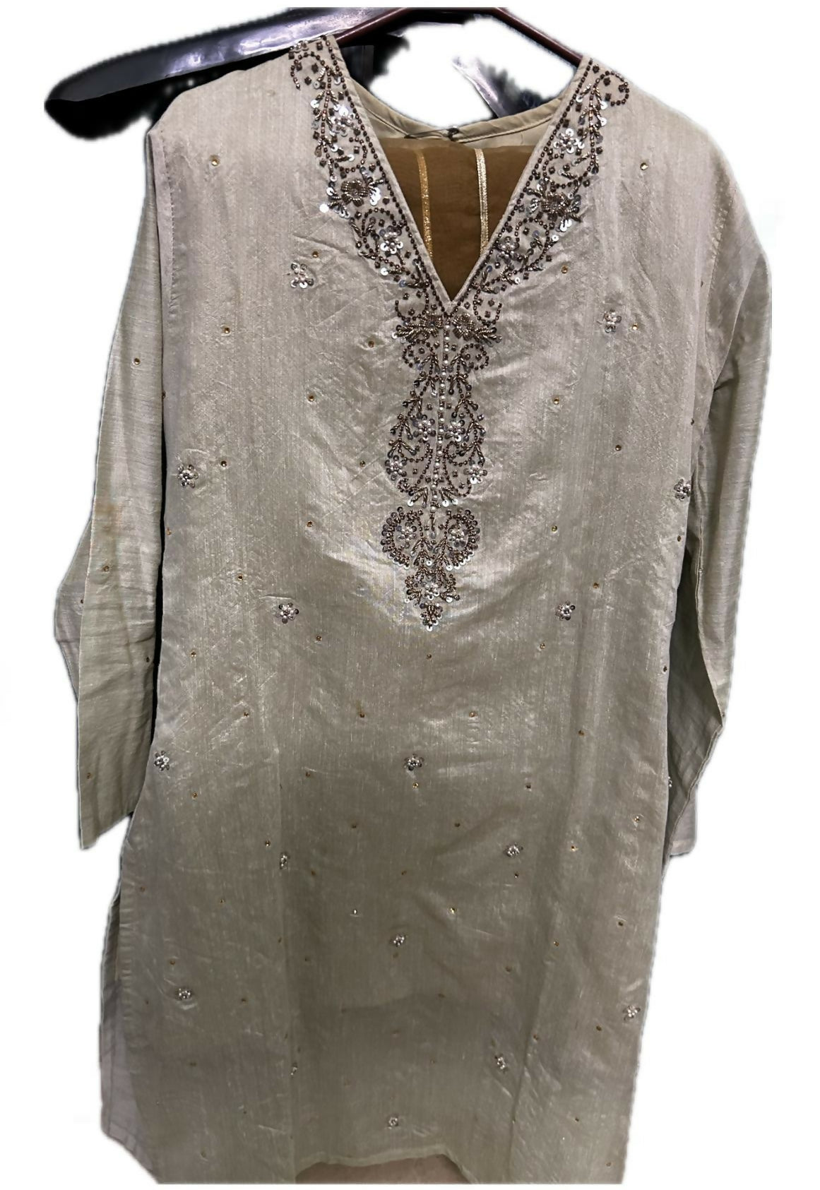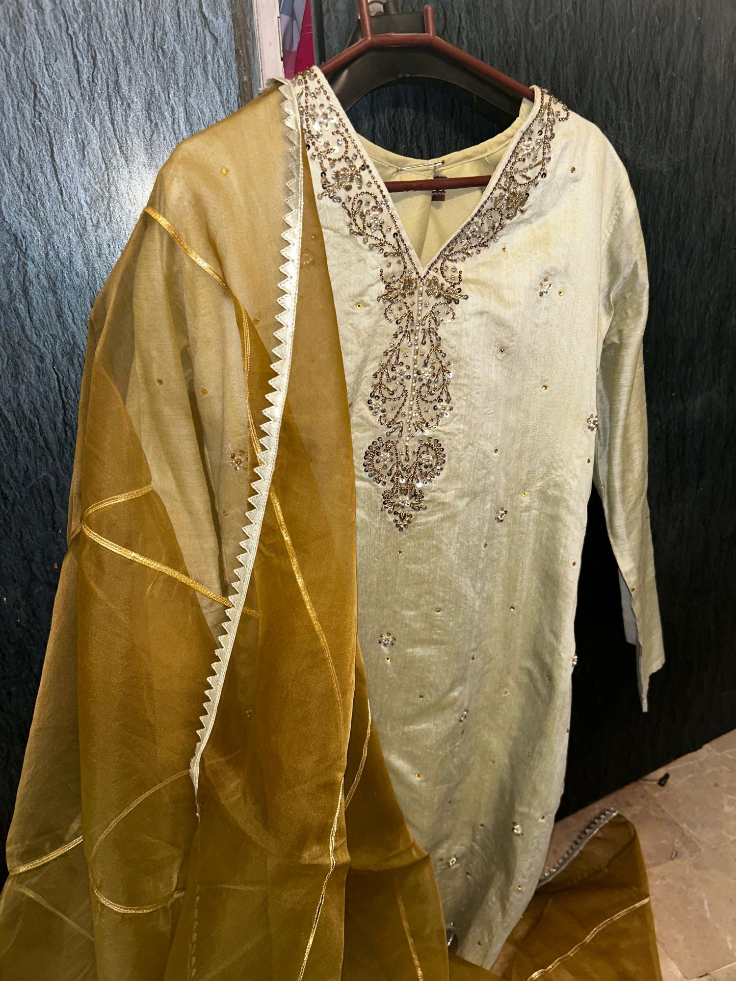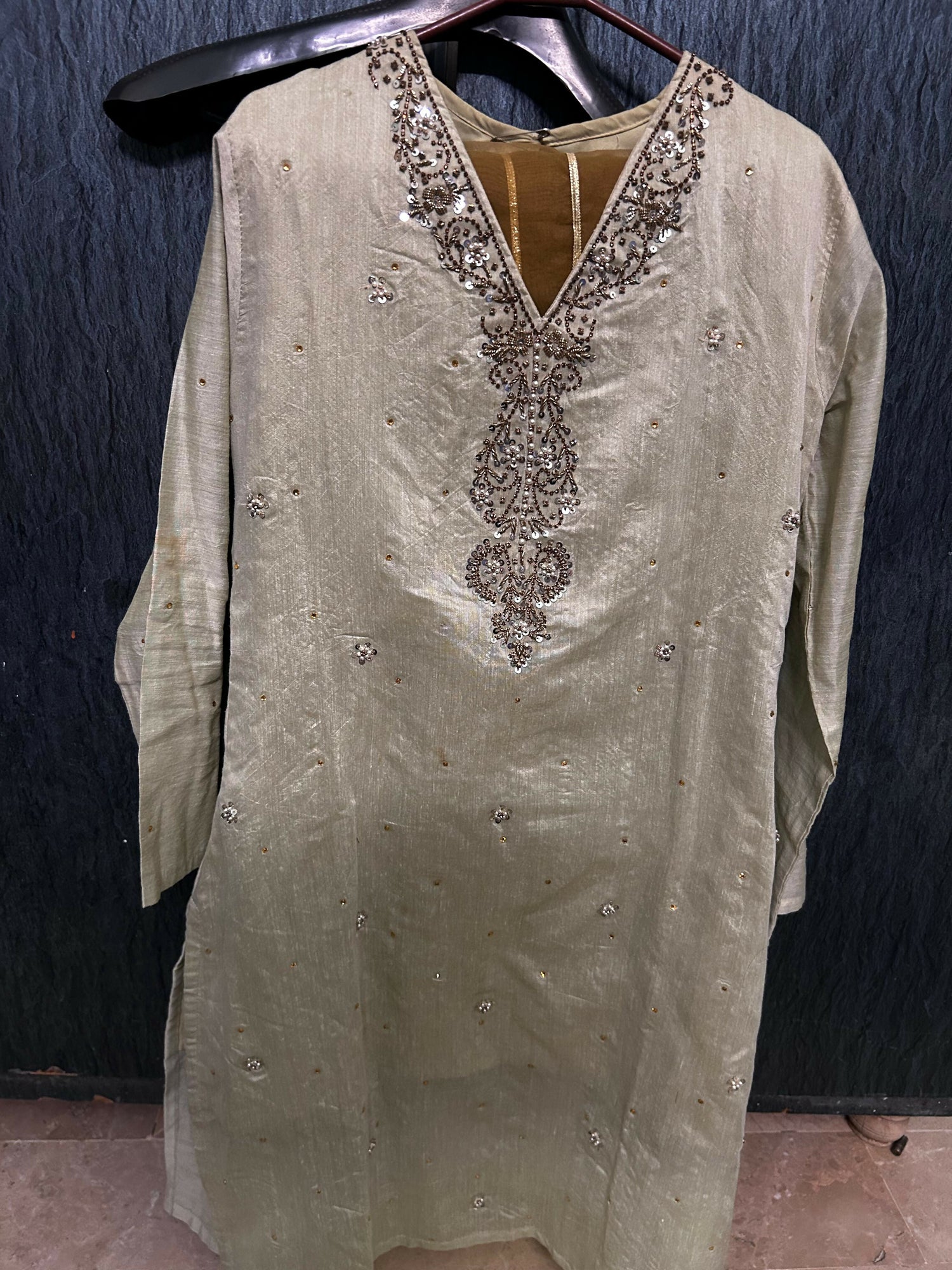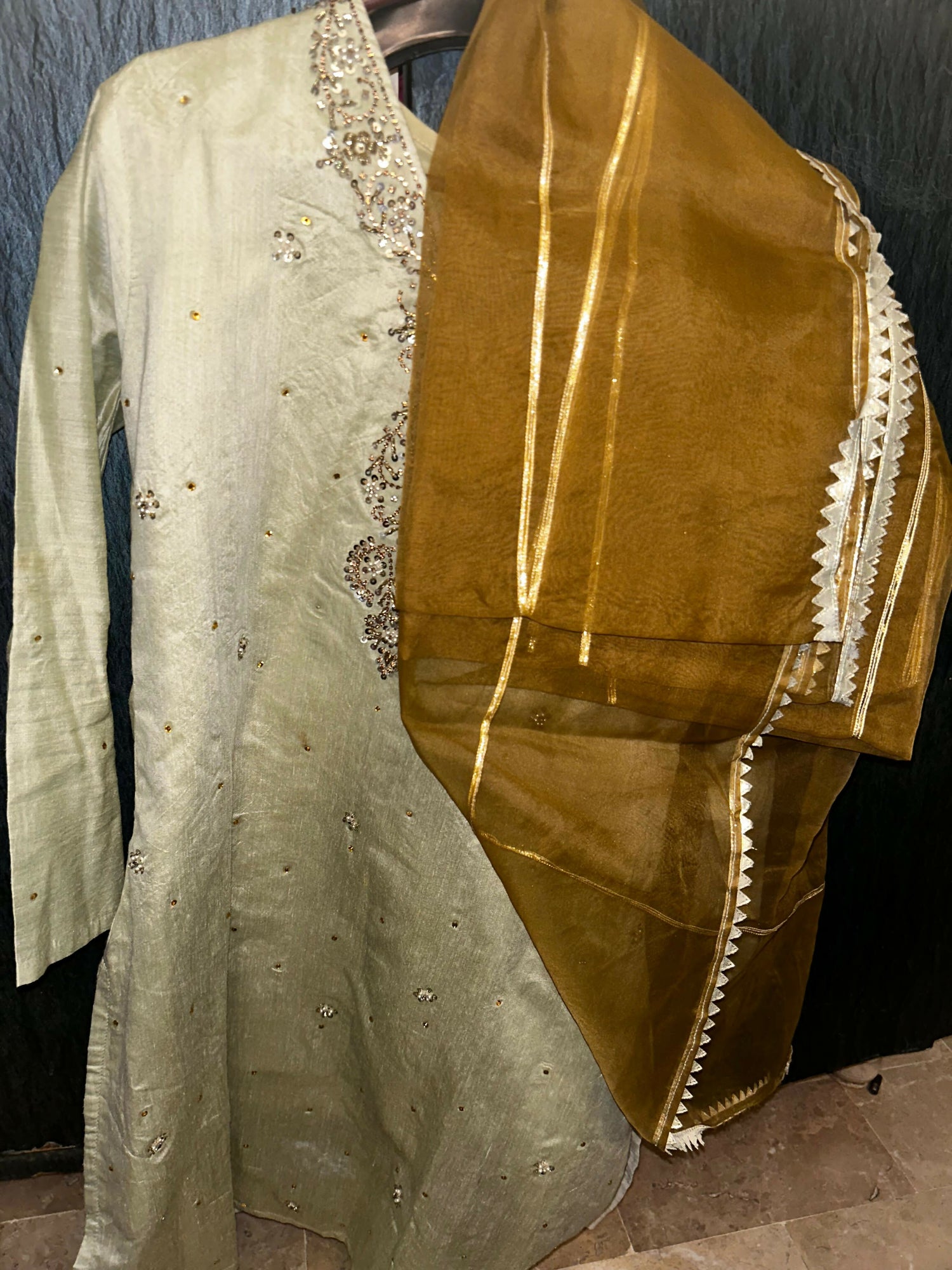 Olive Gold Embroidered Silk Shirt and Dupatta Set | Women Locally Made Formals | Small | Worn Once
