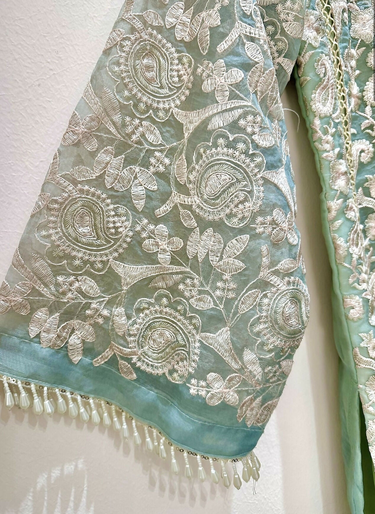 Fabric: Organza kurta with heavy embroidery on front and sleeves. Back is plain. Tussel lace at daman and sleeves.