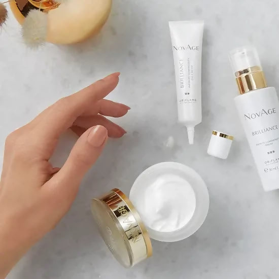 NovAge Brilliance Infinite Luminosity Day Cream is designed to even-out the complexion and protect against major skin tone discolourations and the triggers that cause them for a radiant and healthy skin tone.