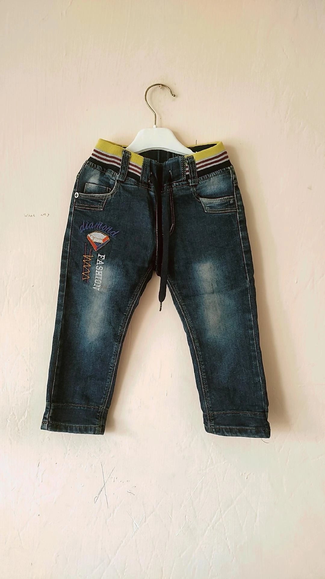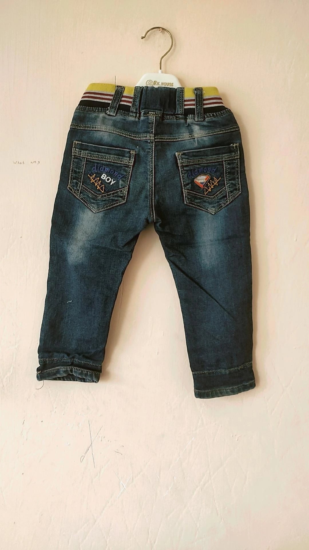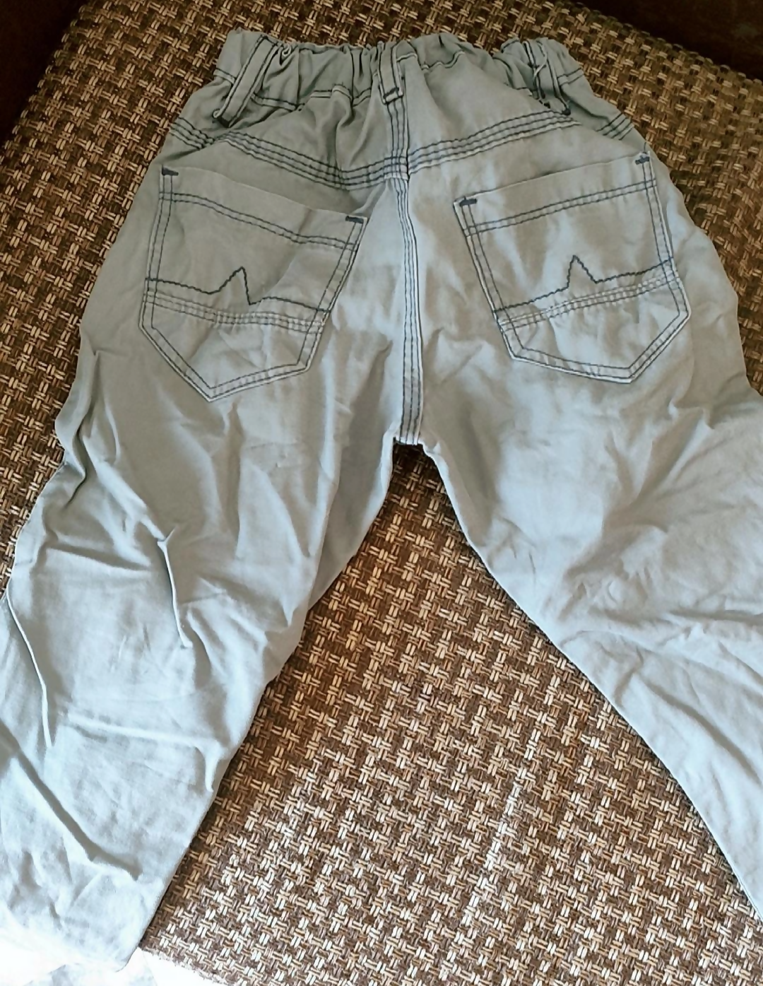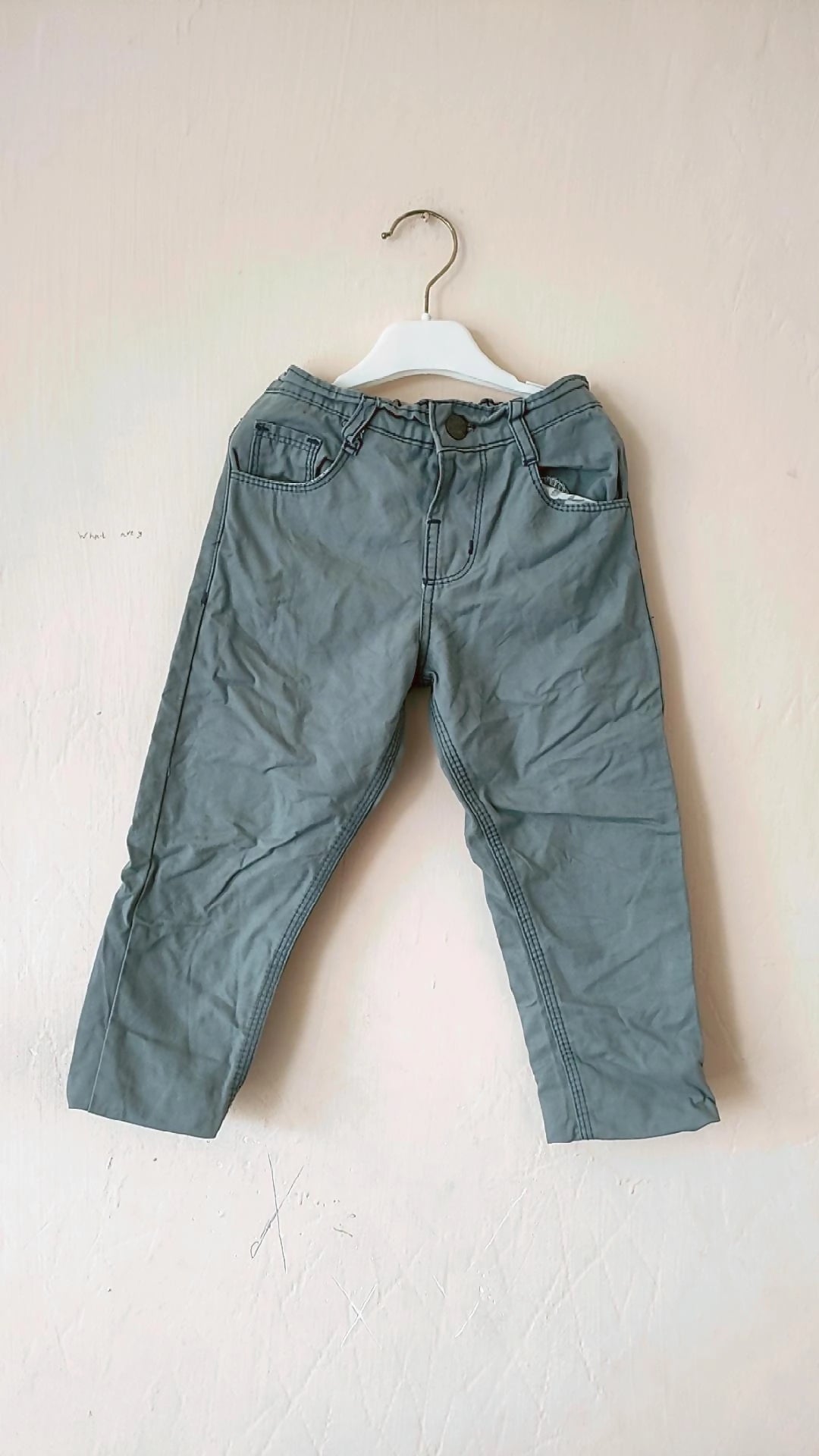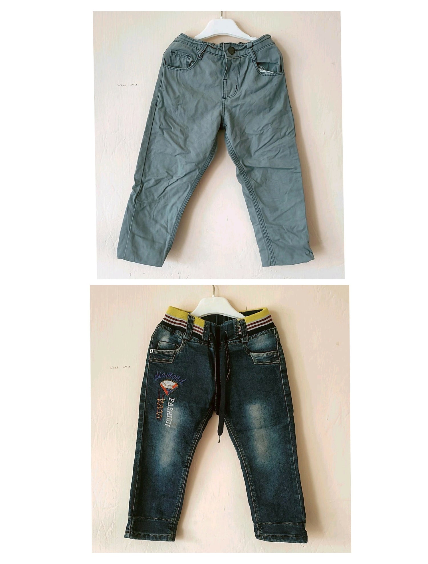 | MATERIAL & MEASUREMENT | Size: Medium (3-4 years) Blue jeans Length 19" Waist 8.5" Grey pant Length 22.5" Waist 8.5" Material: Jeans & cotton |