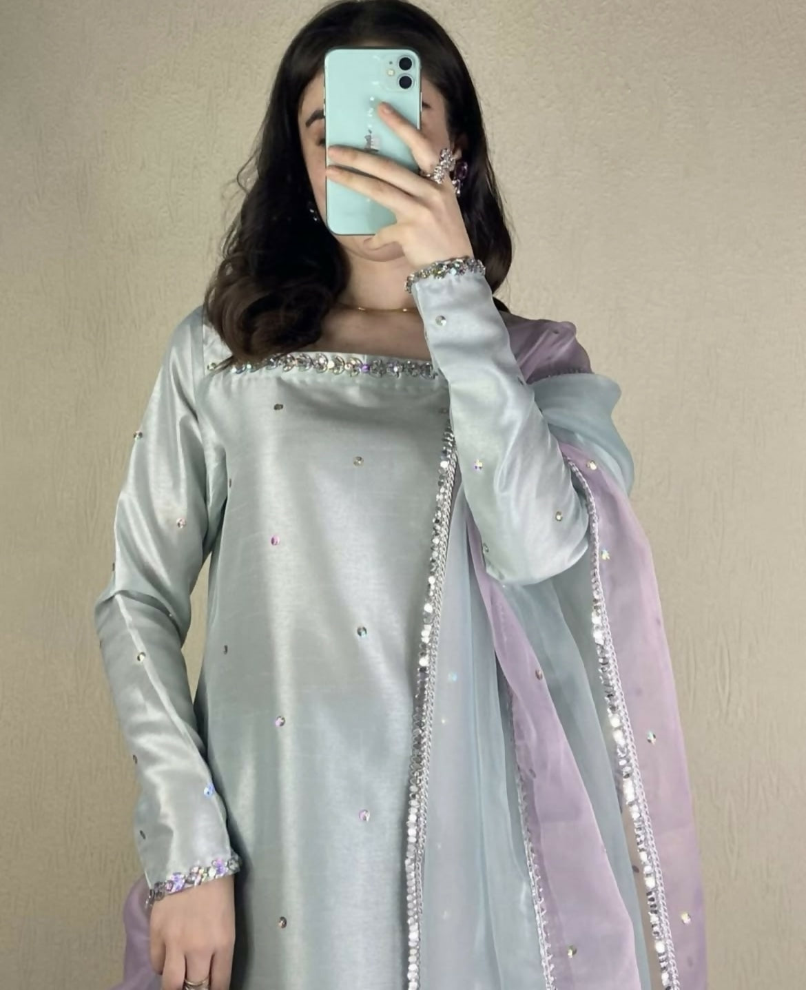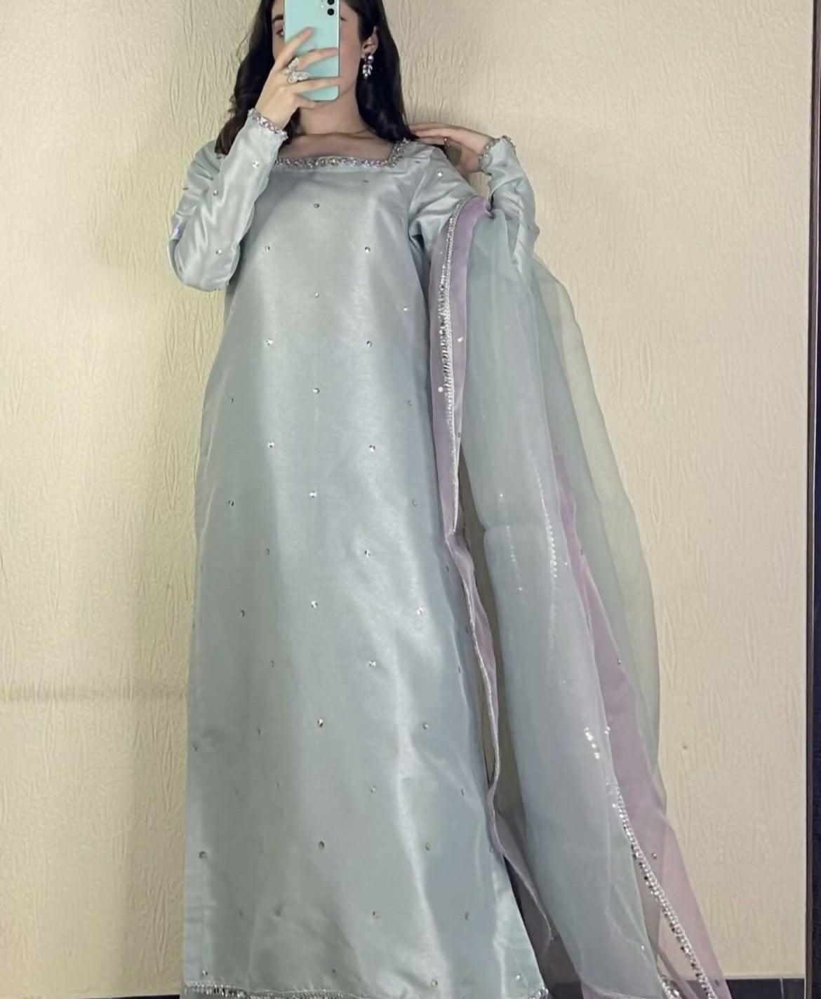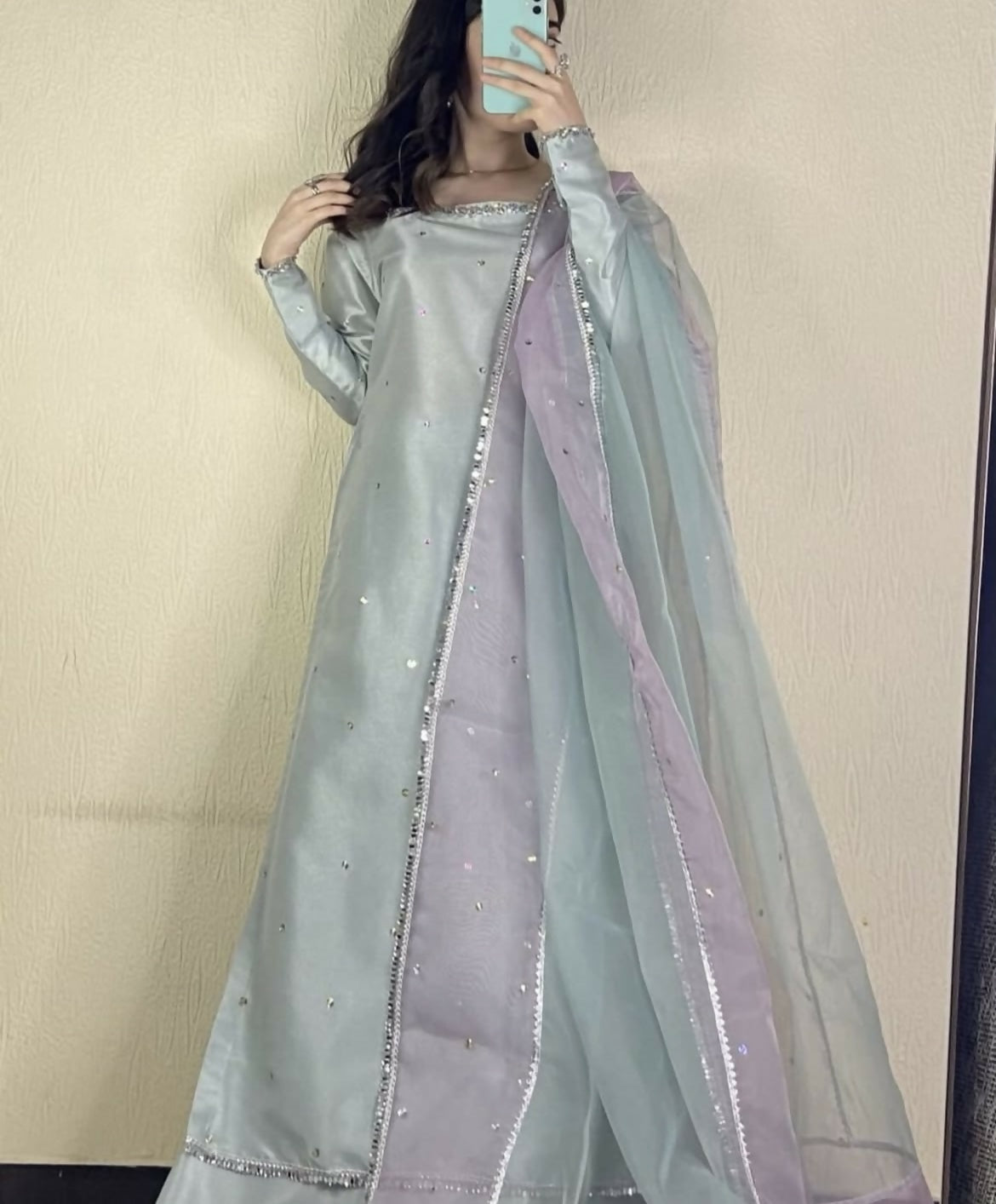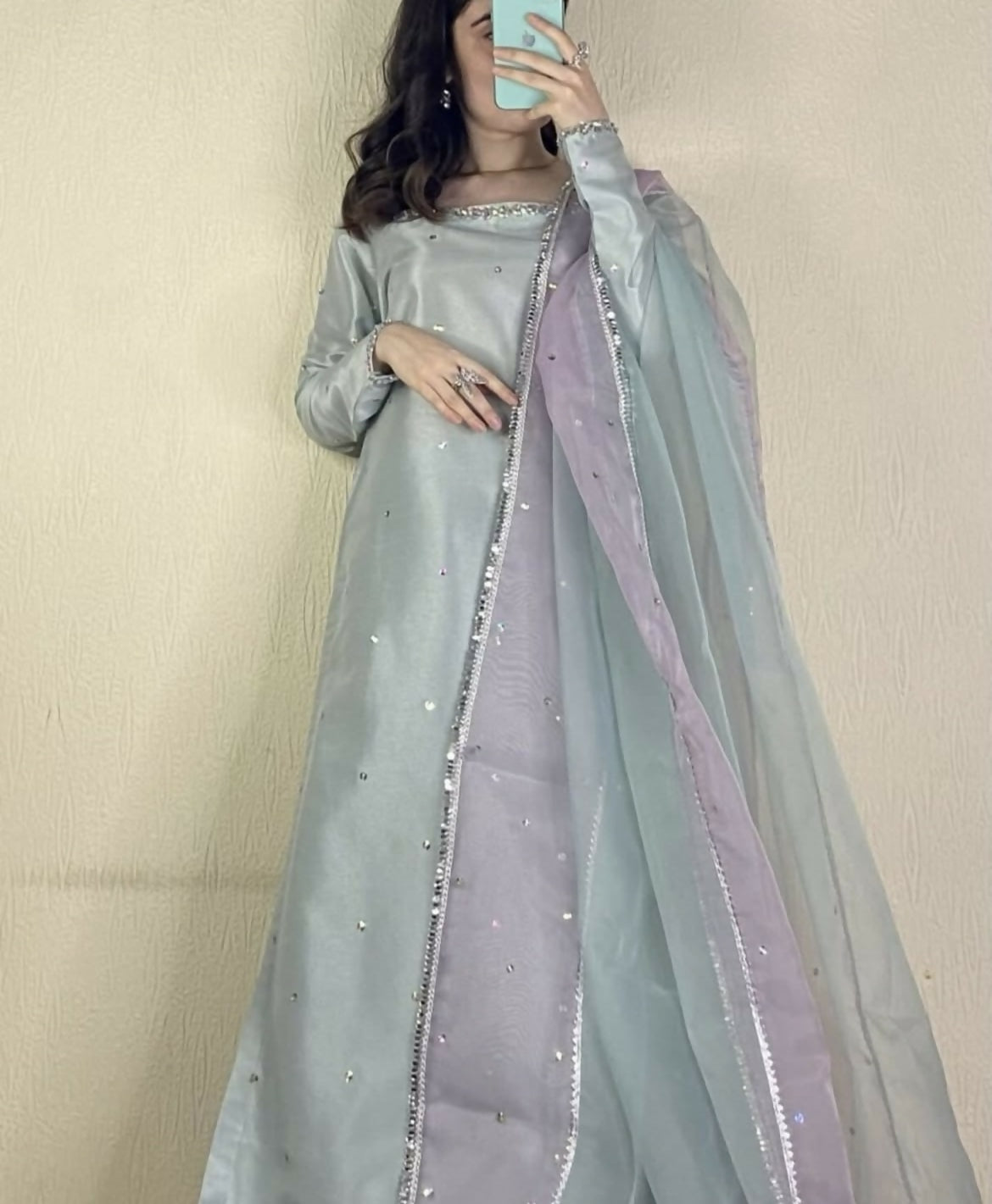 This elegant 3-piece ensemble features a pastel blue straight long shirt, a dual-toned lavender and blue organza dupatta, and a matching trouser. Delicate crystal embellishments and sequins are scattered across the shirt and dupatta for a subtle shimmer, making it ideal for festive and semi-formal occasions.