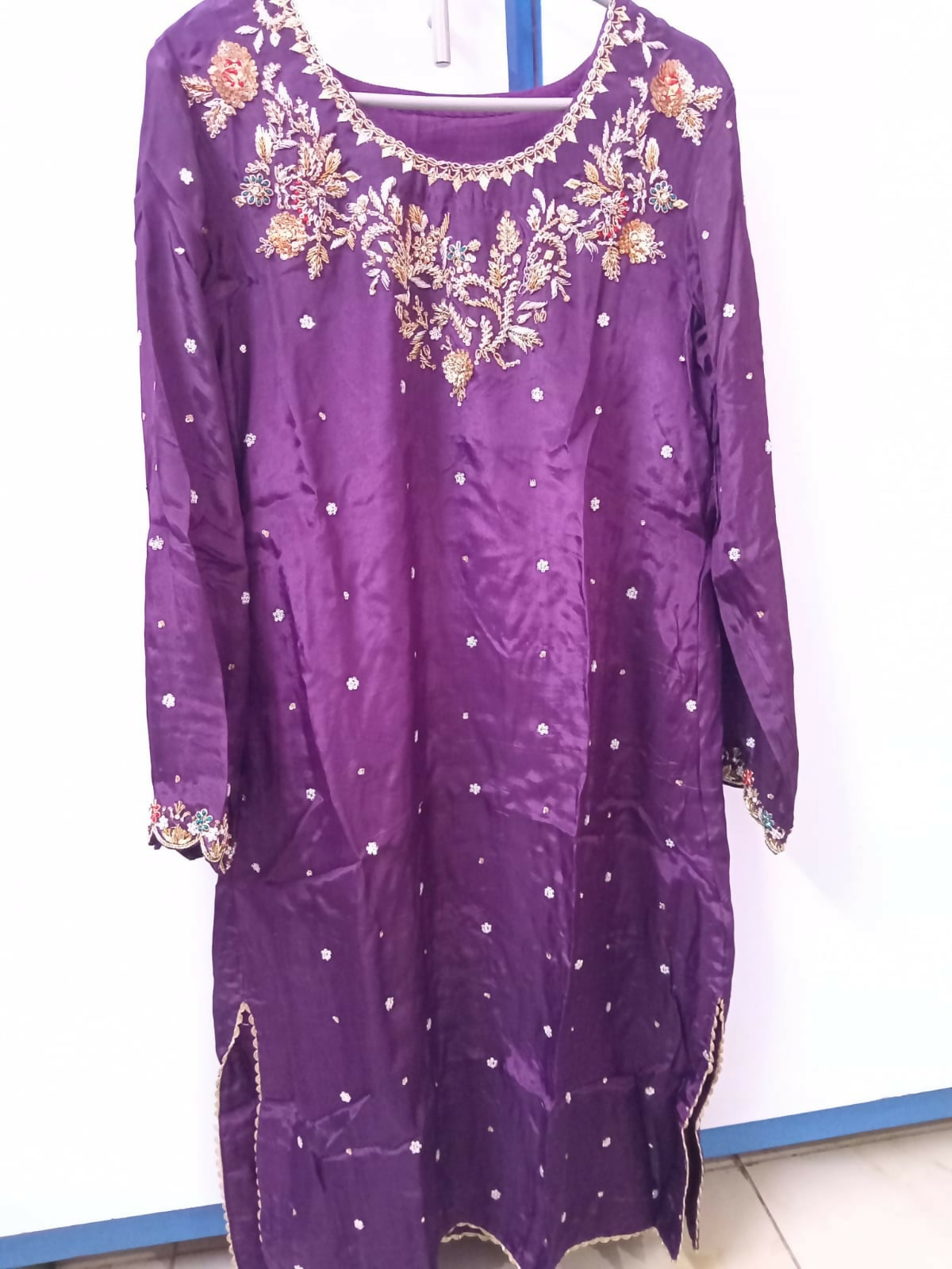 Shirt: Golden hand embroidered shirt with beautiful colors finished and golden laces on daman and sleeves