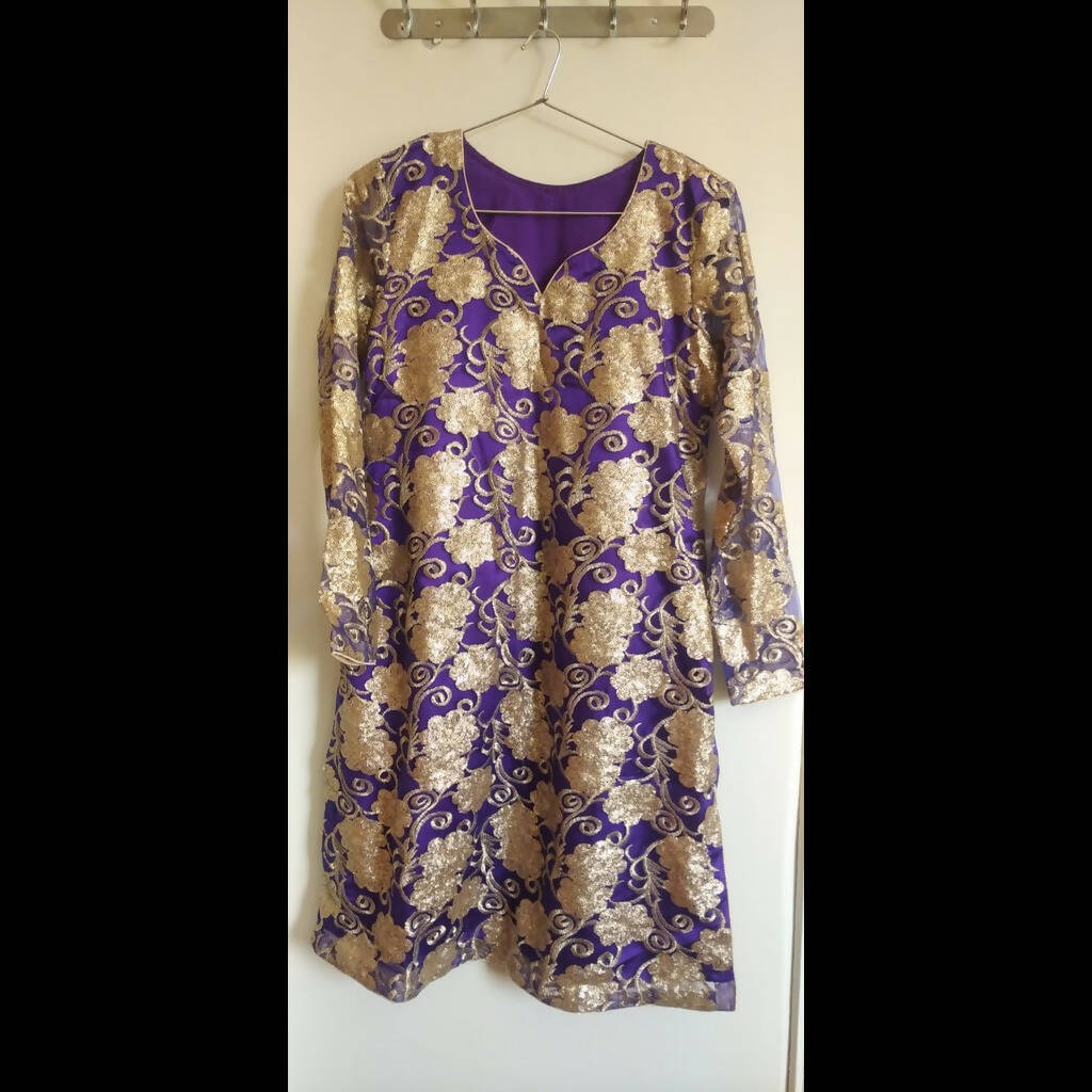 | MATERIAL & MEASUREMENT | Purple purple net shirt with golden thread and sequins work silk undershirt attached silk trousers net dupatta with four side sequin lace Shirt length 39 shoulder 14.5 chest 21 waist 18 hip 23 daman 25 sleeves 22 Trousers straight fit length 40 thigh 13 paencha 7 |