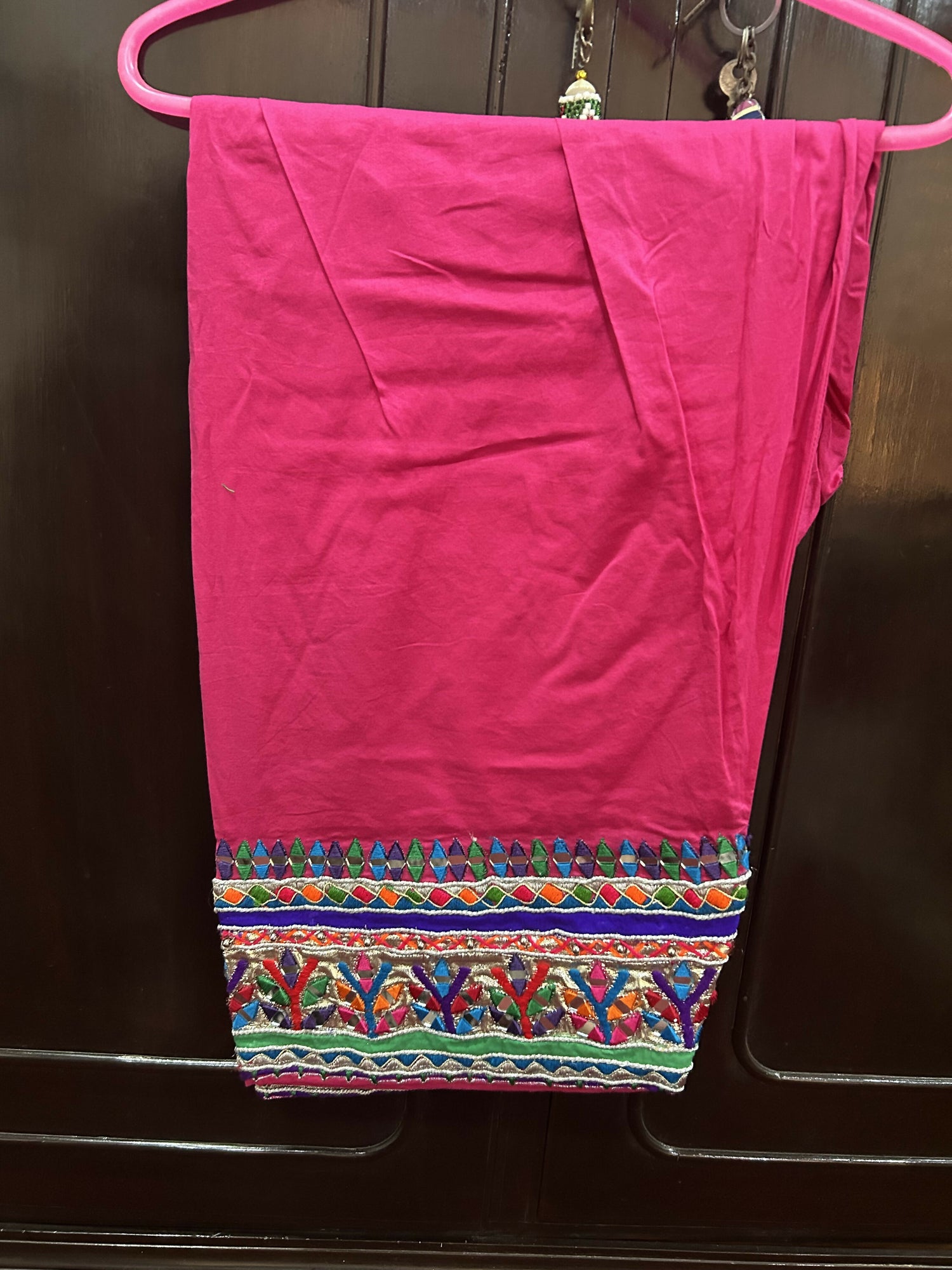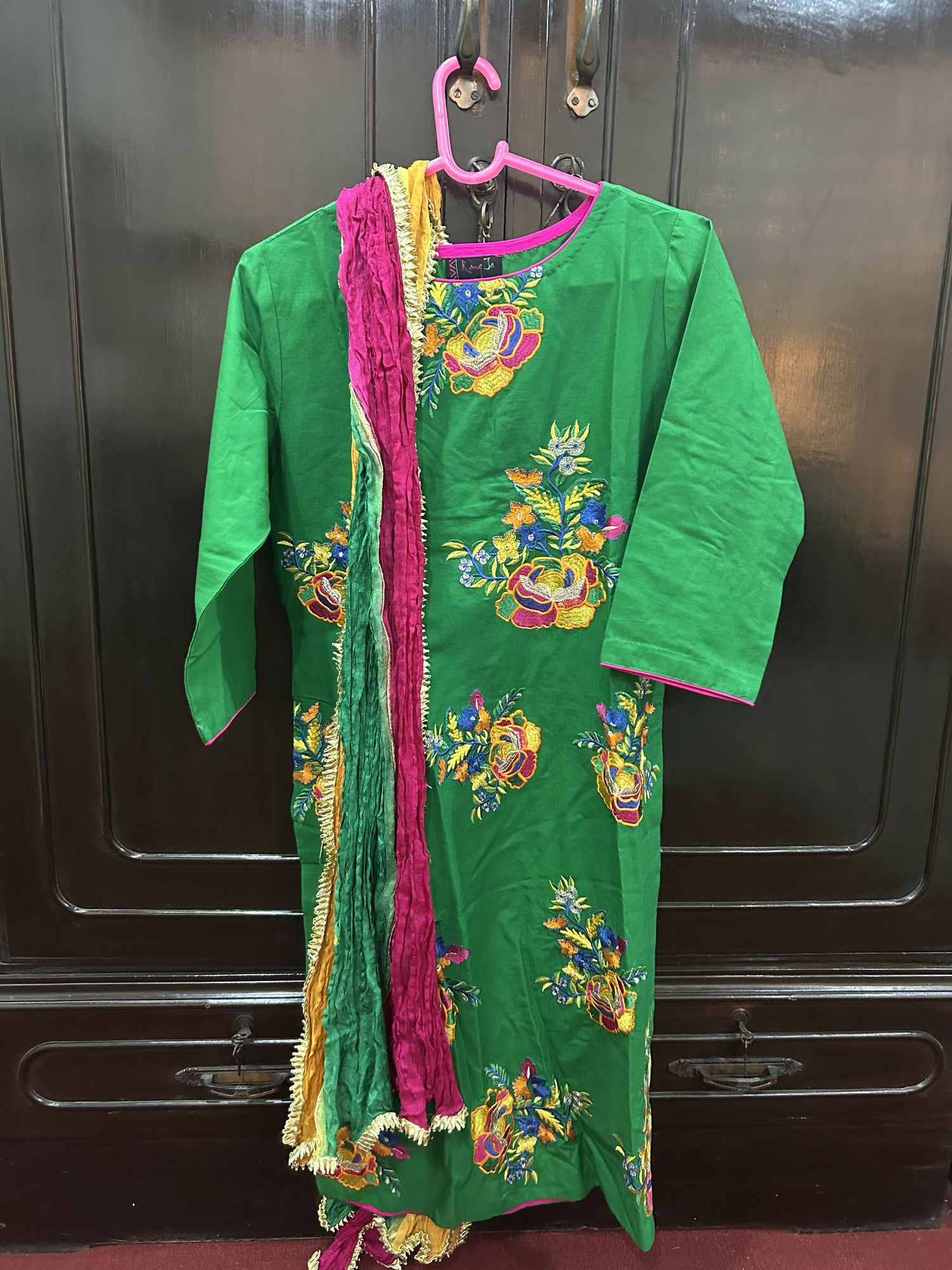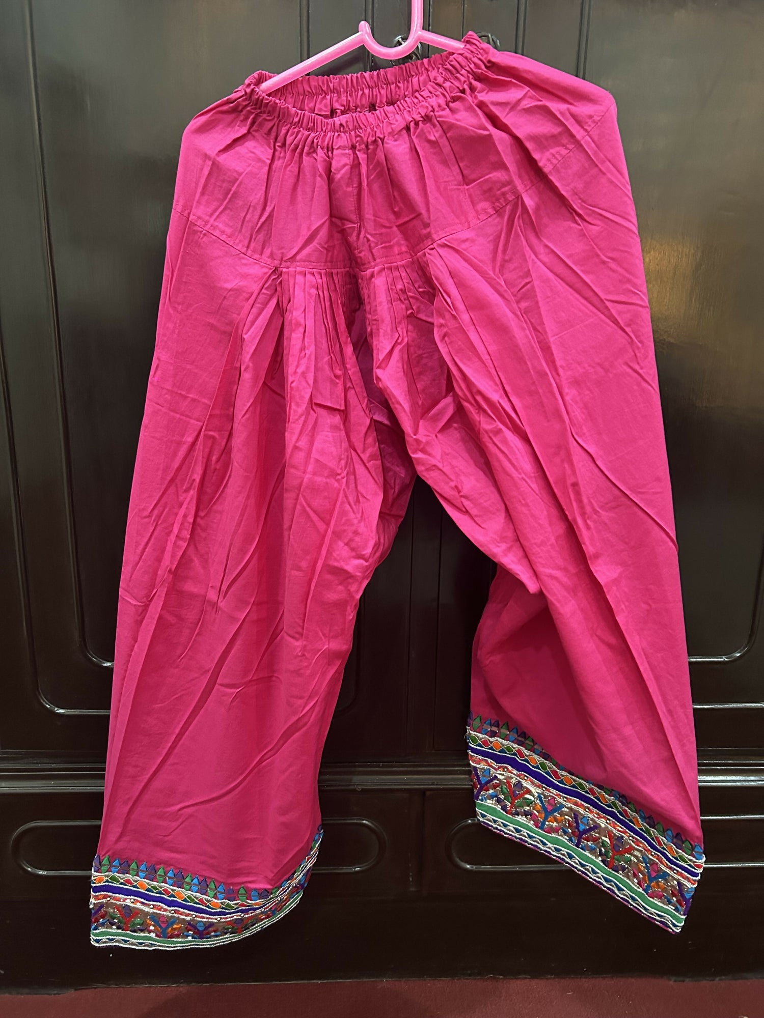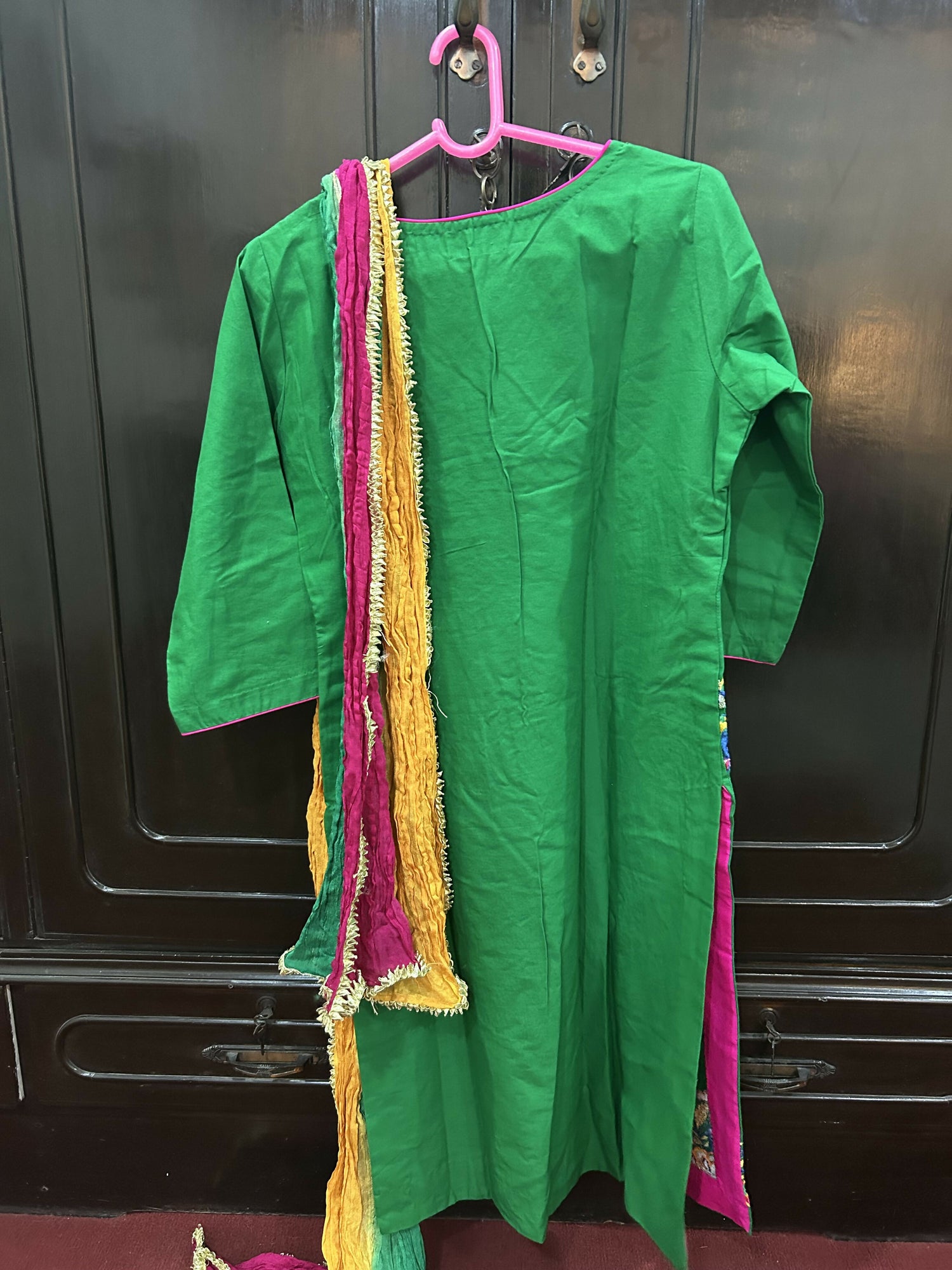 | MATERIAL & MEASUREMENT | Cotton Size medium Shirt length 38 inches Shoulder 14 inches Sleeves 16 inches Chest 17 inches Shirt ghera 21 inches Farshi shalwar Small size Length 36 inches |