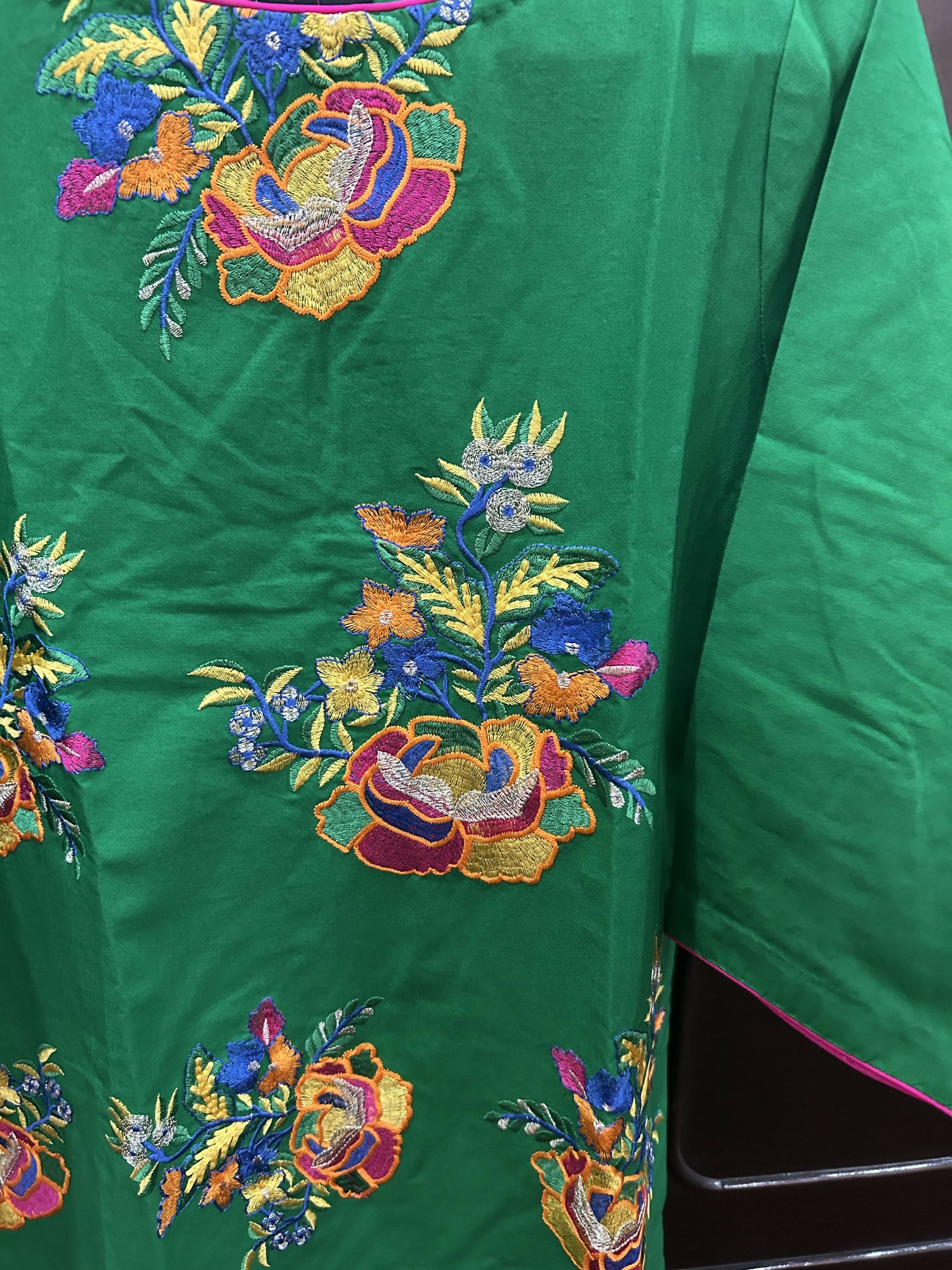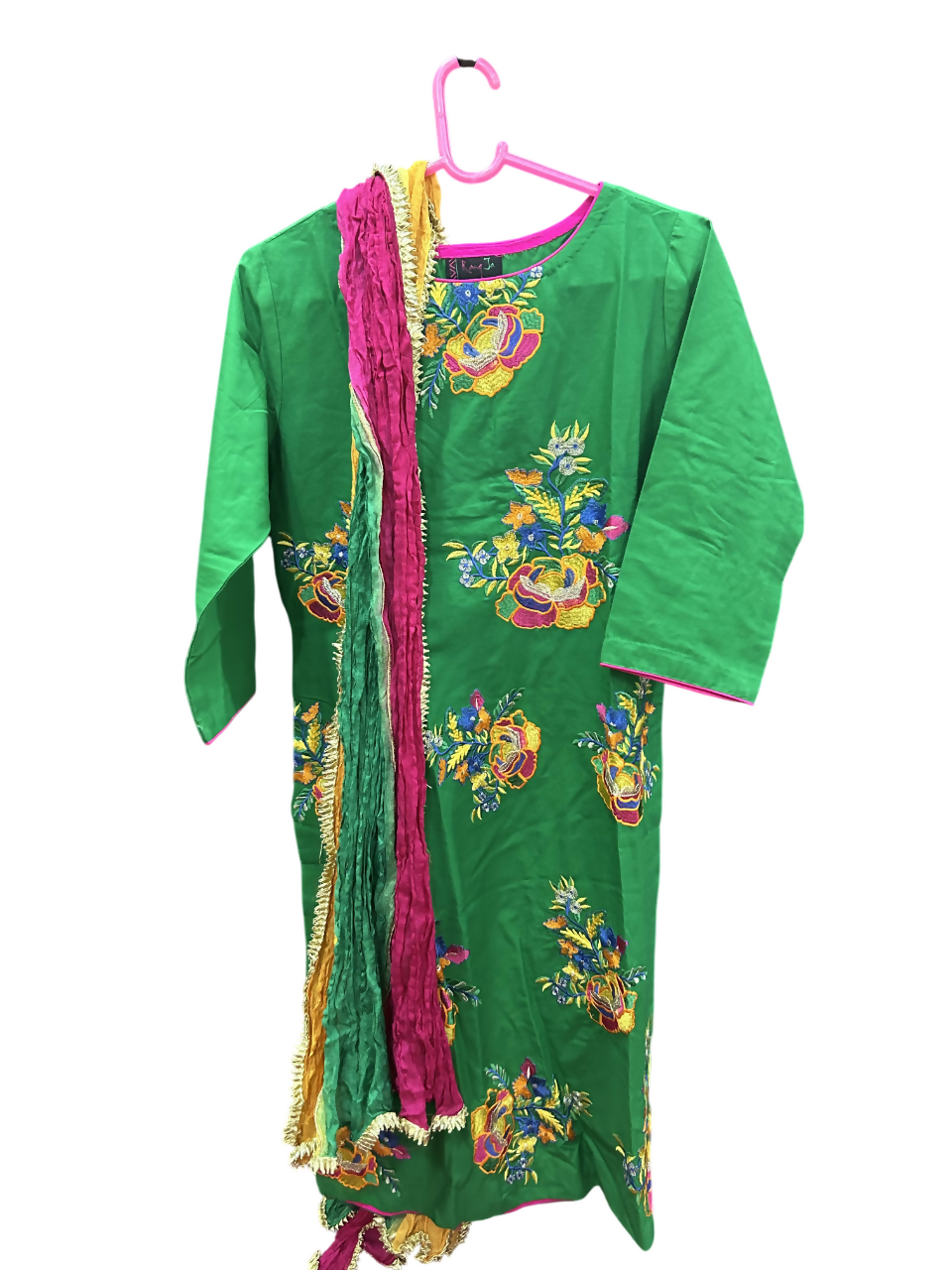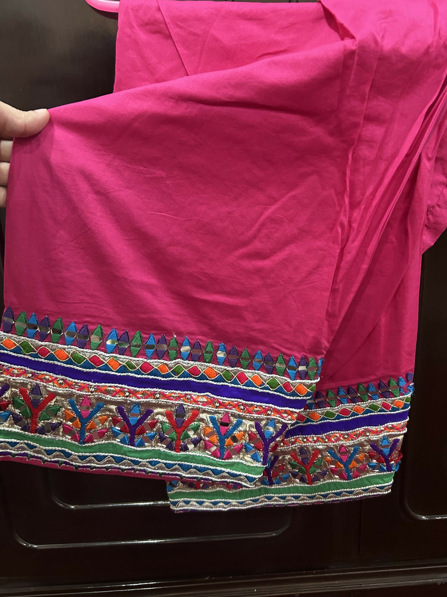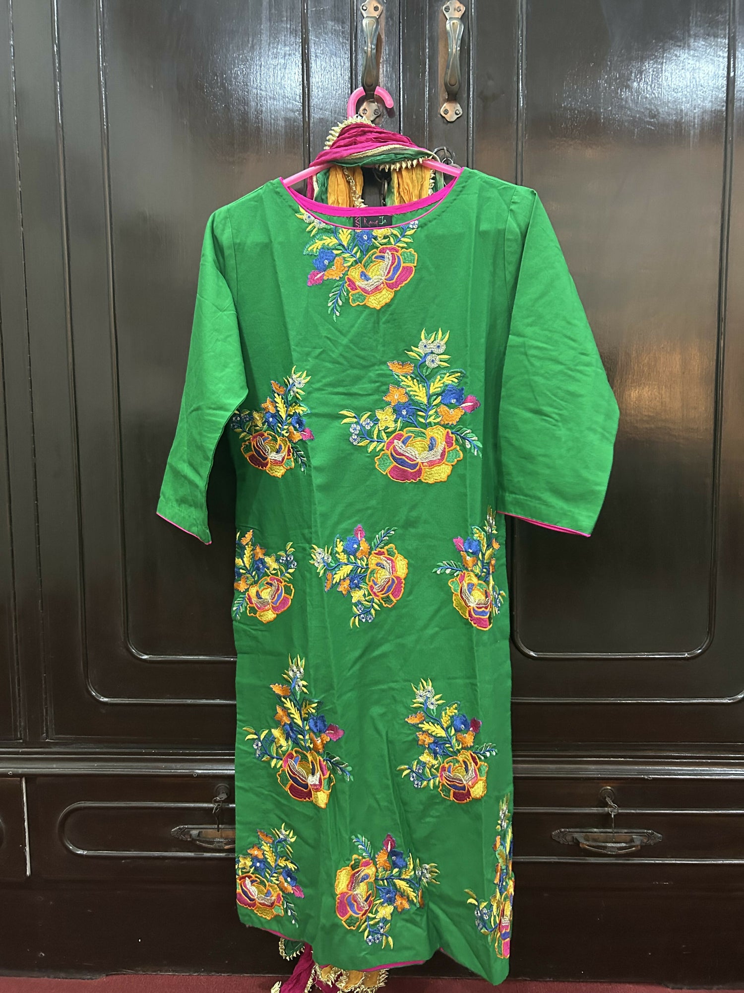 | MATERIAL & MEASUREMENT | Cotton Size medium Shirt length 38 inches Shoulder 14 inches Sleeves 16 inches Chest 17 inches Shirt ghera 21 inches Farshi shalwar Small size Length 36 inches |