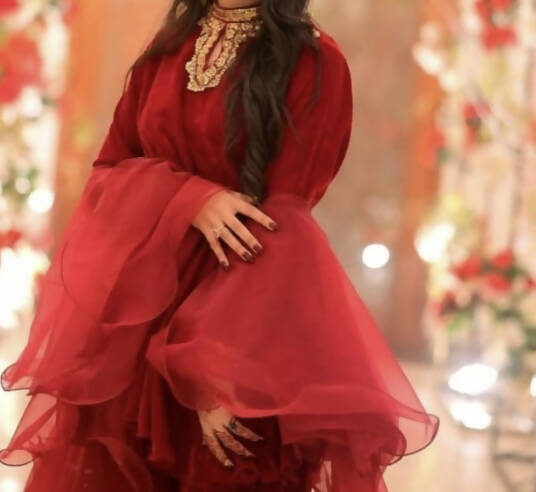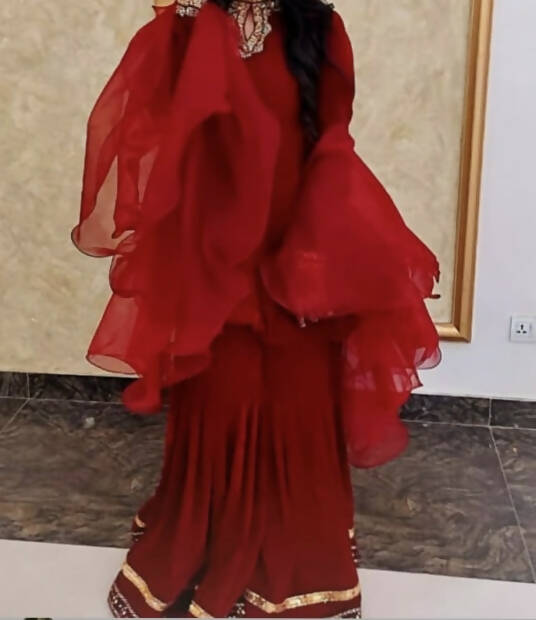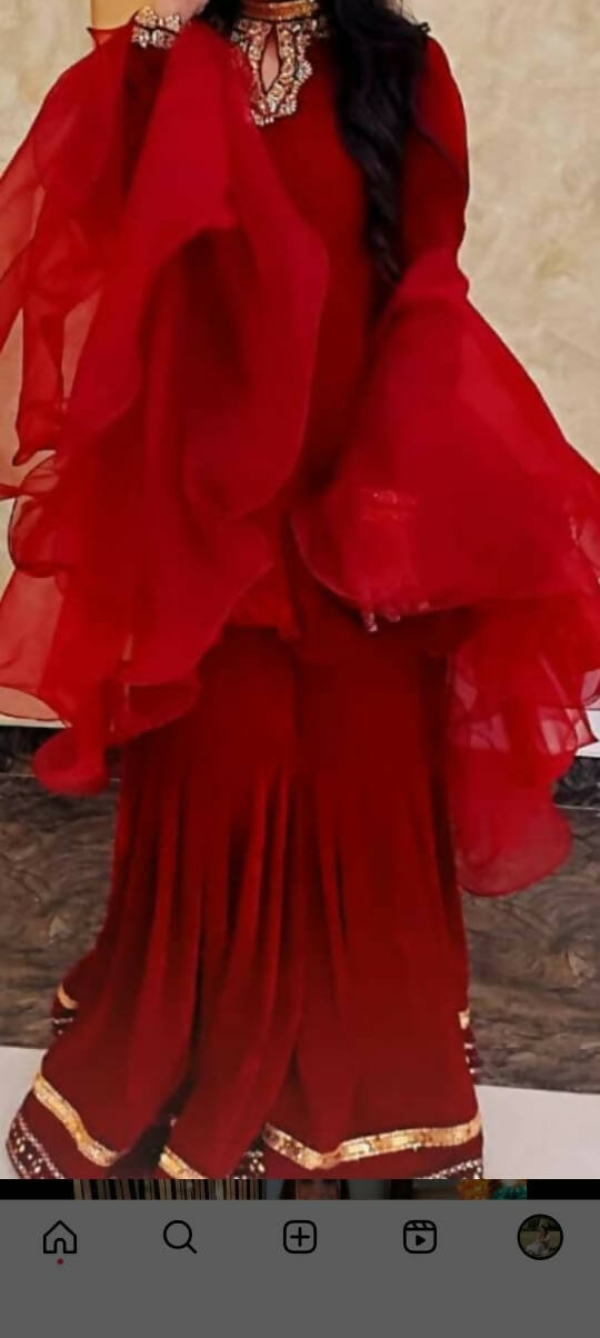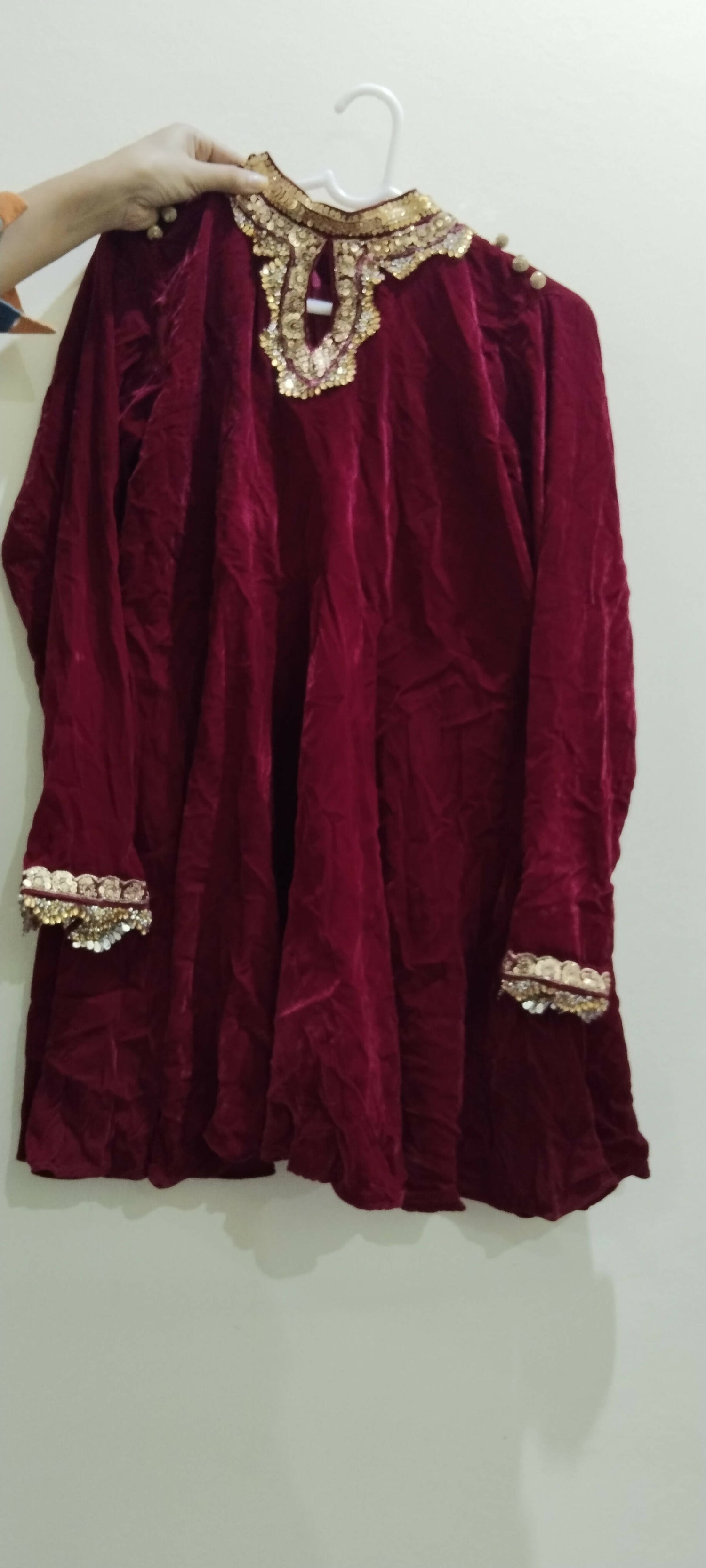| MATERIAL & MEASUREMENT | Material.: Velvet Measurements: Organza duppata Chest.21 inches Length.34 inches Shoulder.14 inches Trouser length. 38-40 |