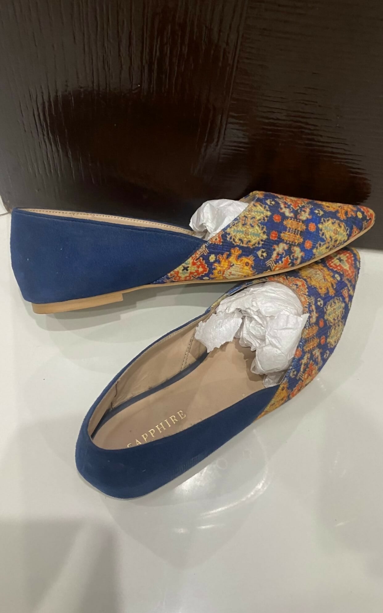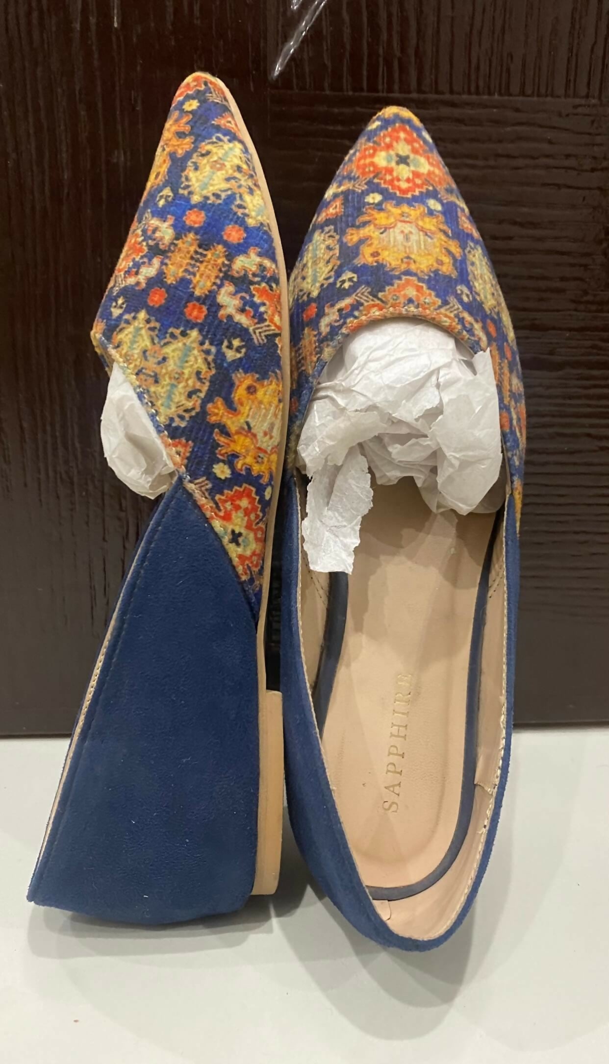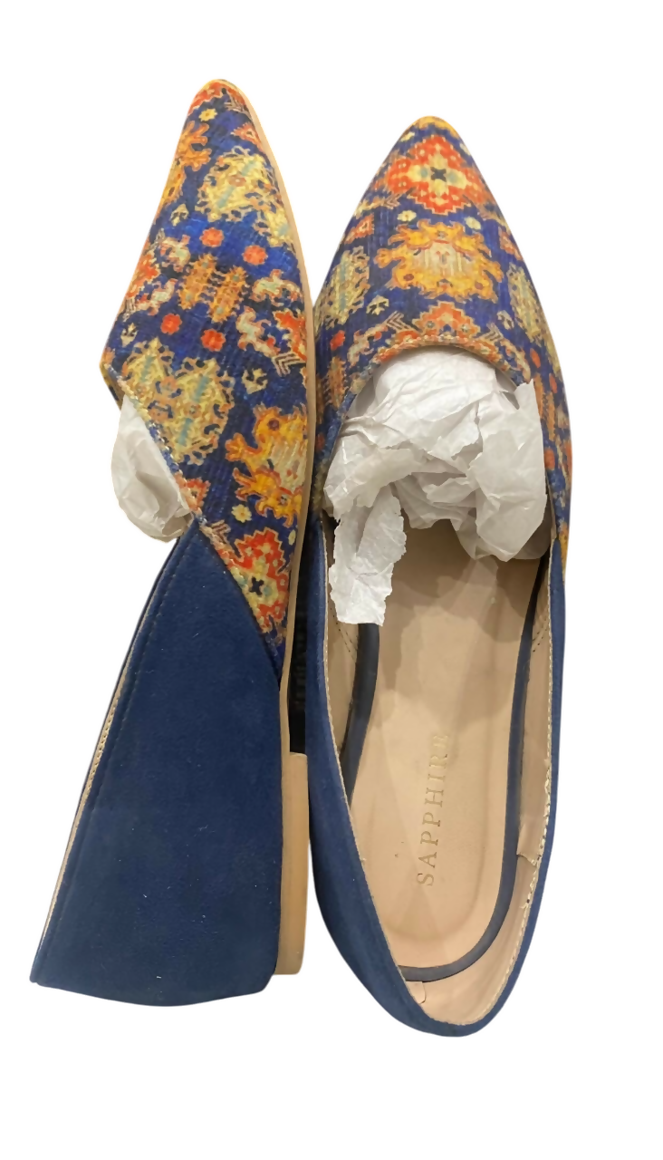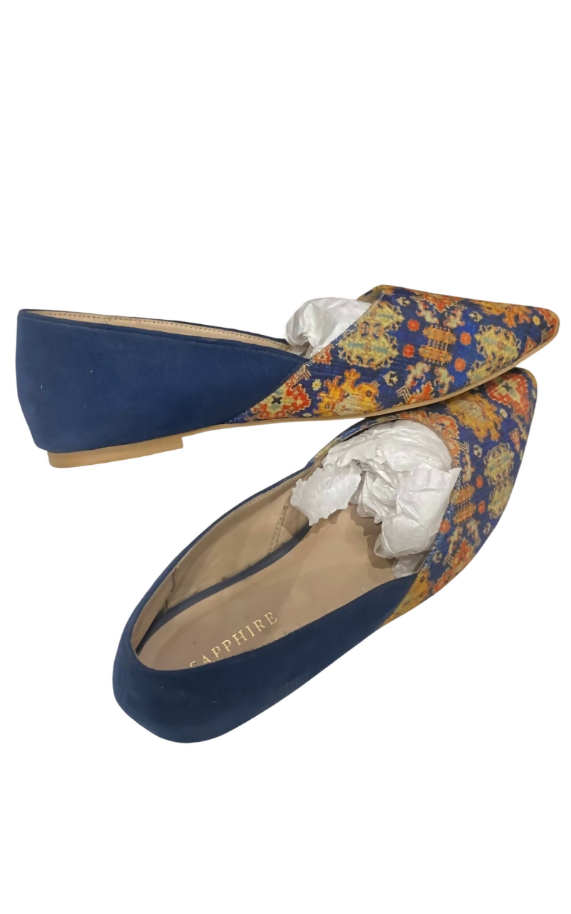 Elegant Sapphire ethnic flats featuring a vibrant multicolor fabric design combined with blue faux suede accents. Perfect for casual outings, semi-formal events, or pairing with ethnic attire.