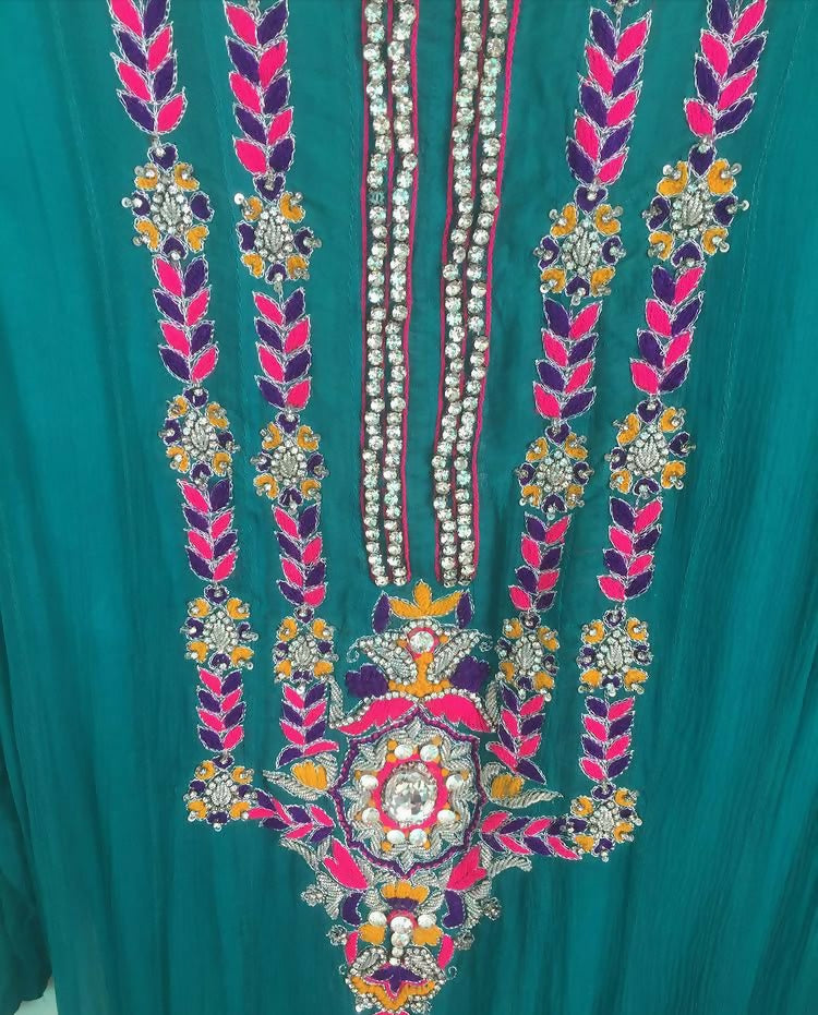 | MATERIAL & MEASUREMENT | Size: Large Fabric: Chiffon Full length 50 sleeves 22 chest 19 waist 22 hips 23 shoulder 16 Trouser length 40 |