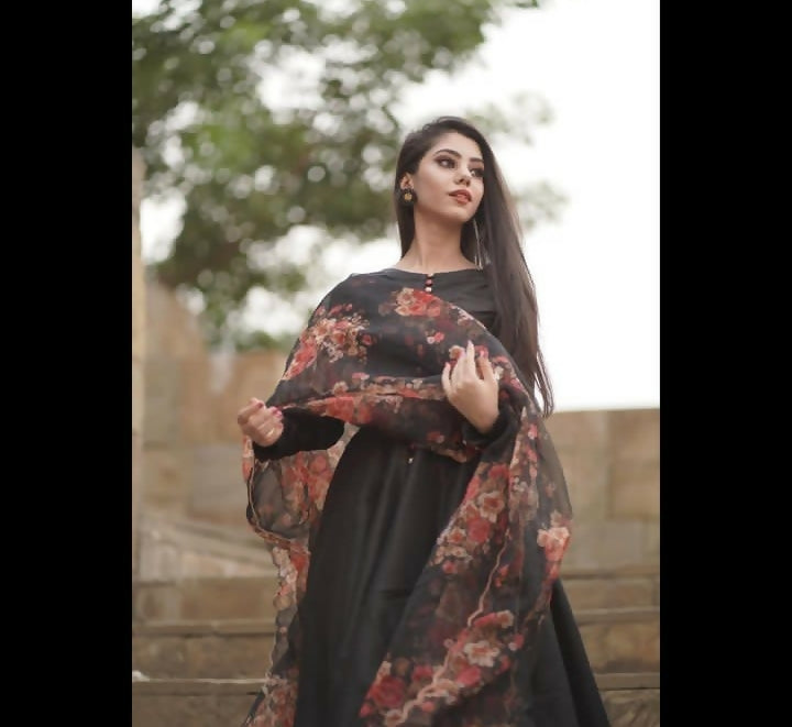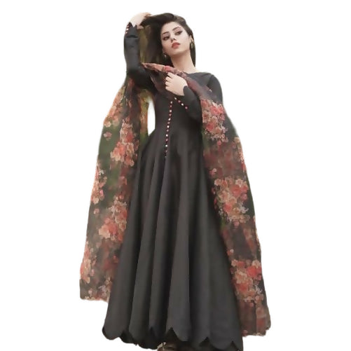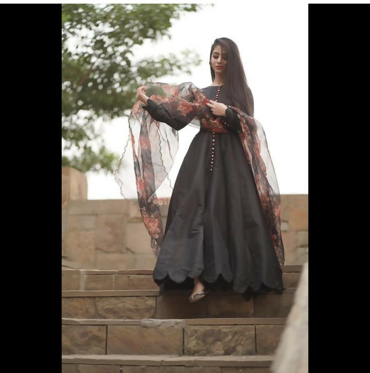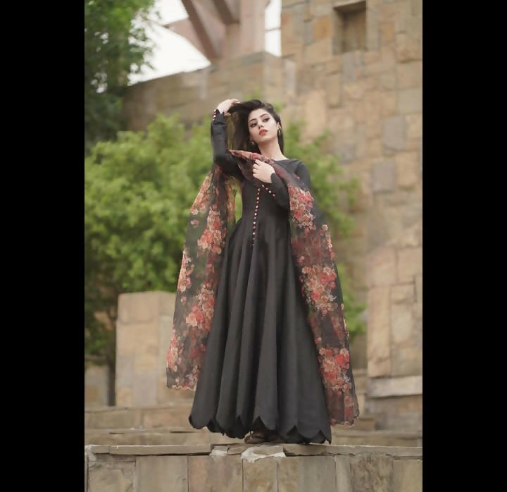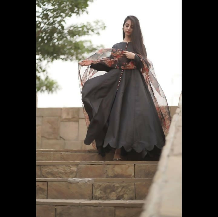This elegant black maxi exudes simplicity and charm with its clean, minimalist design. The flowy, full-length silhouette creates a graceful, modest look. The focal point of the ensemble is the stunning organza dupatta, which is adorned with a vibrant floral pattern in warm tones of red and orange, adding a touch of sophistication and contrast to the otherwise monochromatic outfit. The scalloped hem at the bottom of the maxi adds a subtle decorative detail, while the delicate row of buttons down the bodice enhances the outfit's refined, classic appeal. This dress is perfect for those who appreciate understated elegance with a hint of color.Extra Information