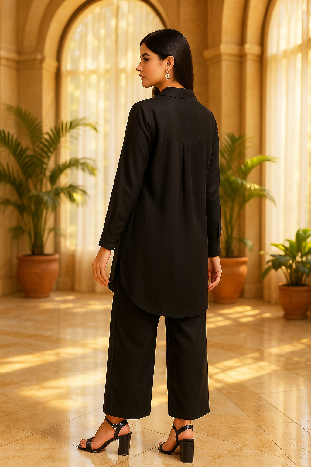 Introducing our timeless black cotton co-ord set featuring a straight shirt and tailored trousers – the perfect fusion of grace and ease. 🌿