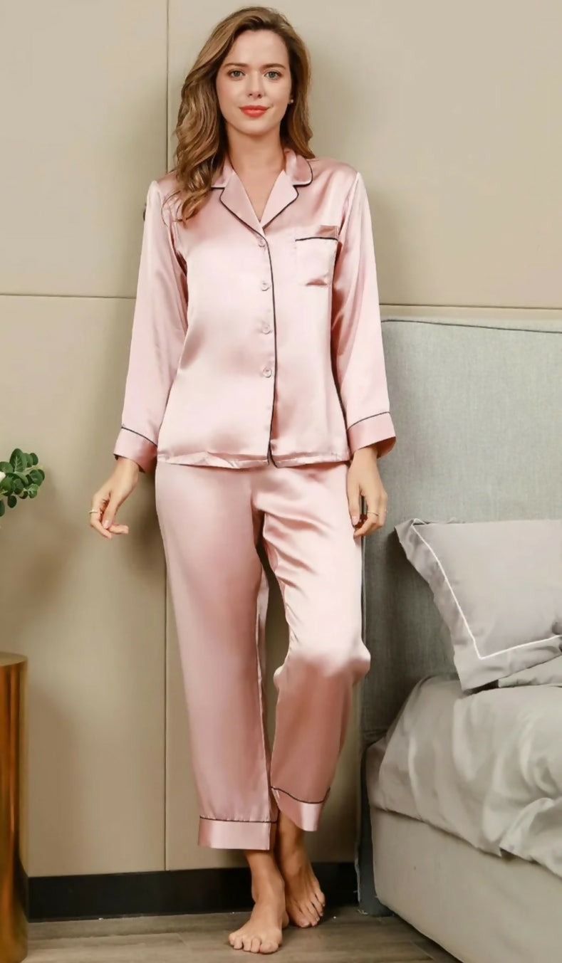 Silk PJ sets | Women Loungewear & Sleepwear | Size: All | Brand New - Pink with black piping / small is backordered and will ship as soon as it is back in stock.