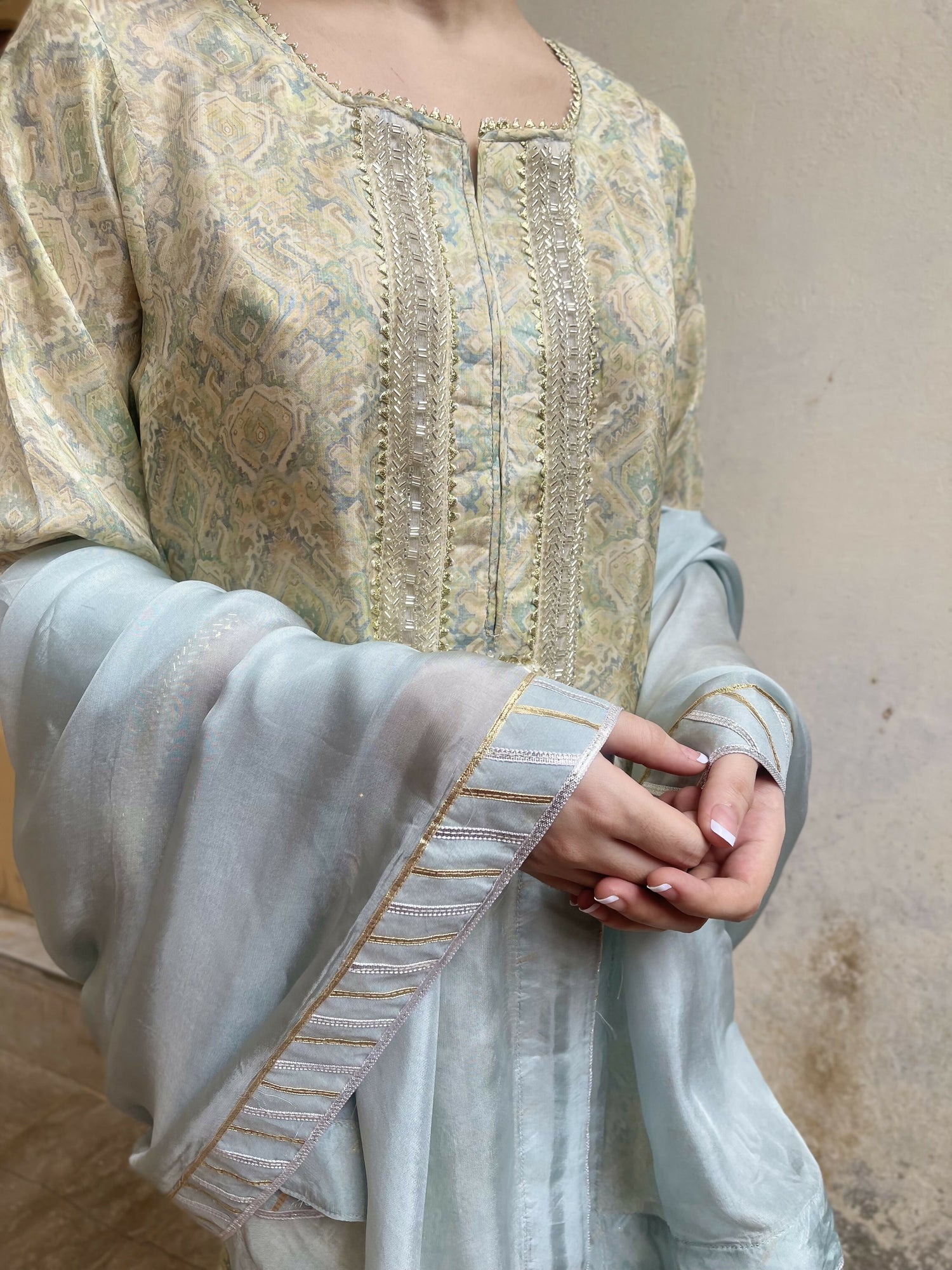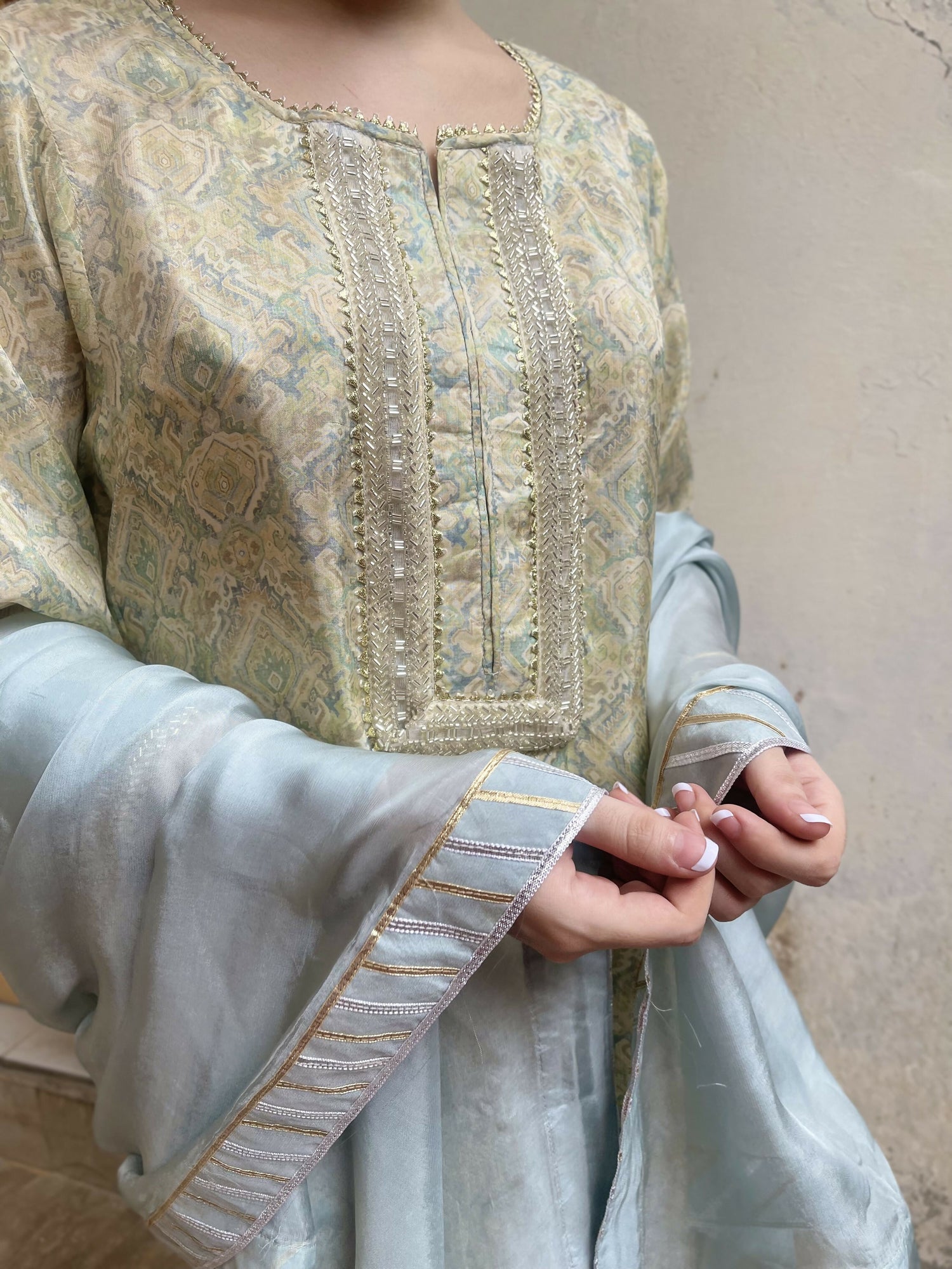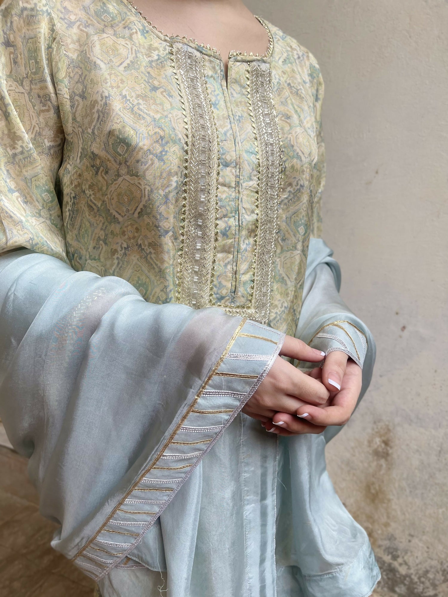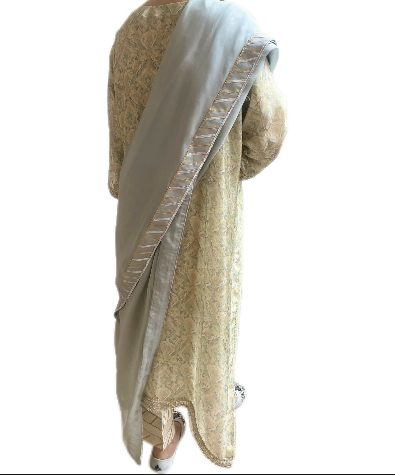 | MATERIAL & MEASUREMENT | Fabric: Silk stitched with lace detailing Measurement : Shoulder 14 Chest 20 Hip 21 Trouser 36 |