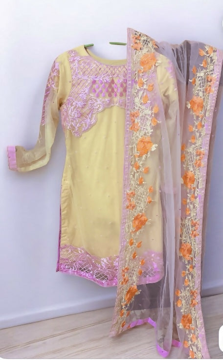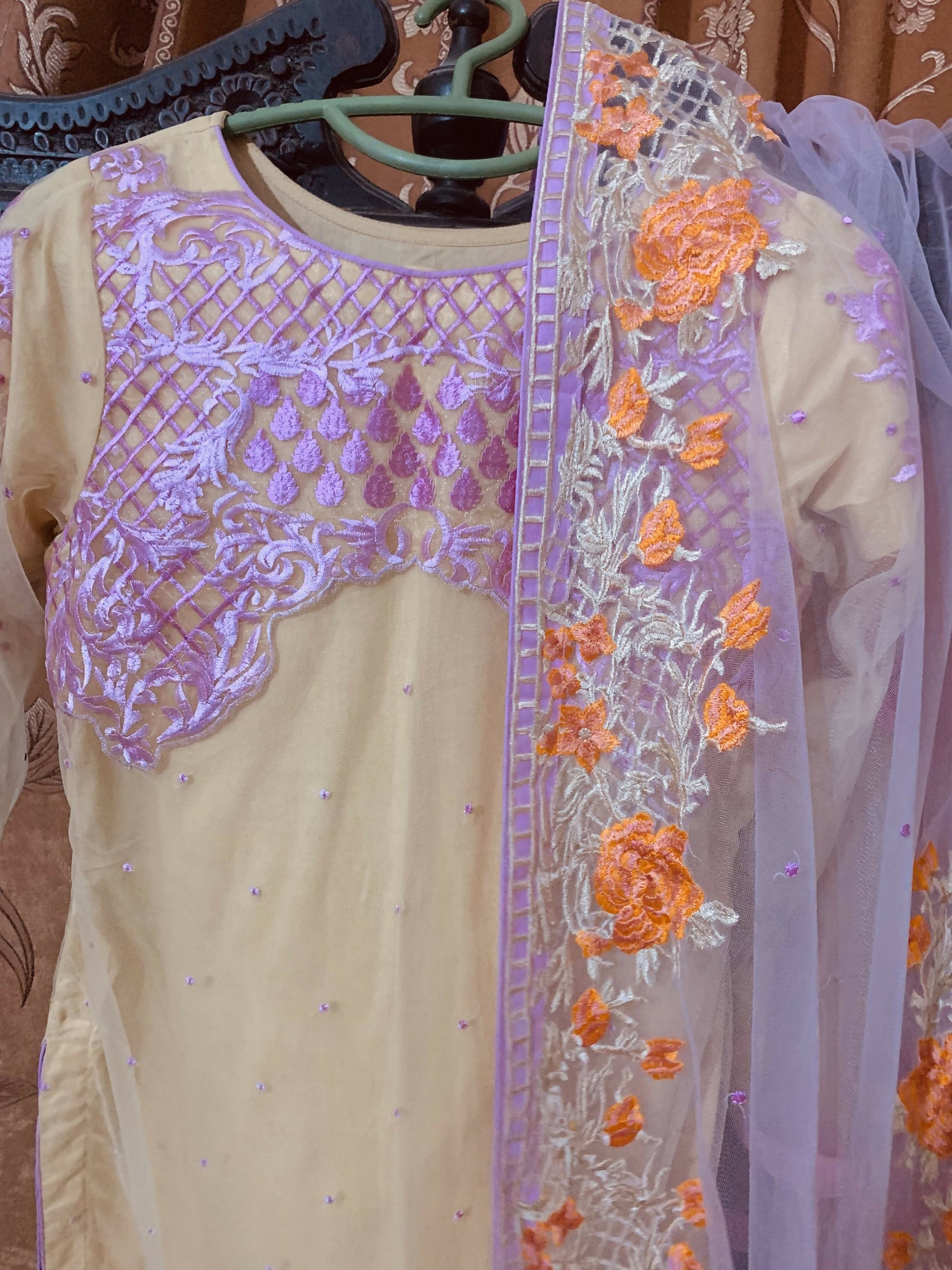 | MATERIAL & MEASUREMENT | Material :Net Embroidered shirt Net embroidered dupatta plain trouser Measurement : Bust: 20 Hips:23 Length:39 |